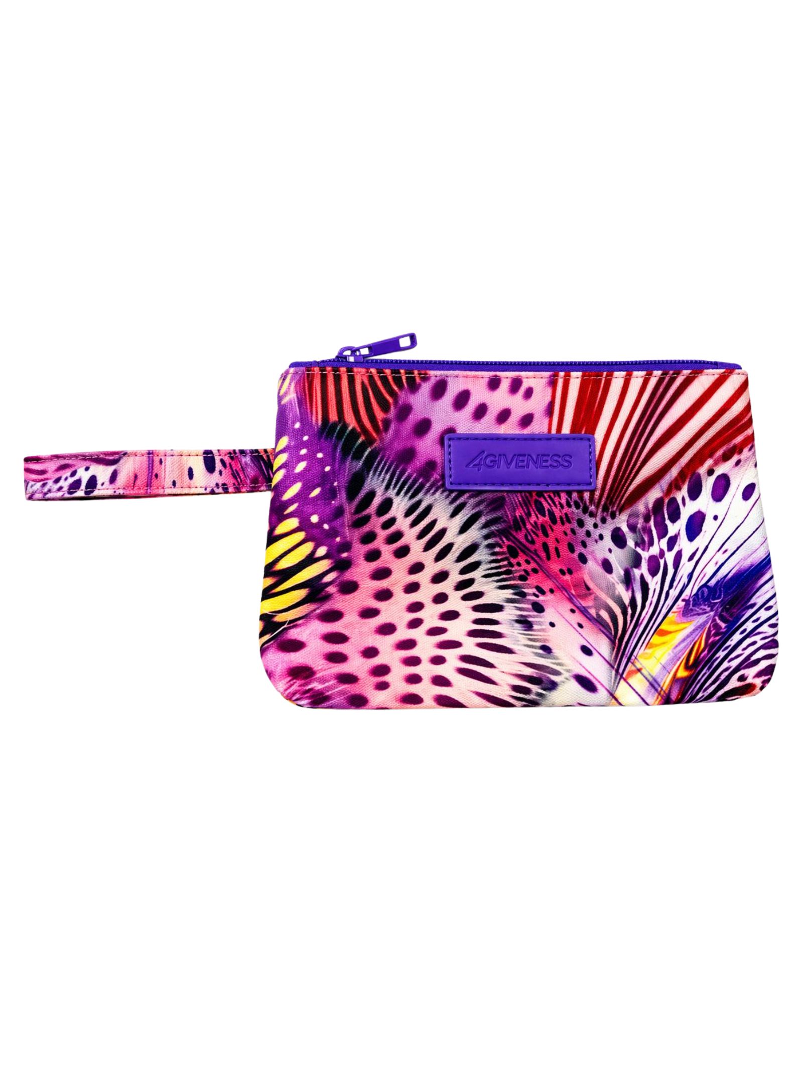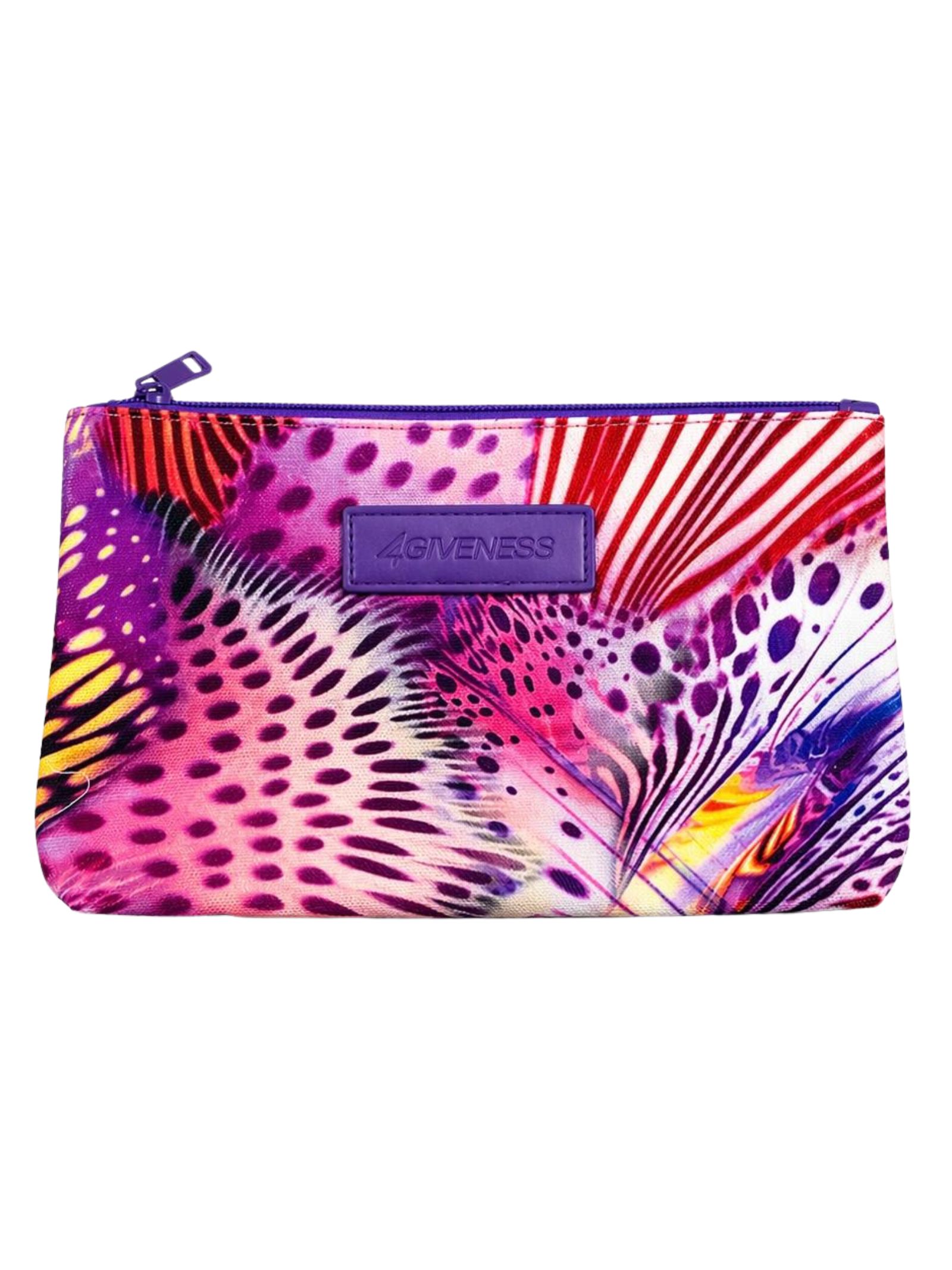 4GIVENESS Kids purple/multicolor clutch with iconic brand prints, side wristlet, single zip compartment, and engraved logo patch. Dimensions: 24cm x 16cm. Composition: 100% polyester. Print may vary.