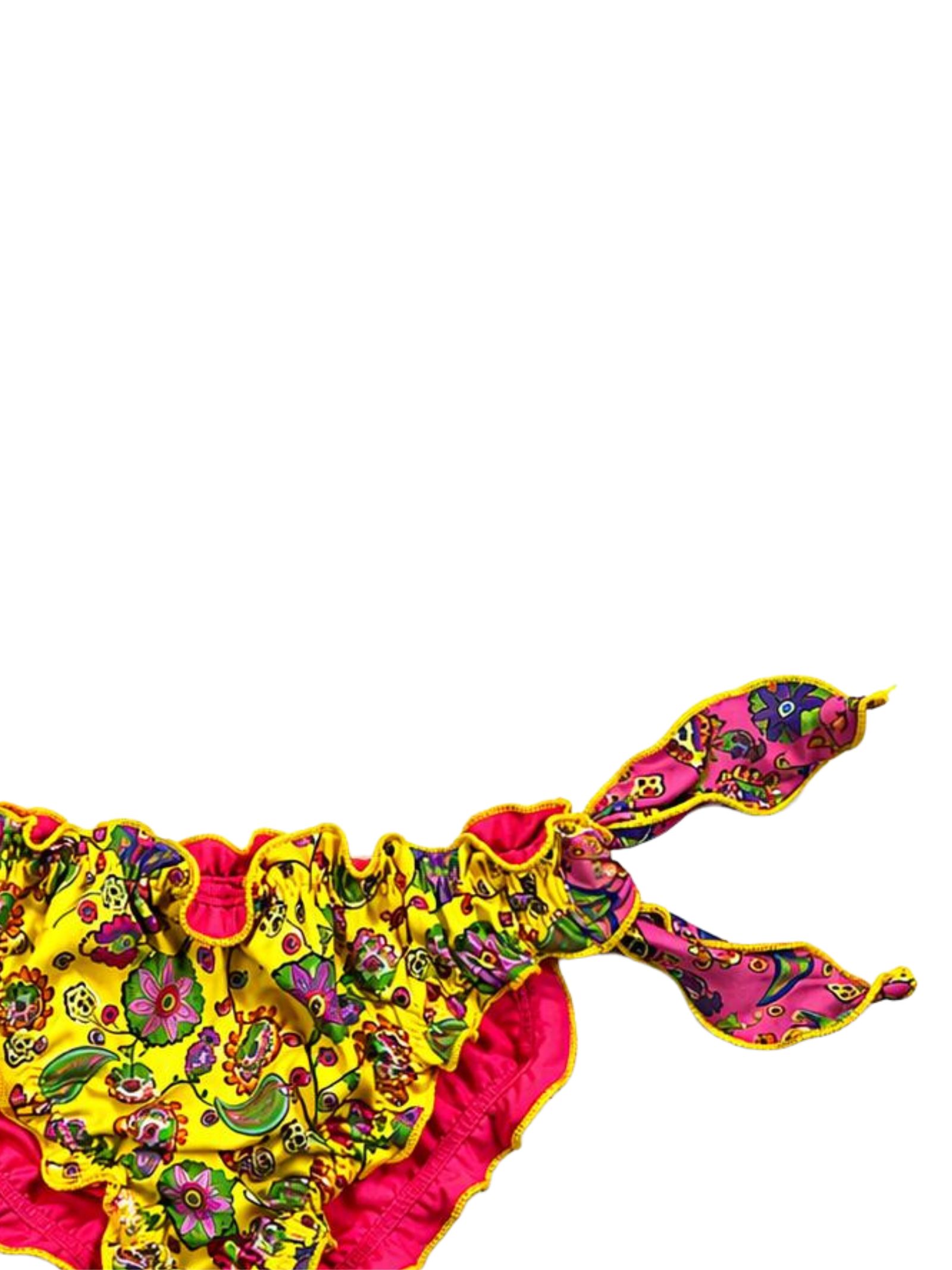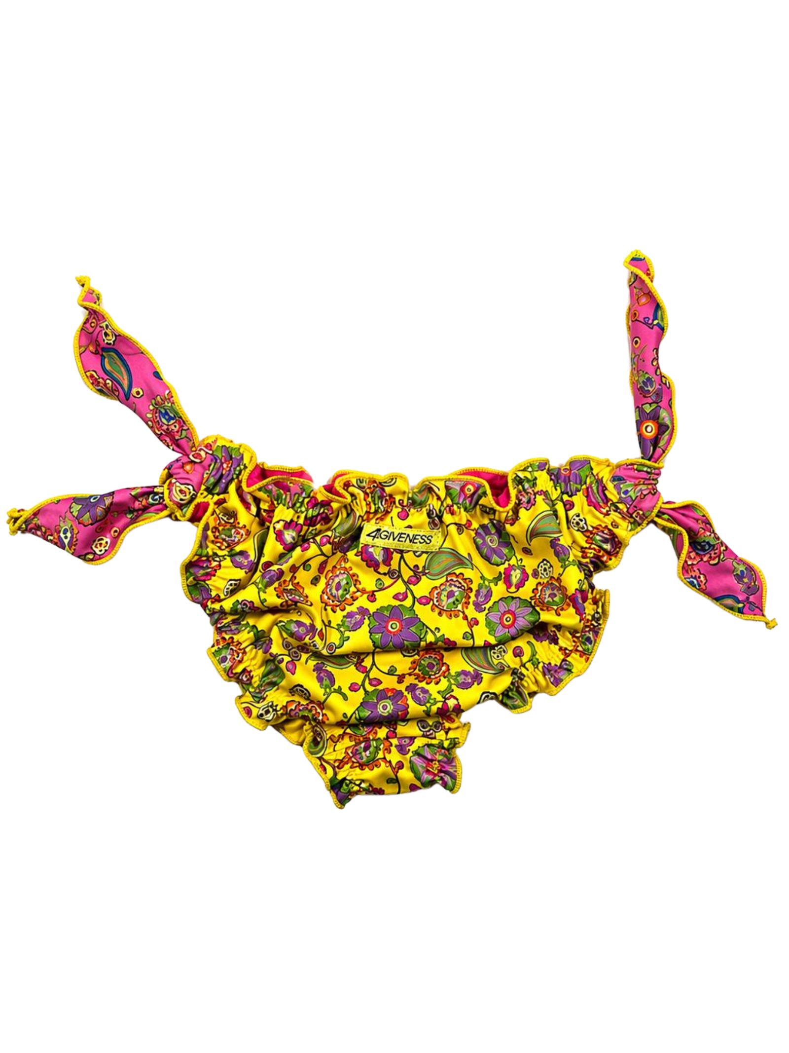 4GIVENESS Kids yellow/fuchsia brief swimsuit with iconic multicolor brand prints, side bow design, gathered hem detail, logo patch on the back. Composition: 82% polyester 18% elastane