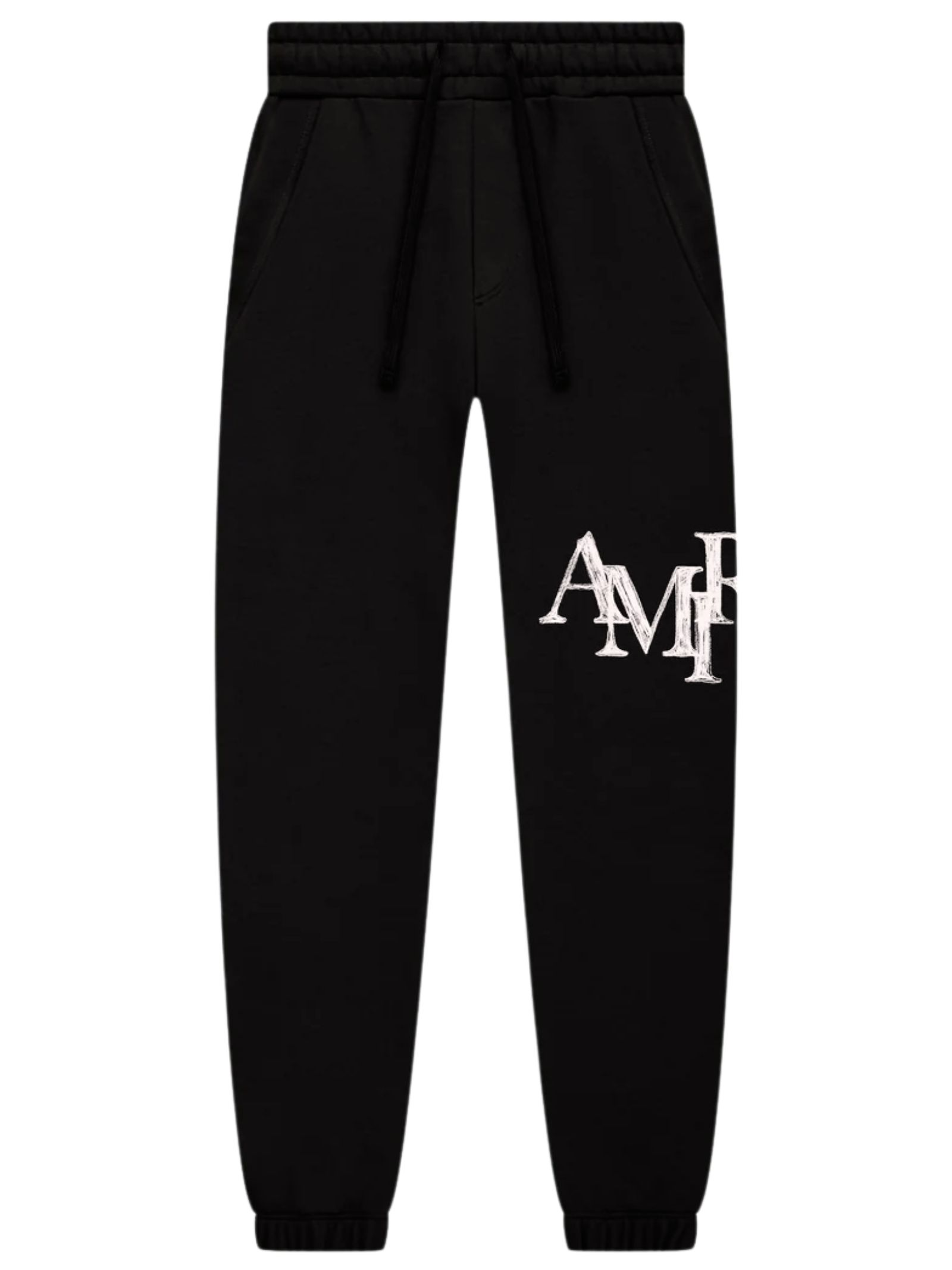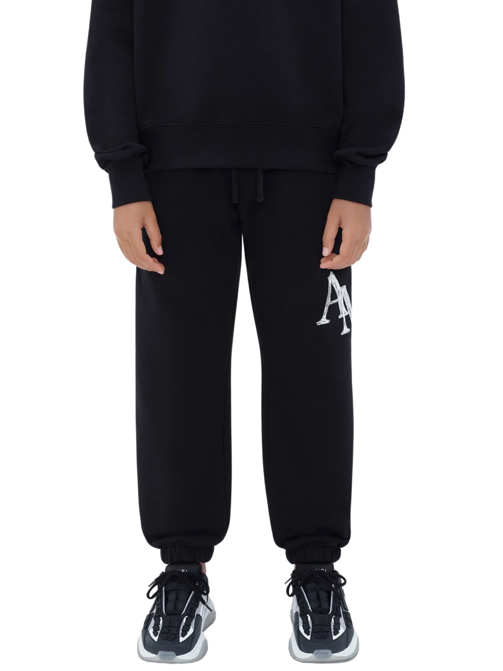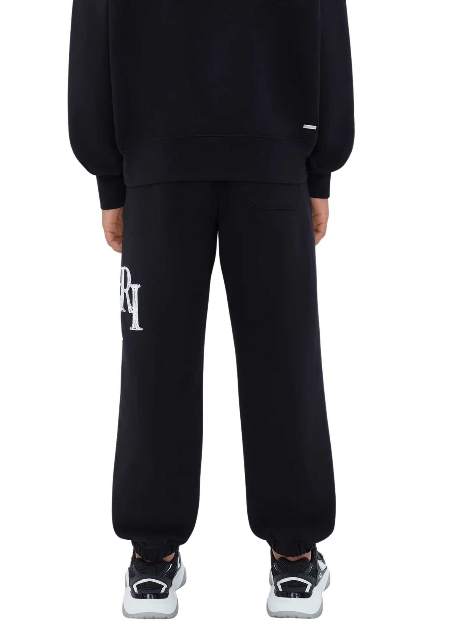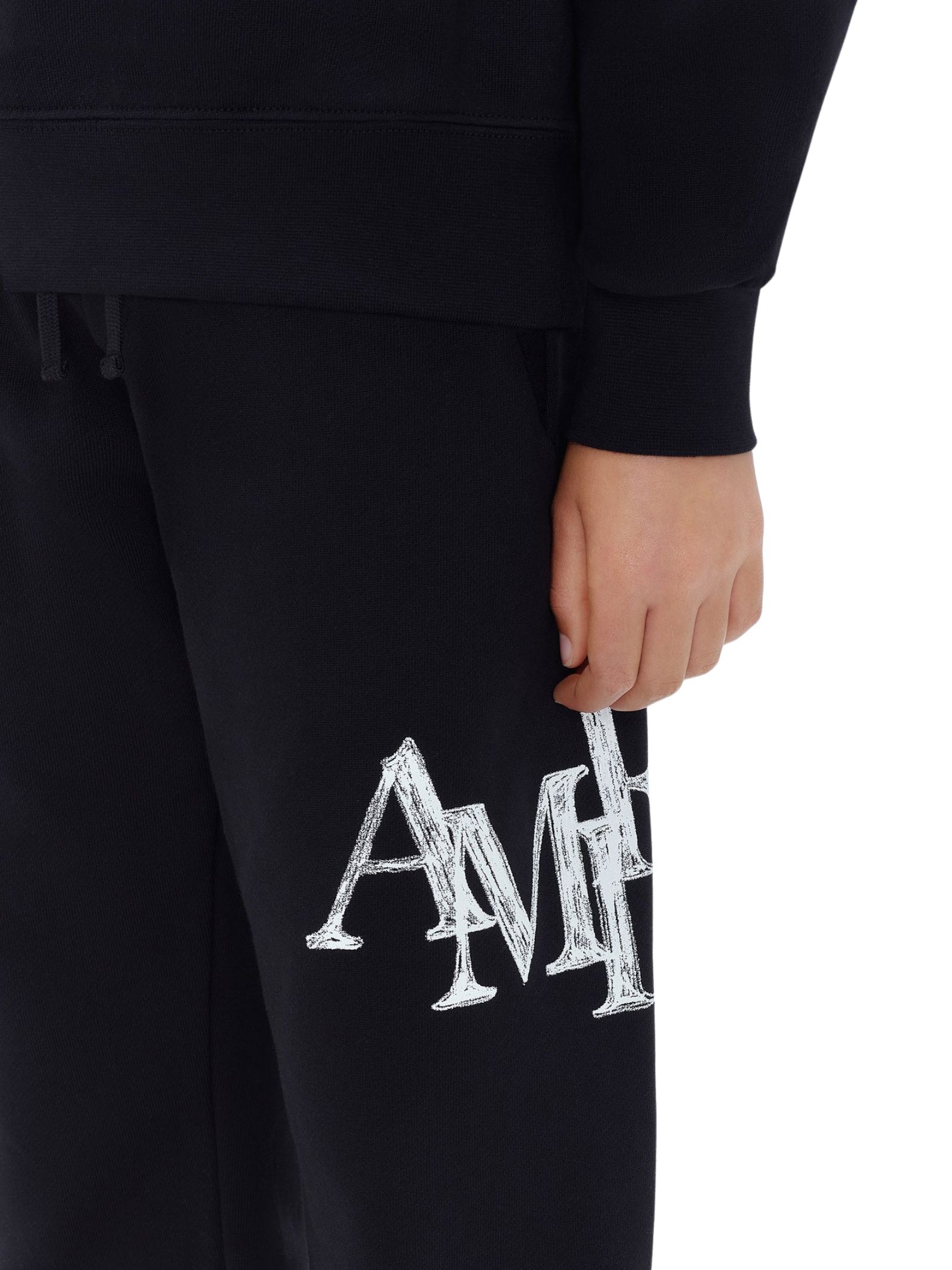 AMIRI Kids black tracksuit bottoms with an elasticated drawstring waist, a contrasting white logo print on the side, two side pockets, one back pocket, elasticated cuffs, and a logo patch on the back. Regular fit. 100% cotton. Made in Italy.