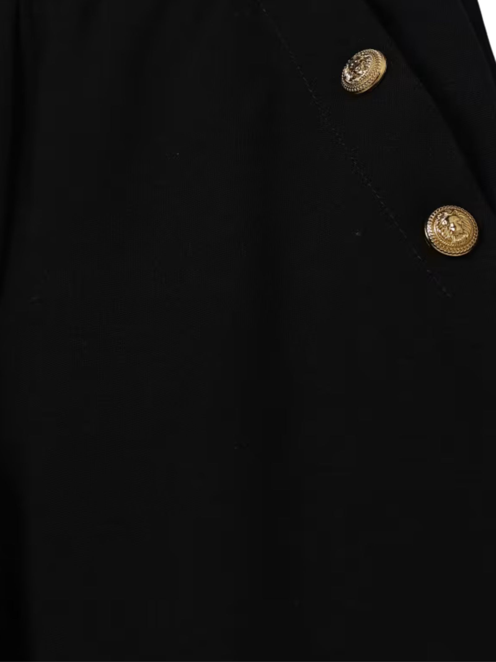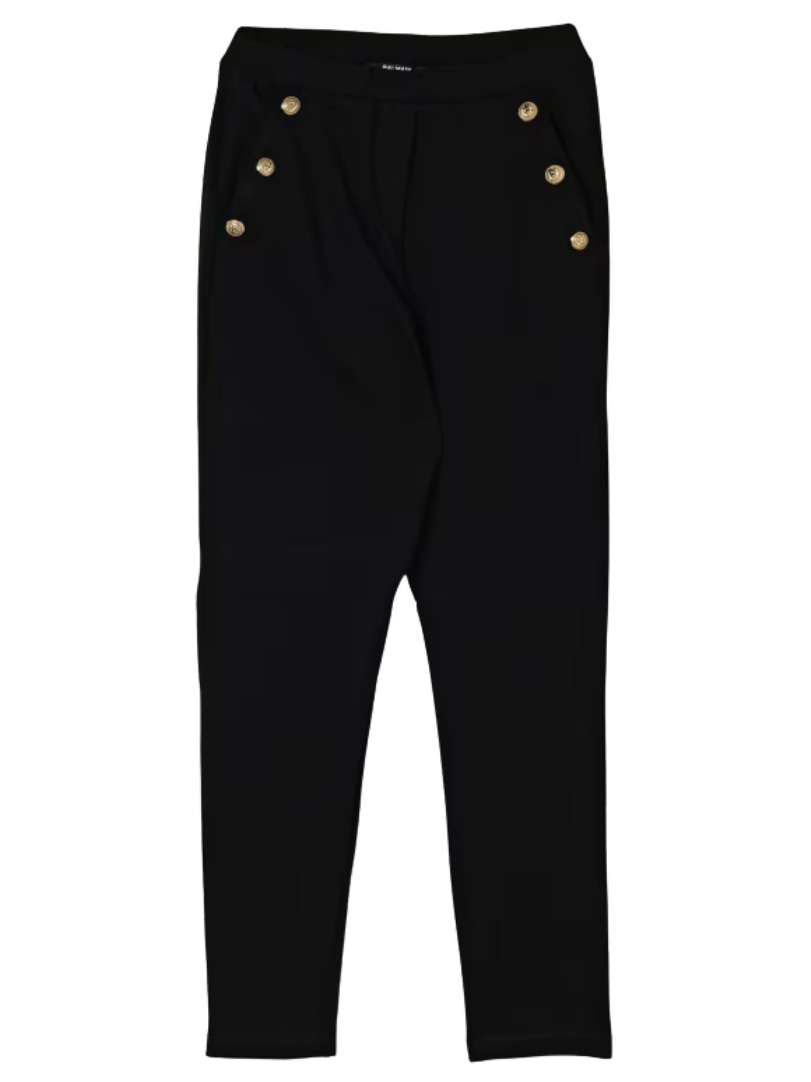 Balmain Kids black trousers, classic fit, high waist, two side welt pockets, decorated with gold-tone buttons featuring the brand's signature lion's head. Composition: 100% virgin wool