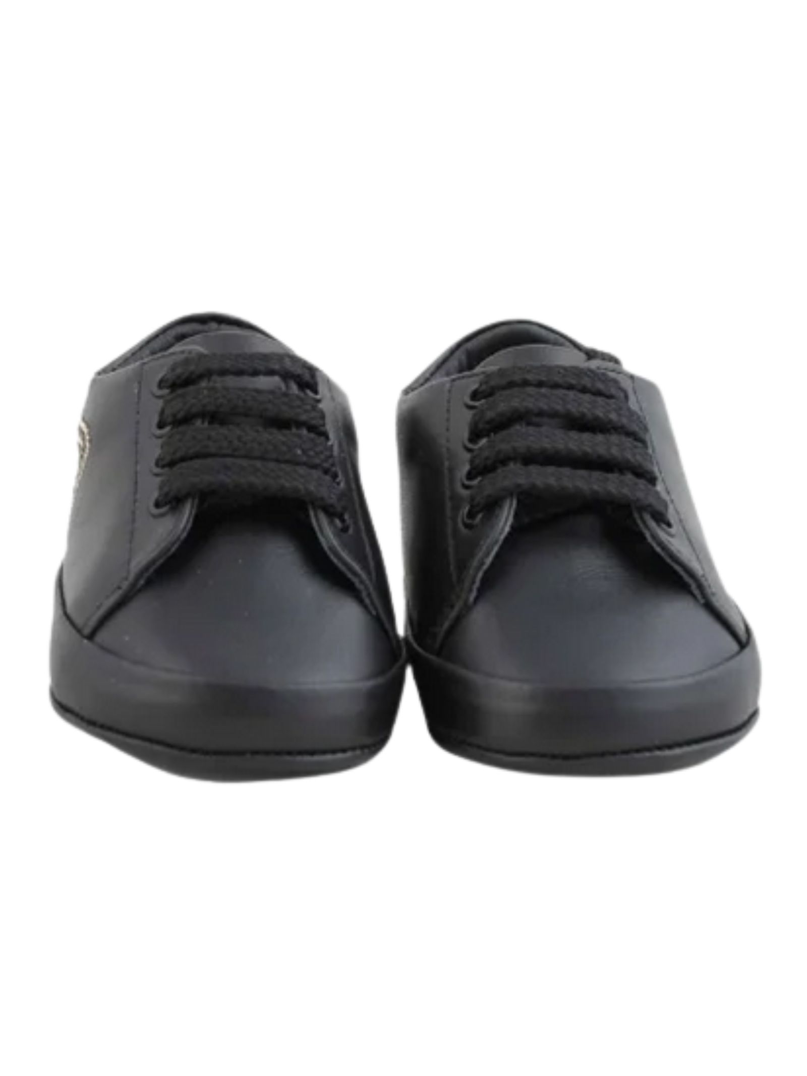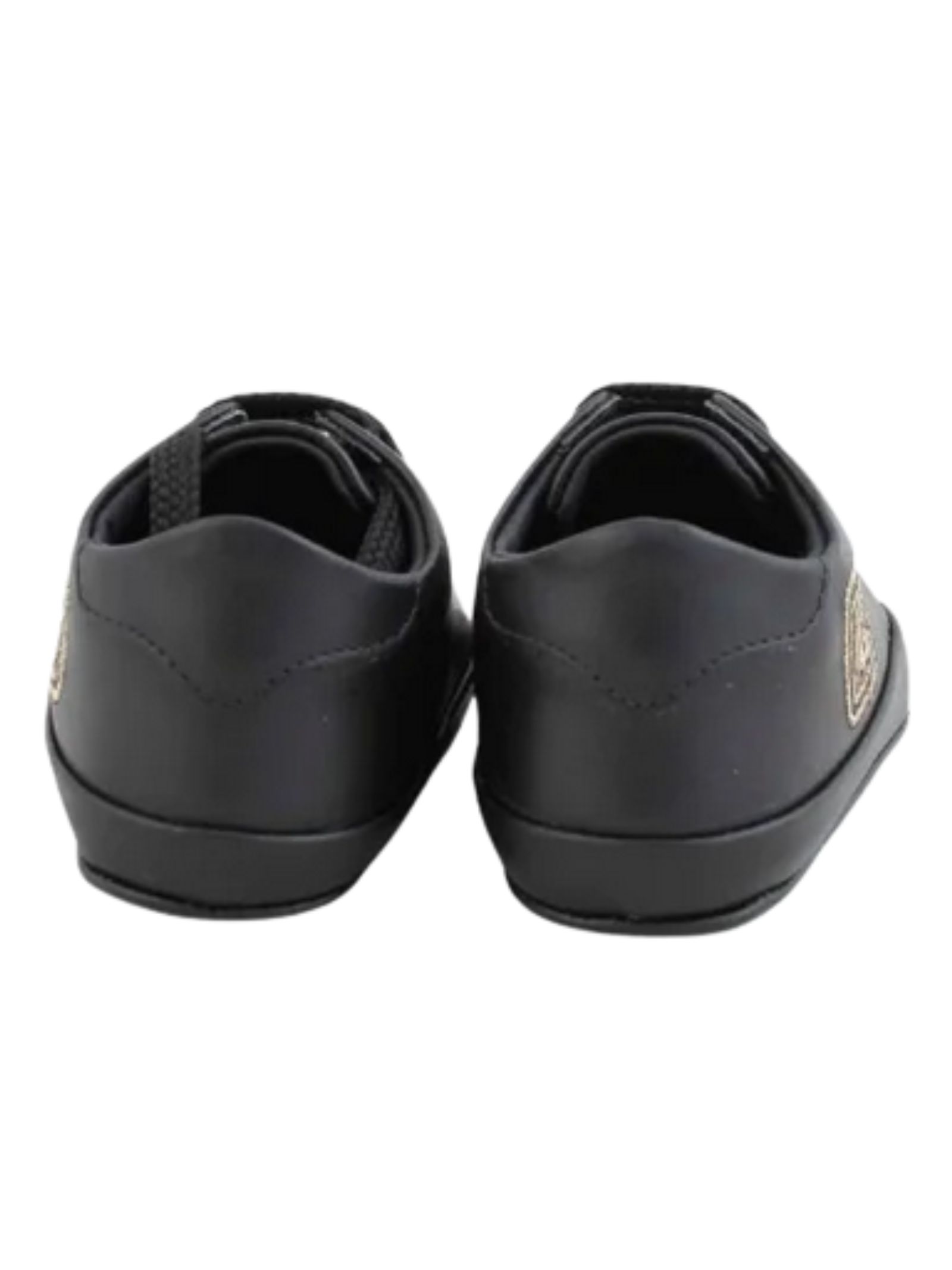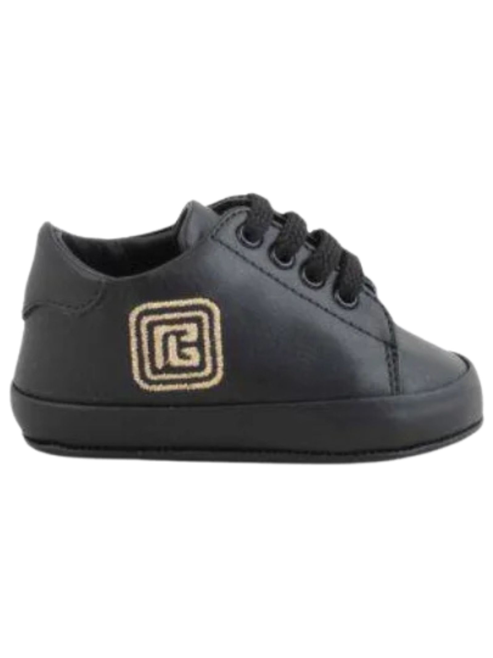 Balmain Kids black pre-walker shoes with contrasting gold details, smooth leather, round toe, lace-up closure, and embossed logo. Made in Italy.