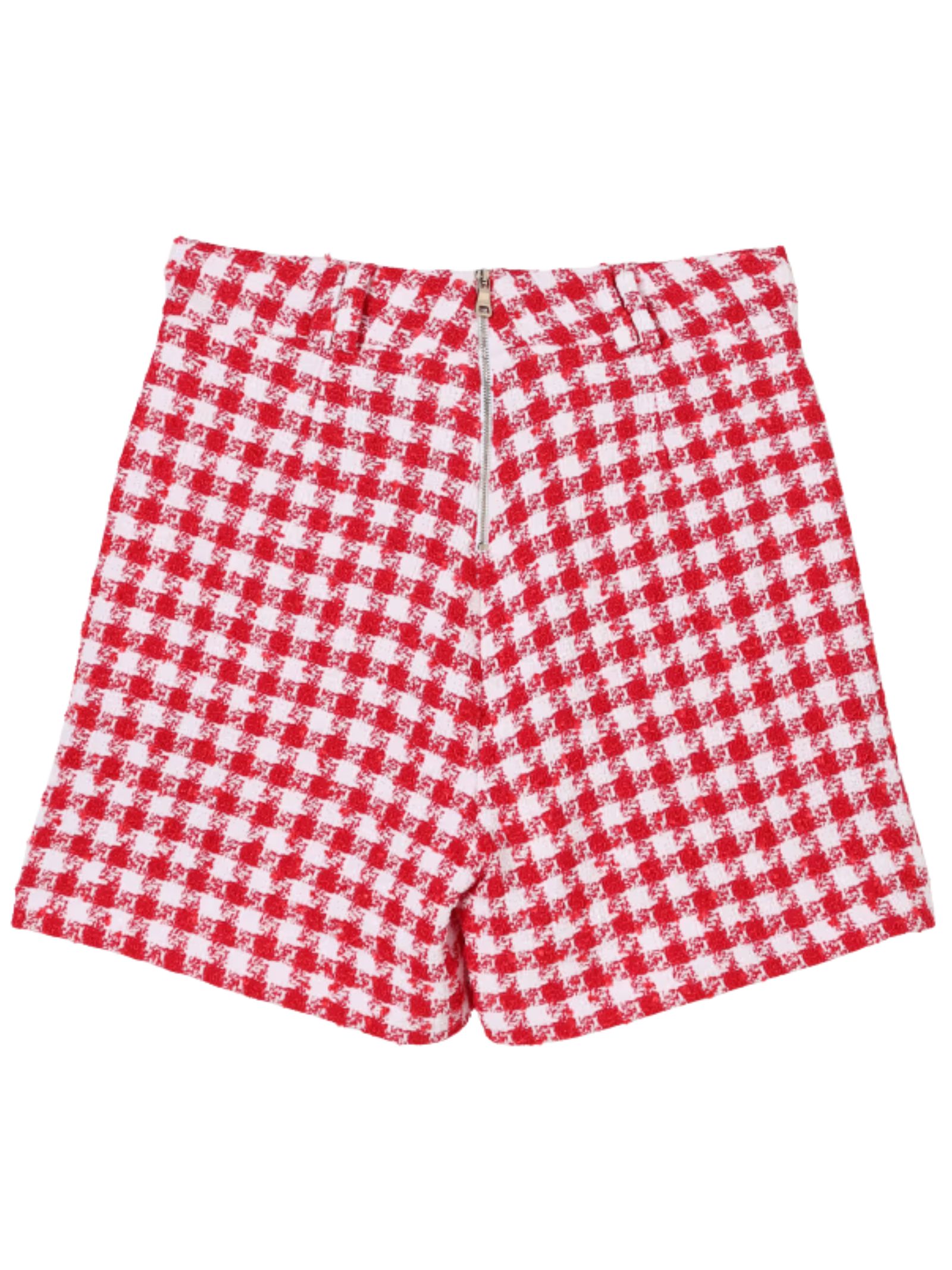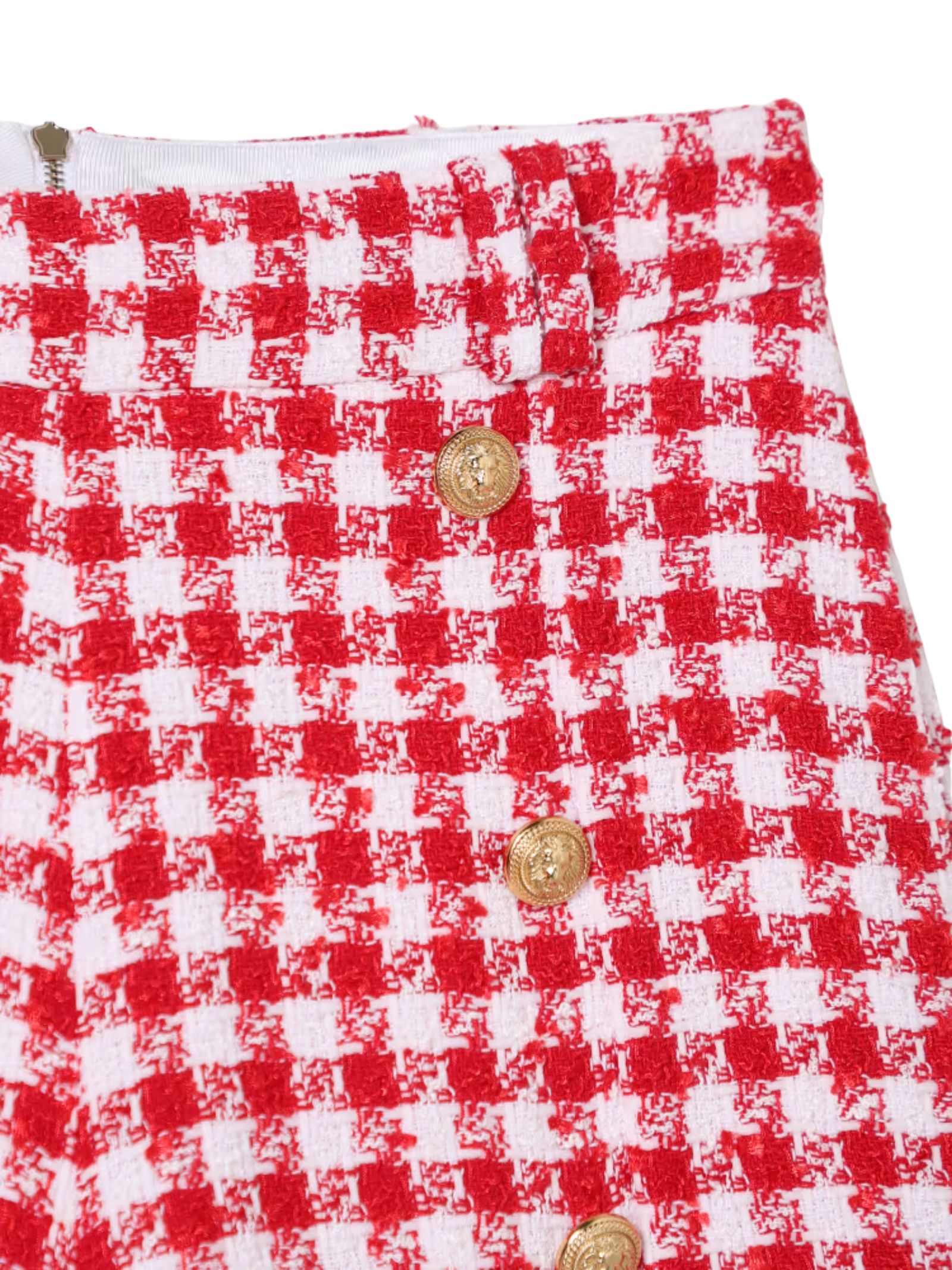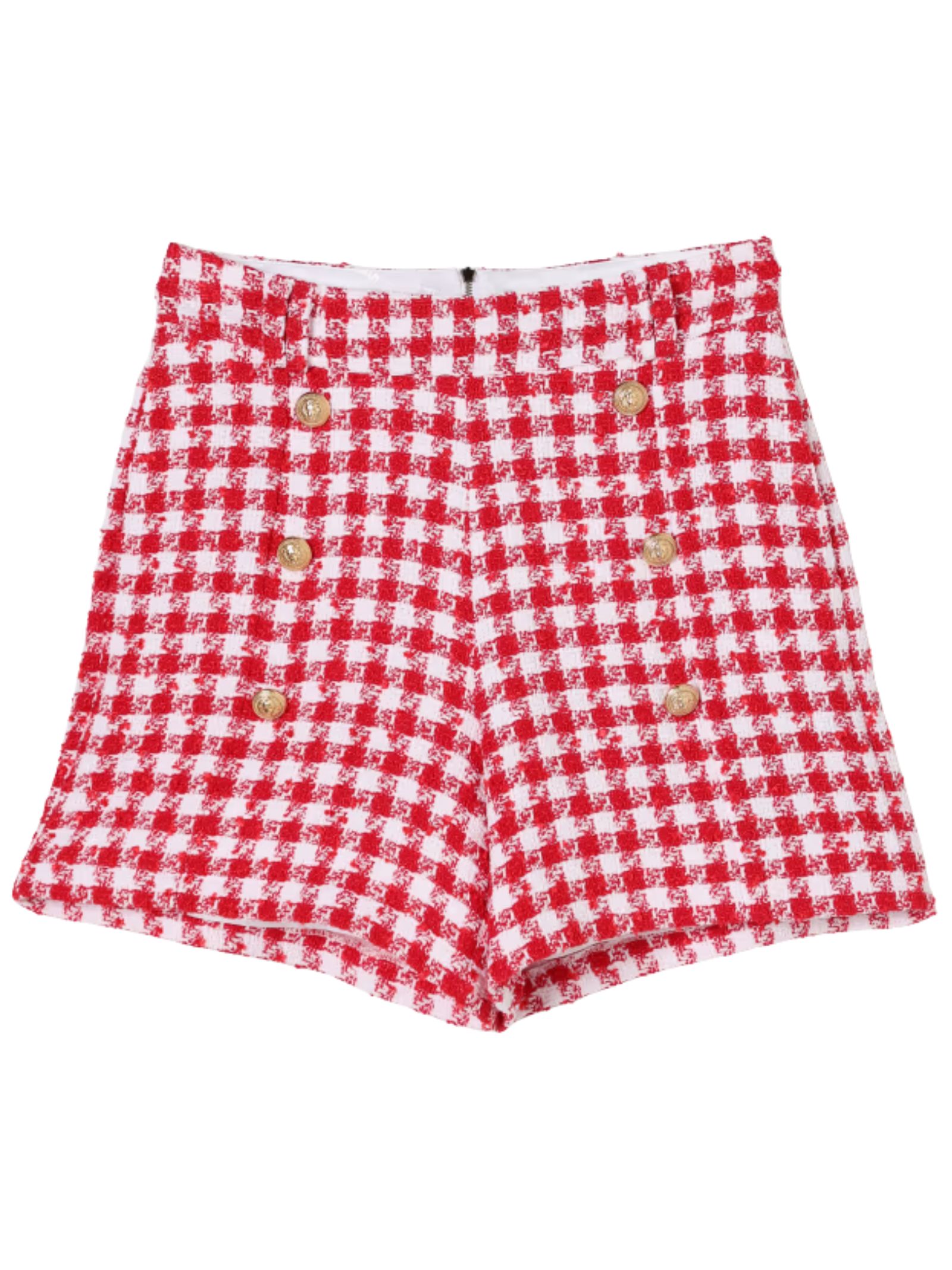 Balmain Kids white/red houndstooth shorts, high-waisted, two side welt pockets, decorated with gold-tone buttons featuring the brand's signature lion's head, and a zip at the back. Composition: 33% polyester, 29% cotton, 26% polyamide, 10% acrylic, 2% other fibers. Lining: 100% viscose. Made in Italy.