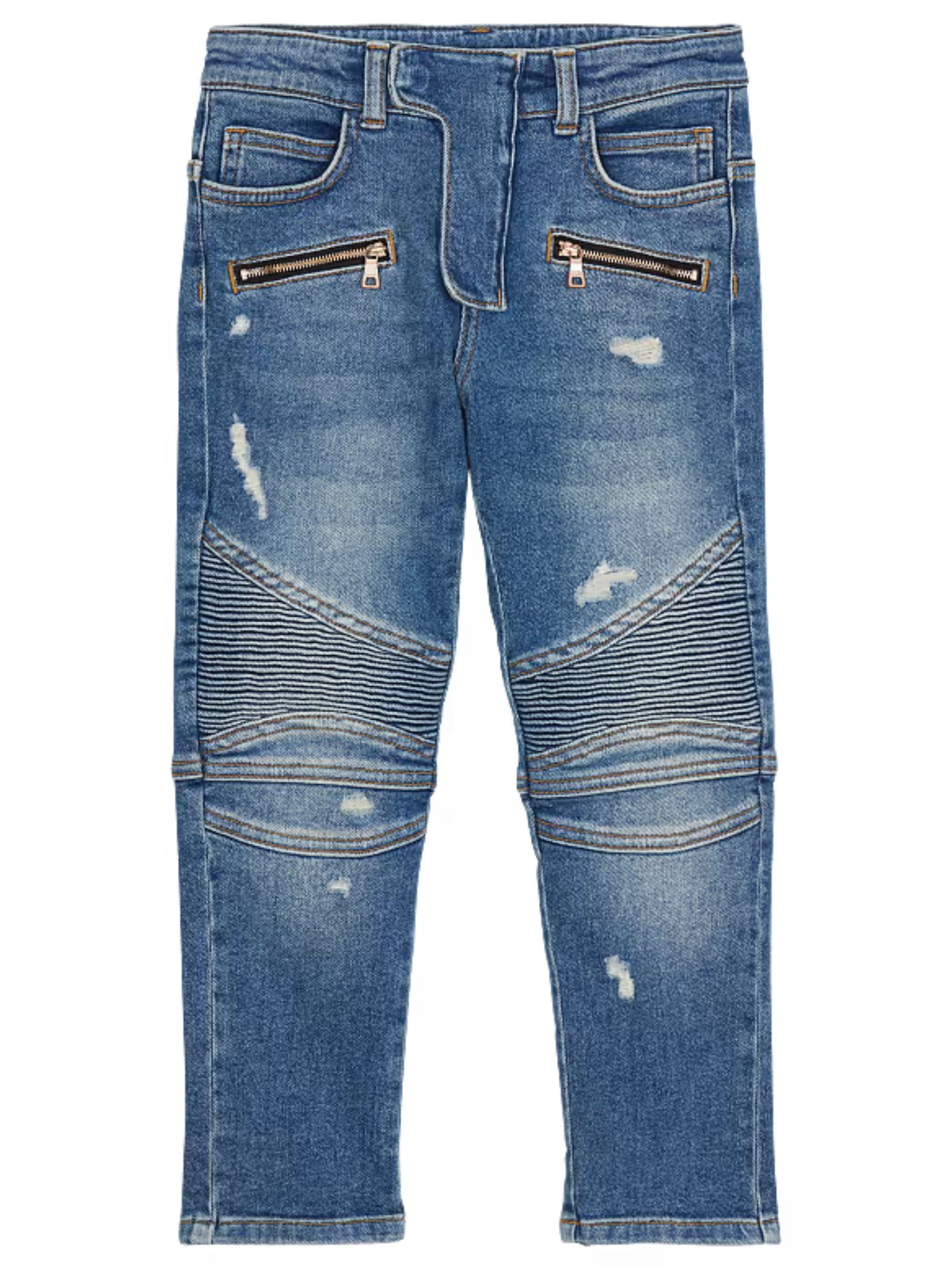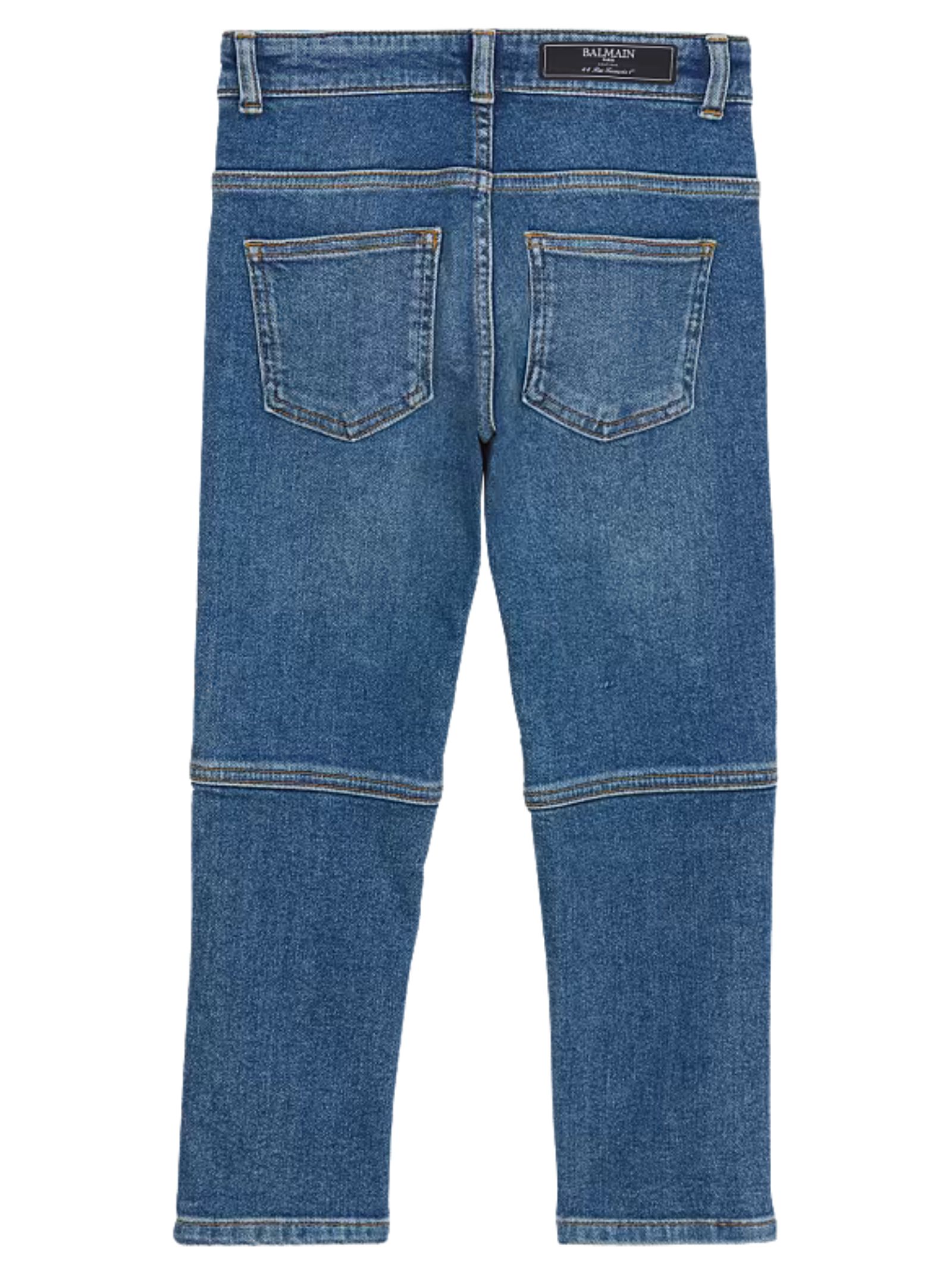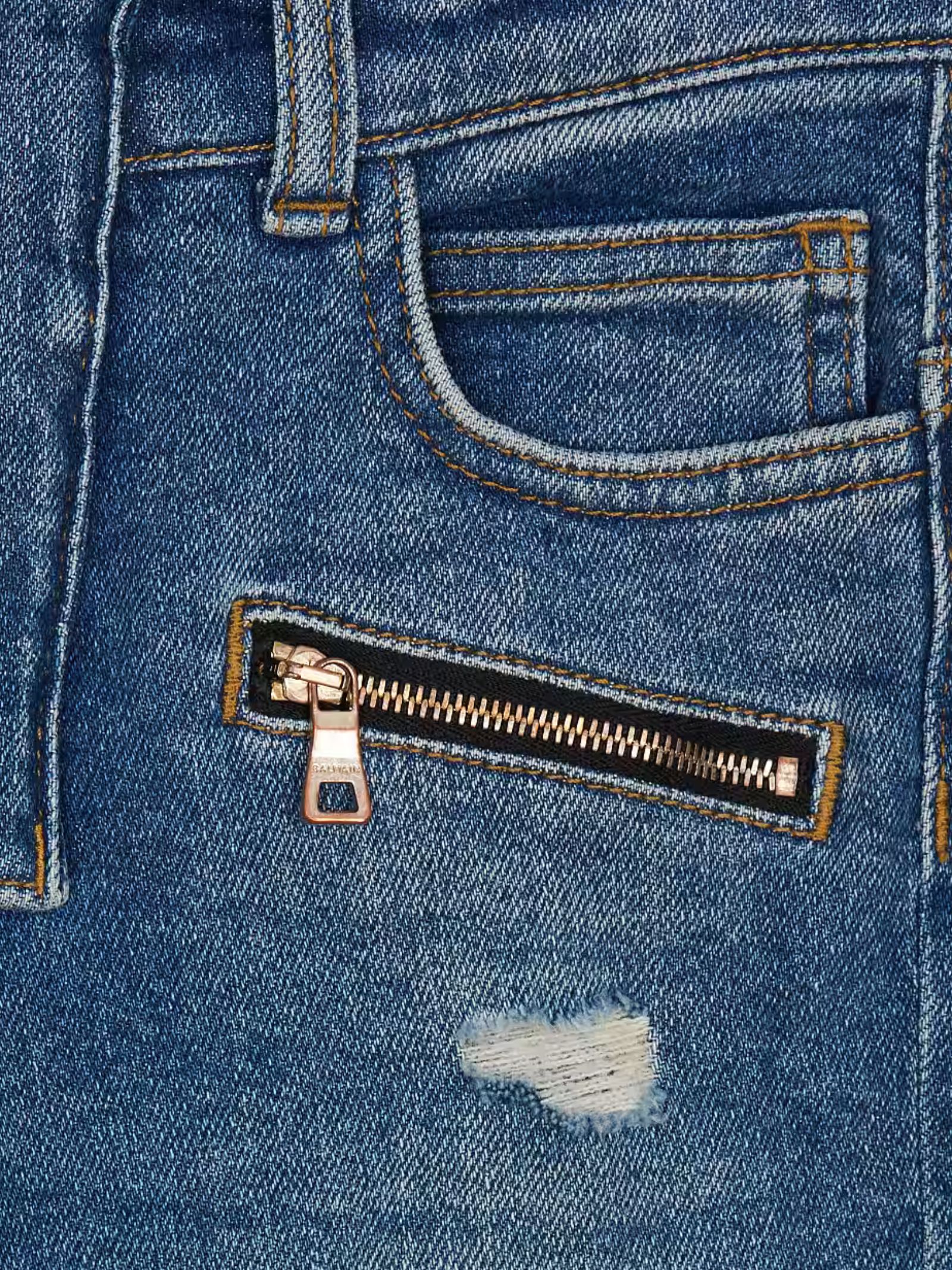 Balmain Kids medium blue wash jeans with abrasion detail, regular waist with belt loops, rounded fly, zip and snap button closure under the fly, five classic pockets, two exposed zip pockets, Balmain Paris engraved pull tab, ribbed knees, regular fit. Composition: 98% Cotton 2% Elastane. Made in Italy.