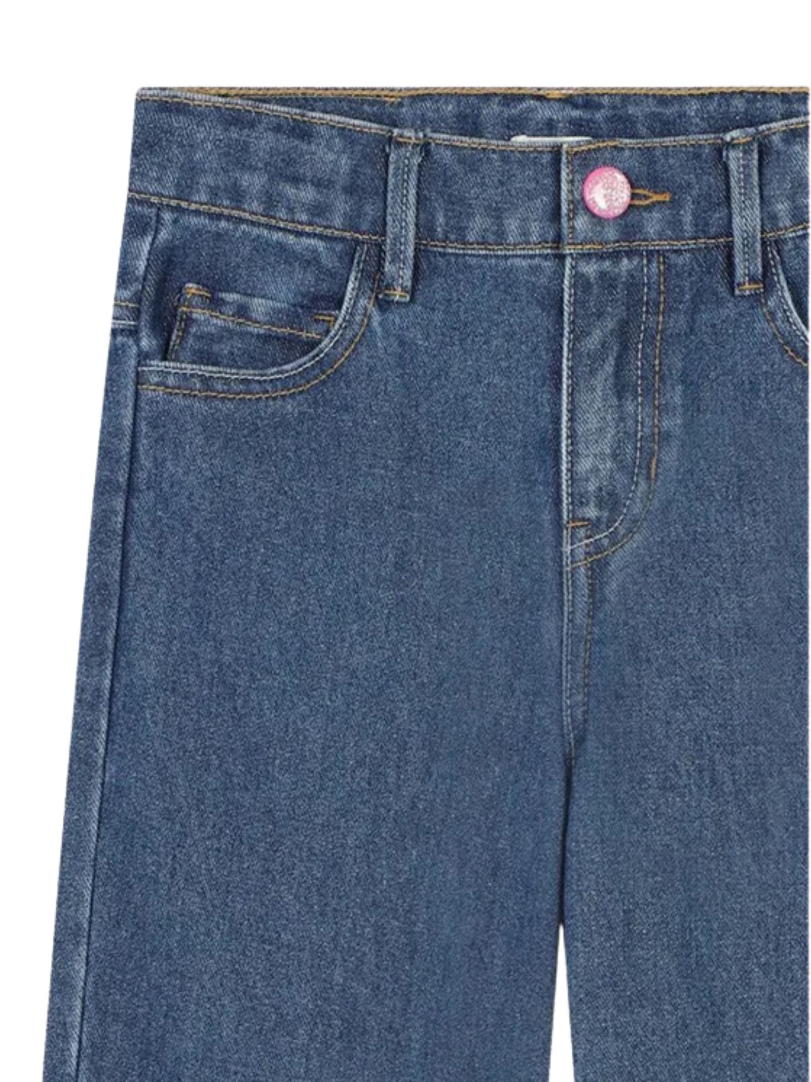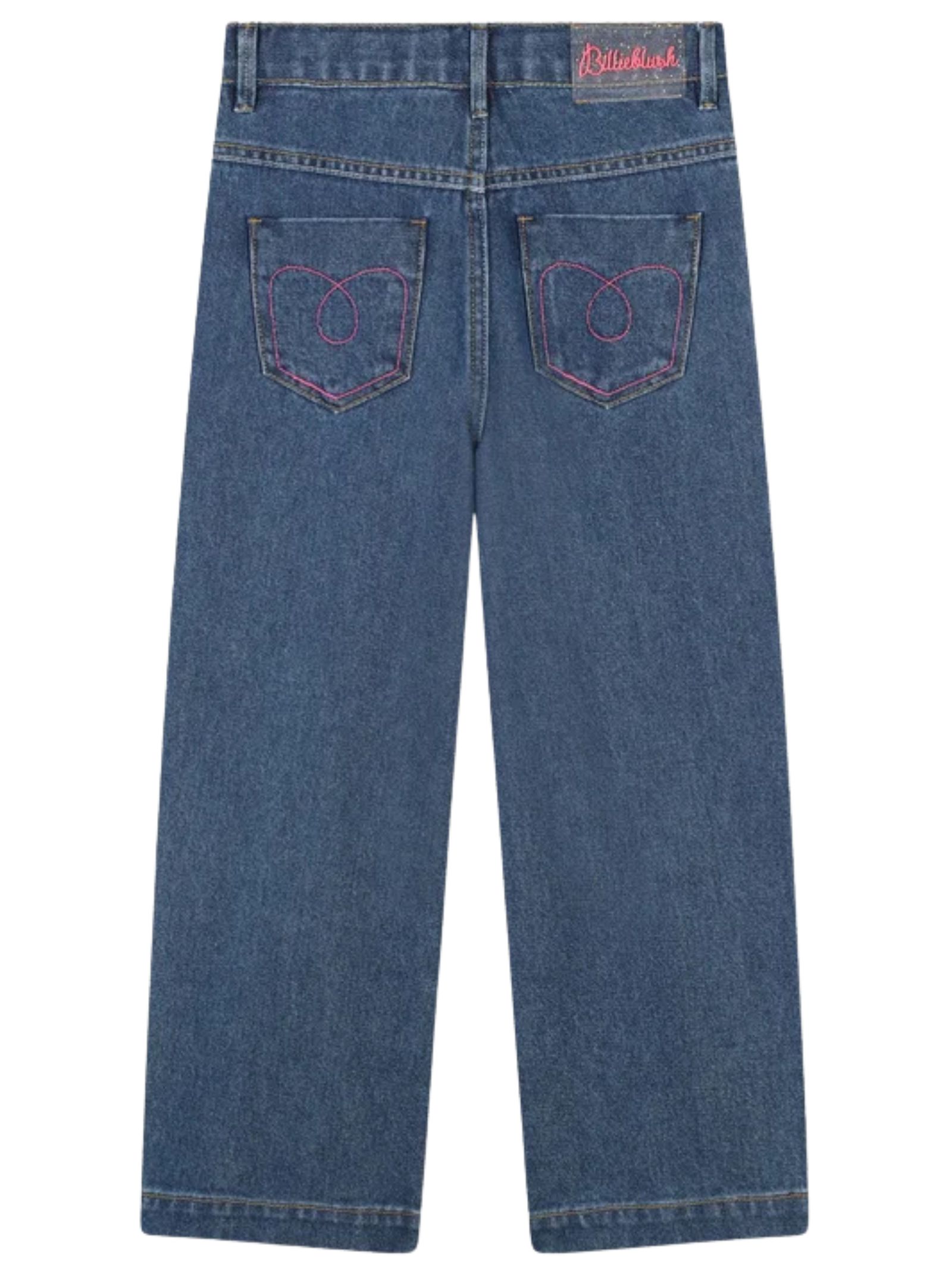 Billieblush Kids' dark denim jeans with glitter, regular waist with button and zip, elasticated waistband, five-pocket design, back logo, flared fit. Composition: 97% cotton, 3% elastane.