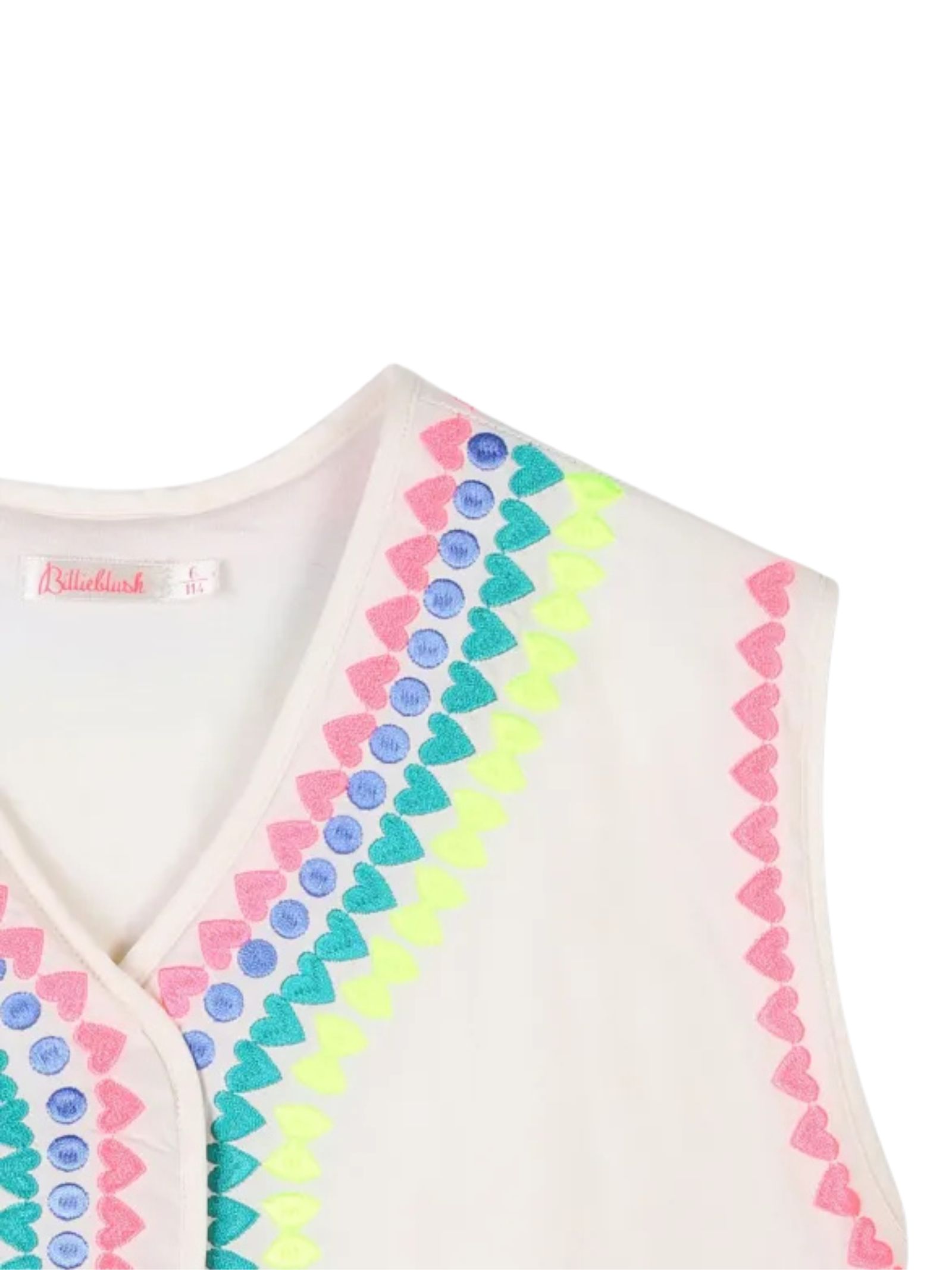 Billieblush Kids sleeveless top made of soft white cotton poplin, featuring a V-neck and front snap closure for easy wear, embellished with multicolored embroidery on both the front and back, adding a playful and original touch. Composition: 100% cotton