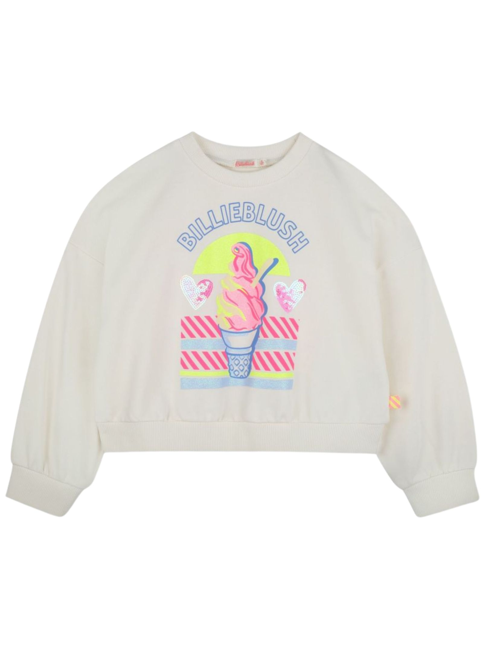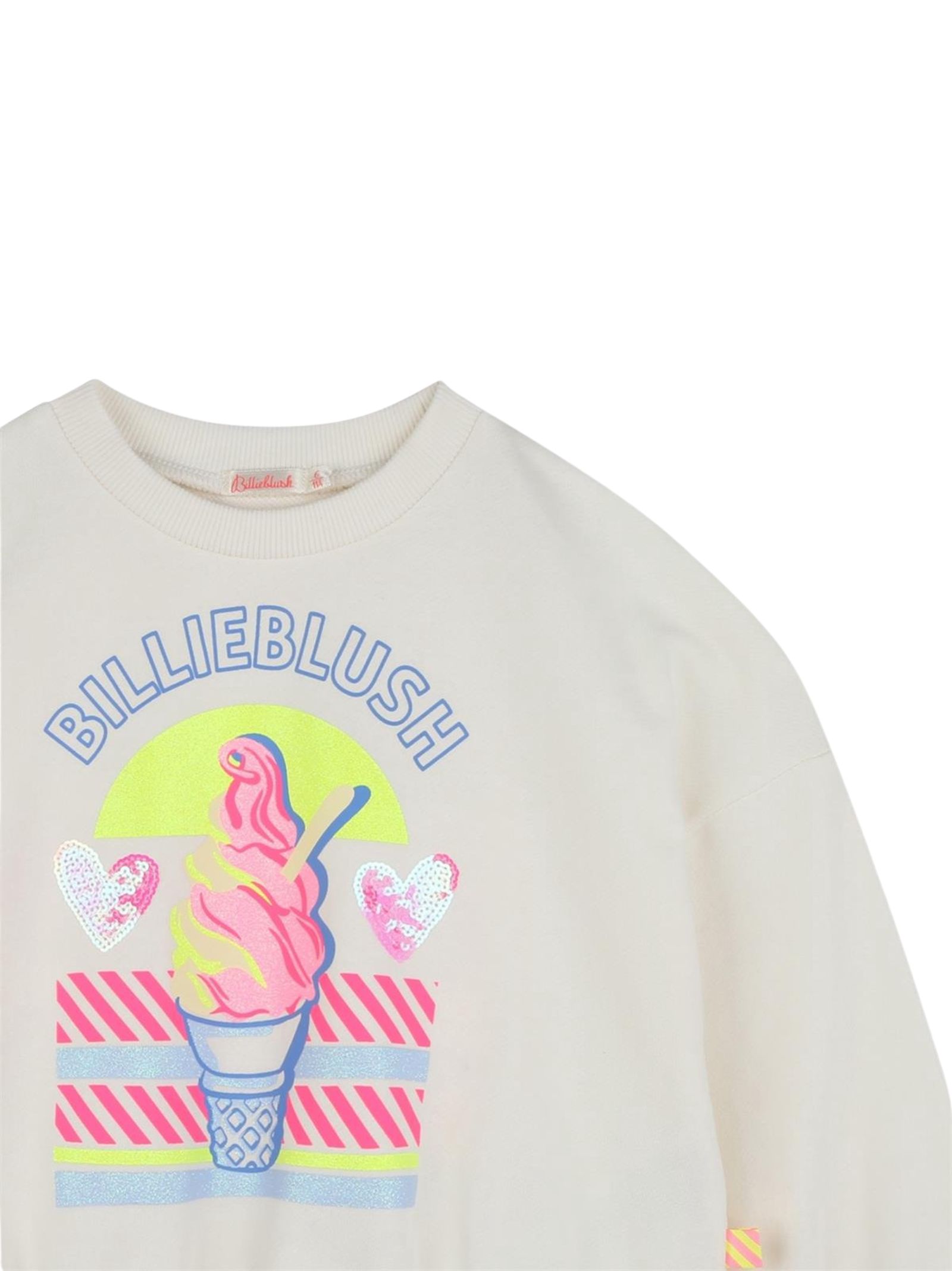 Billieblush Kids sand-colored sweatshirt, contrasting multicolor central print detail with glitter and sequins, cropped fit, crew neck, long sleeves, ribbed cuffs. Composition: 100% cotton