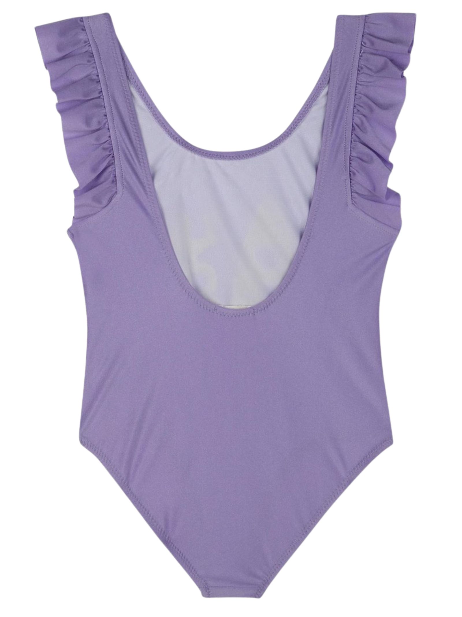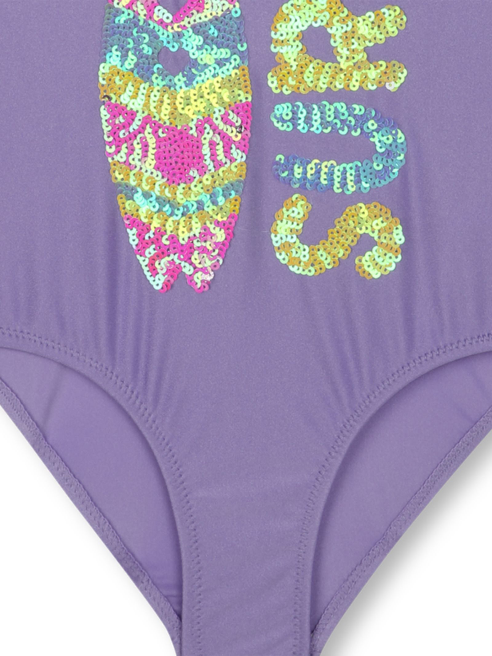 Billieblush Kids lilac one-piece swimsuit with central sequin appliqué, open back, and ruffled straps. Composition: 80% polyamide, 20% elastane.