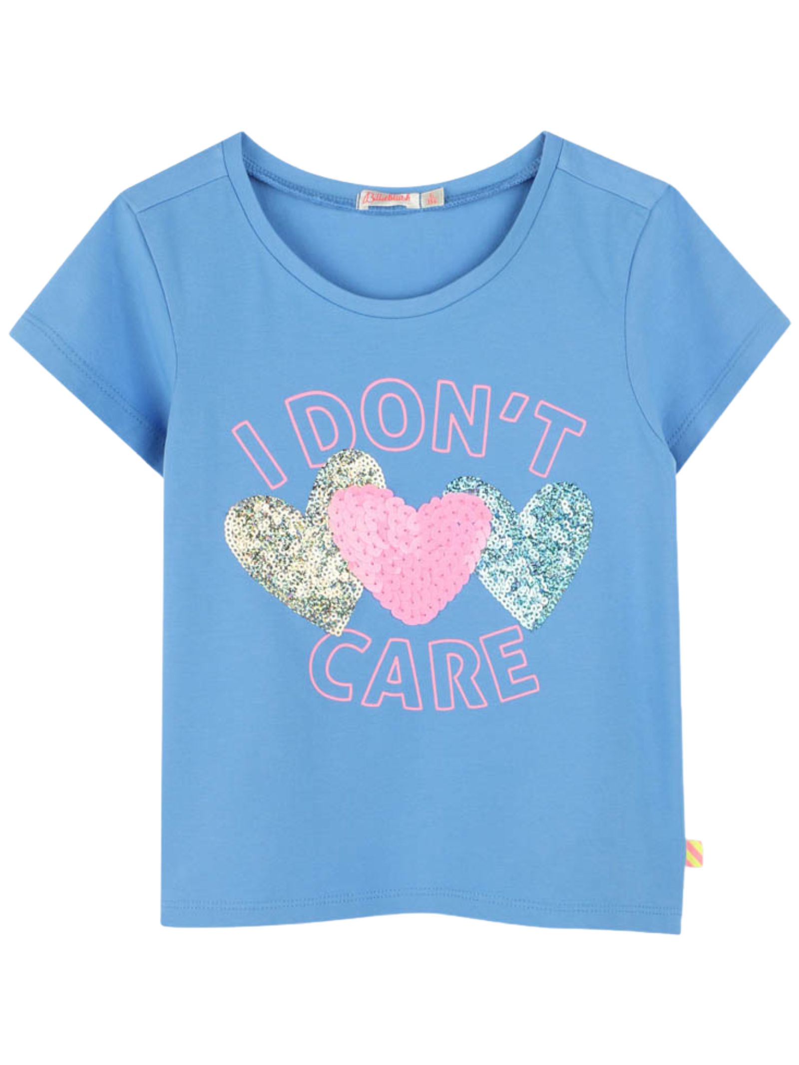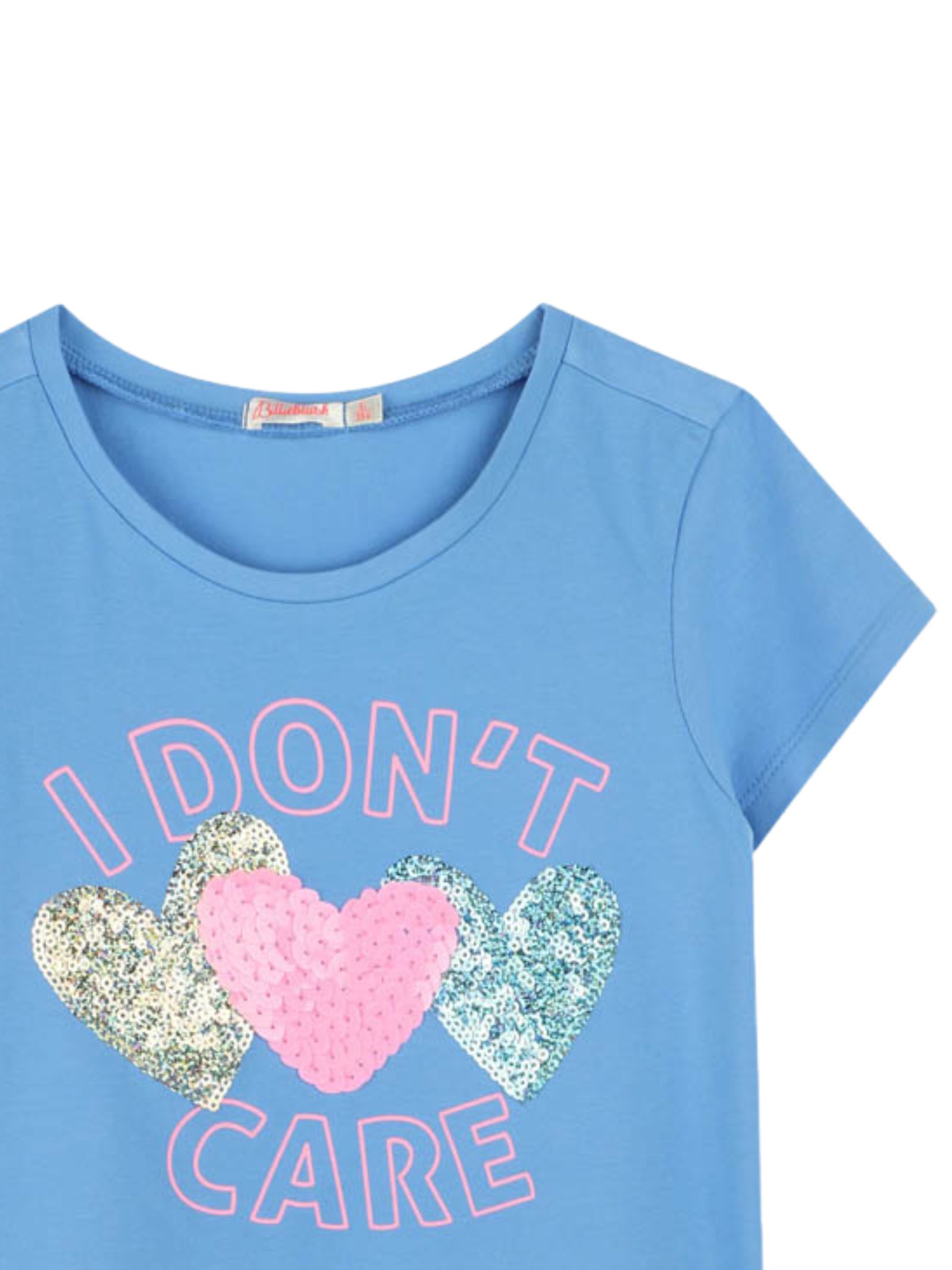 Billieblush Kids light blue T-shirt, made of soft cotton, crew neck, short sleeves, multicolor sequin appliqué at the center, regular fit. Composition: 96% cotton, 4% elastane.