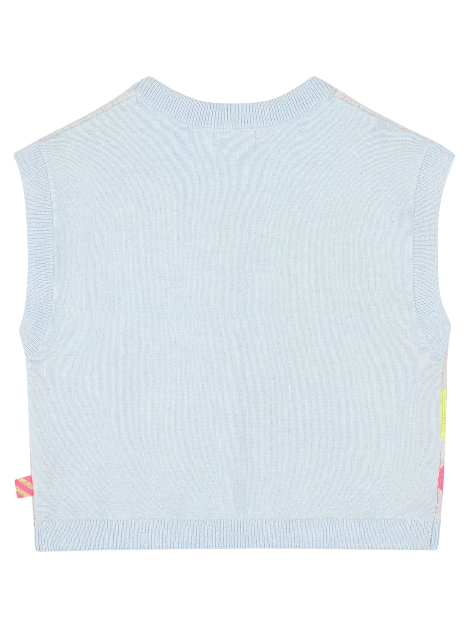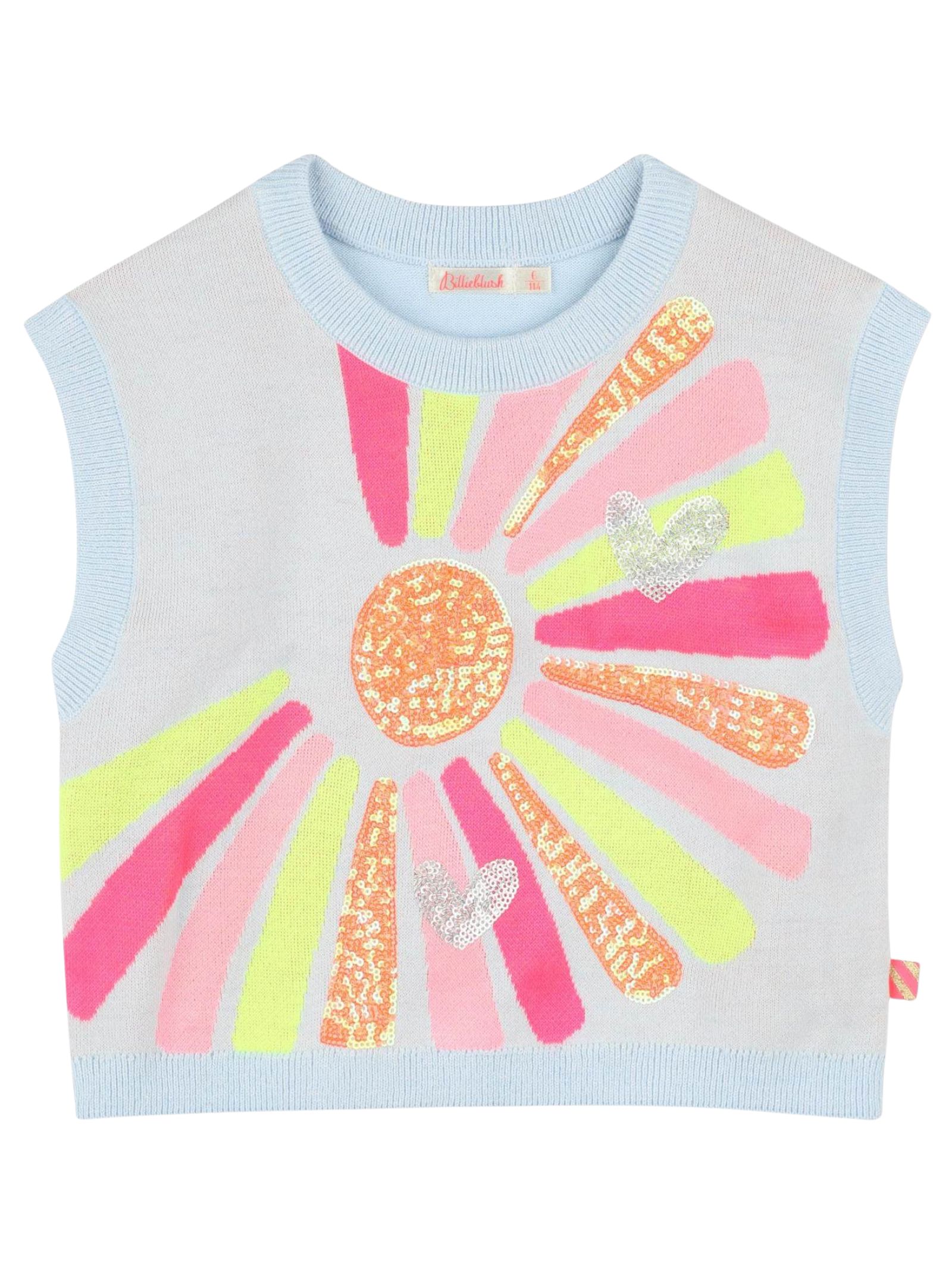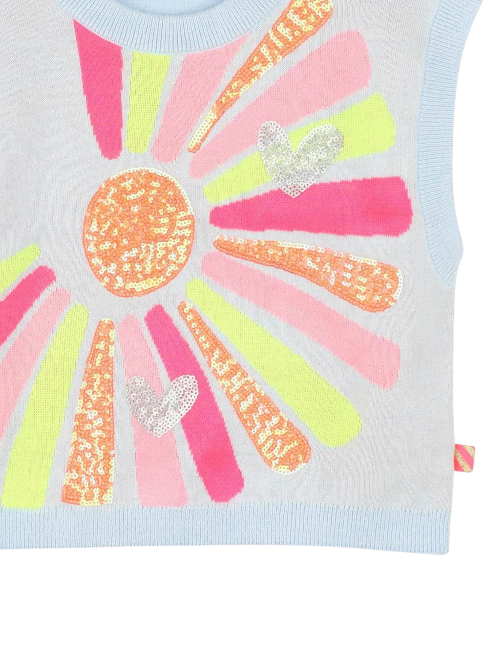 Billieblush Kids light blue sweater with contrasting multicolor sequin print detail at the center, cropped fit, crew neck, sleeveless, ribbed hems. Composition: 100% cotton