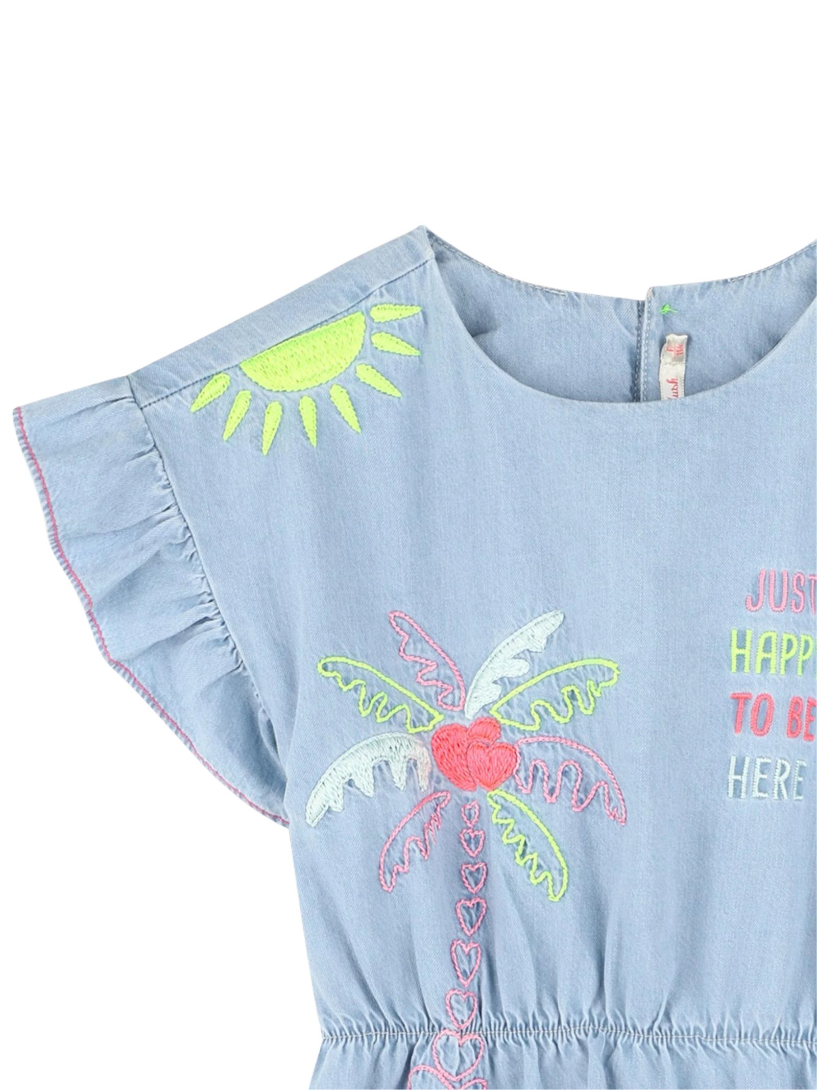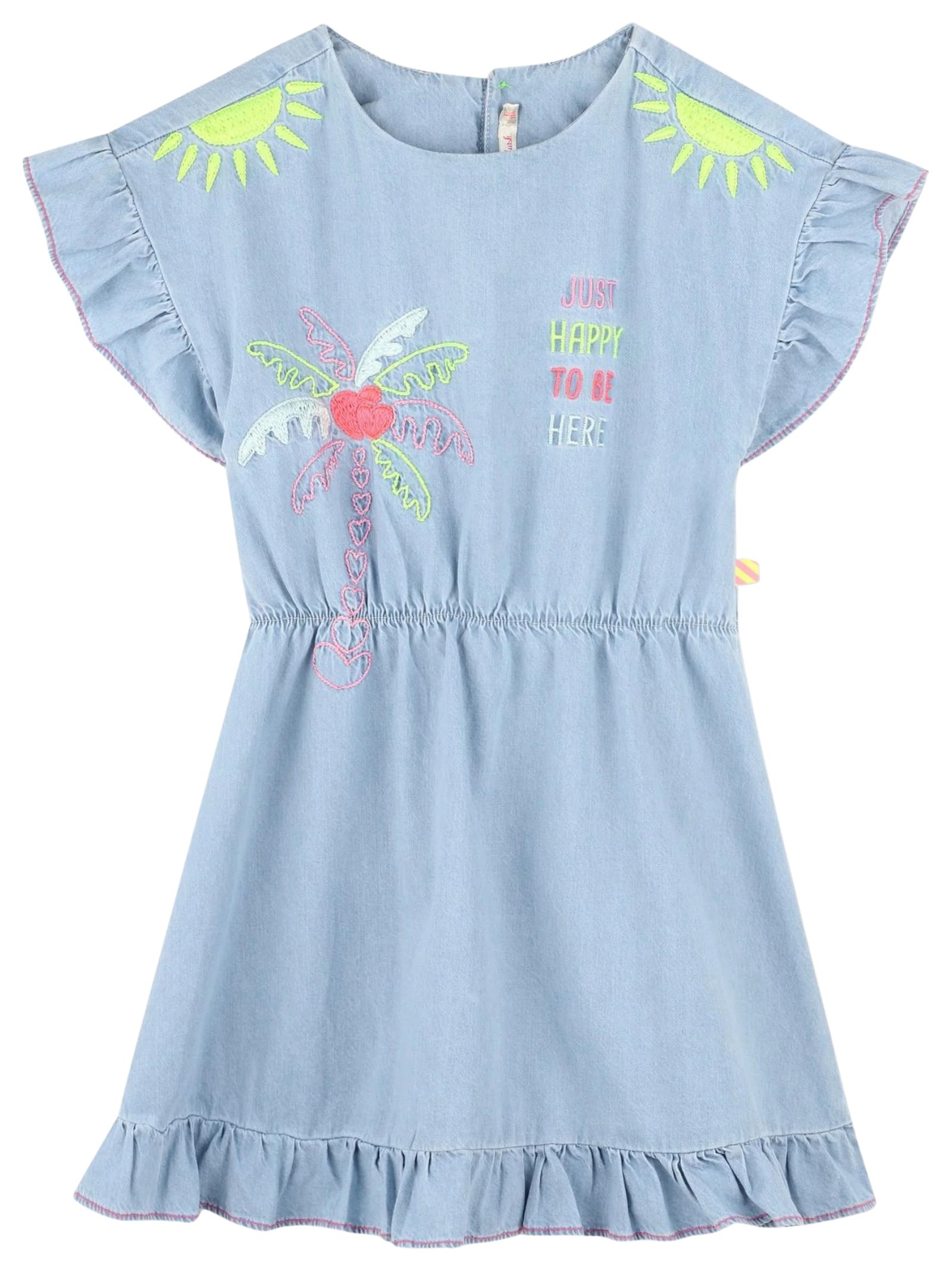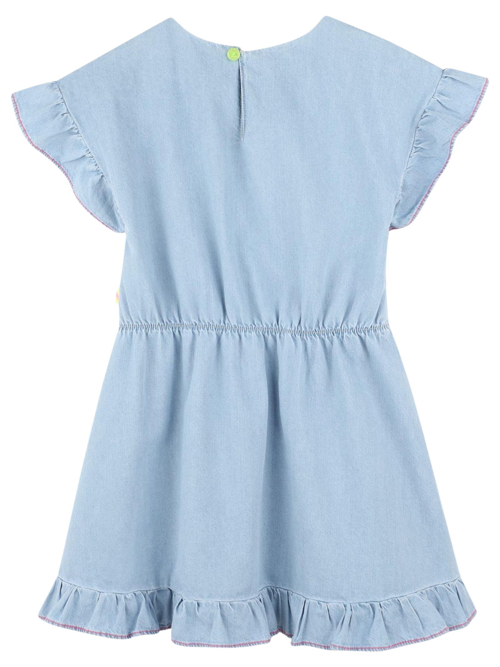 Billieblush Kids light blue cotton denim dress with contrasting multicolor embroidery detail, crew neck, short sleeves, fitted waist, ruffled trim, back button closure, flared design. Composition: 100% Cotton