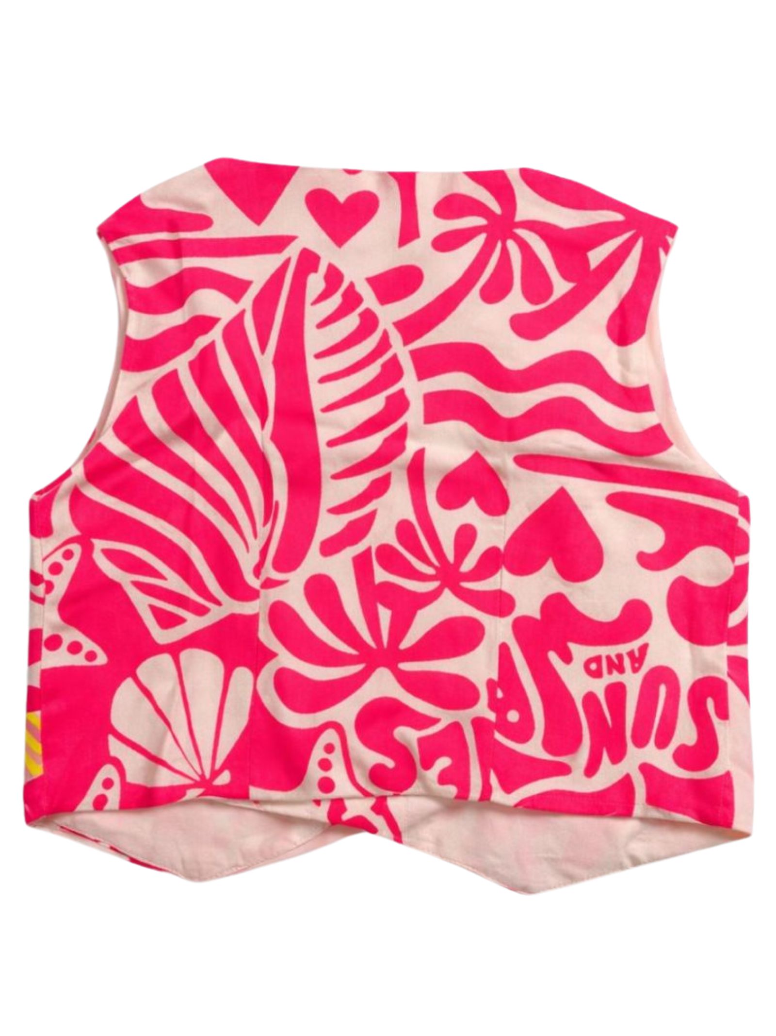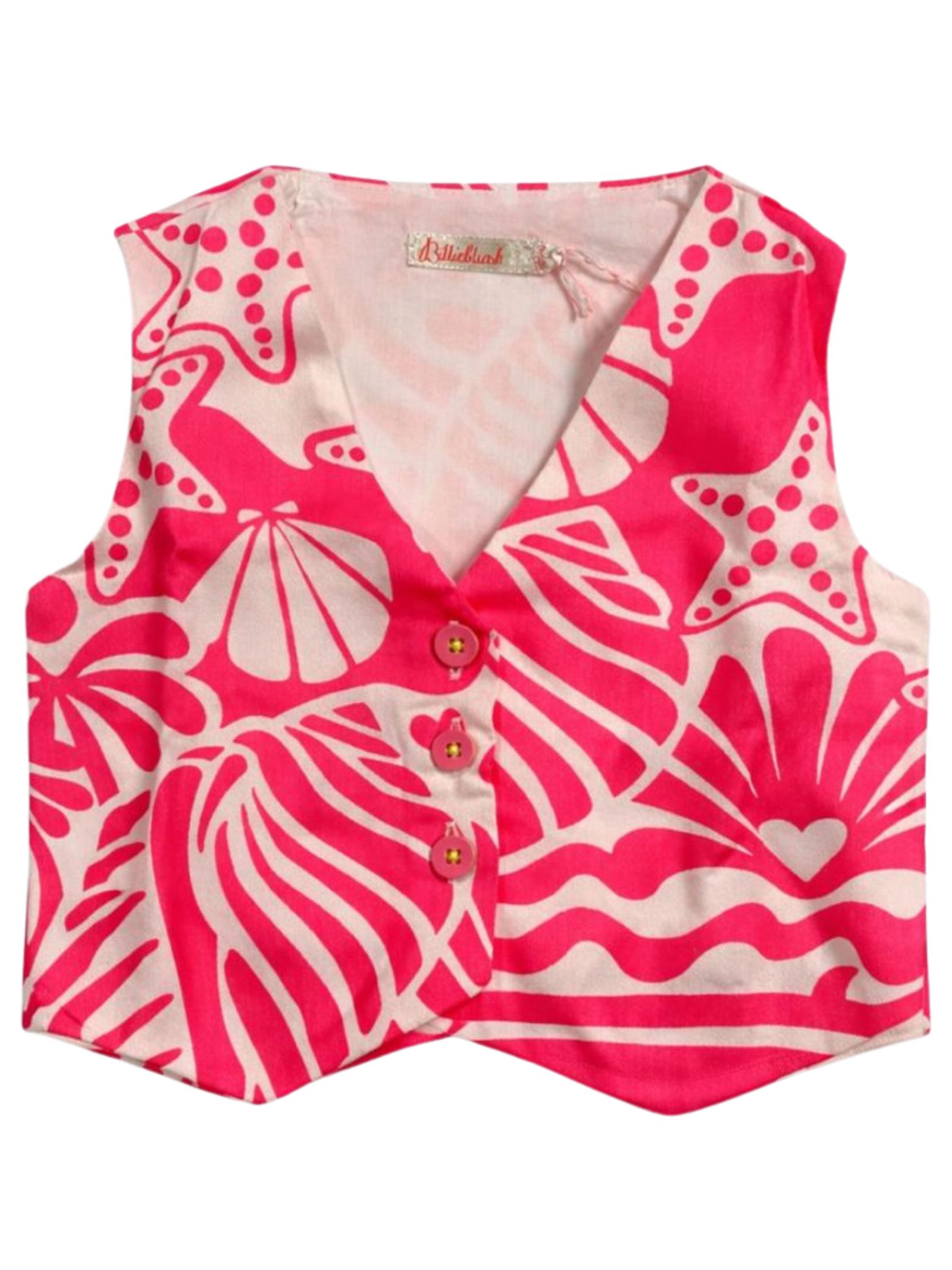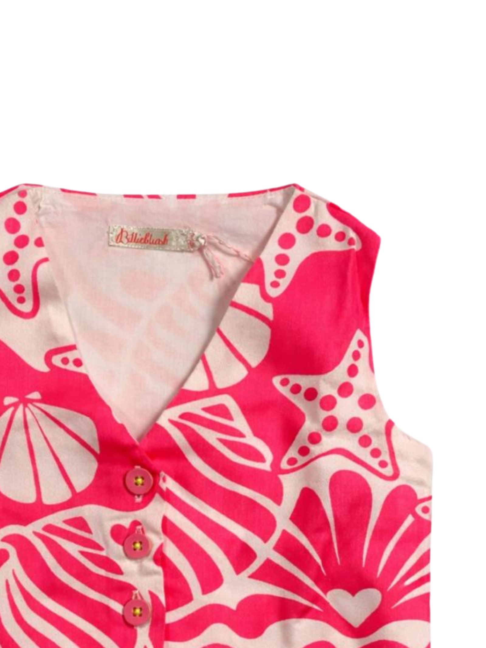 Billieblush Kids white/fluo pink all-over print vest, V-neck, button closure, regular fit. Composition: 100% viscose. Lining: 100% cotton.