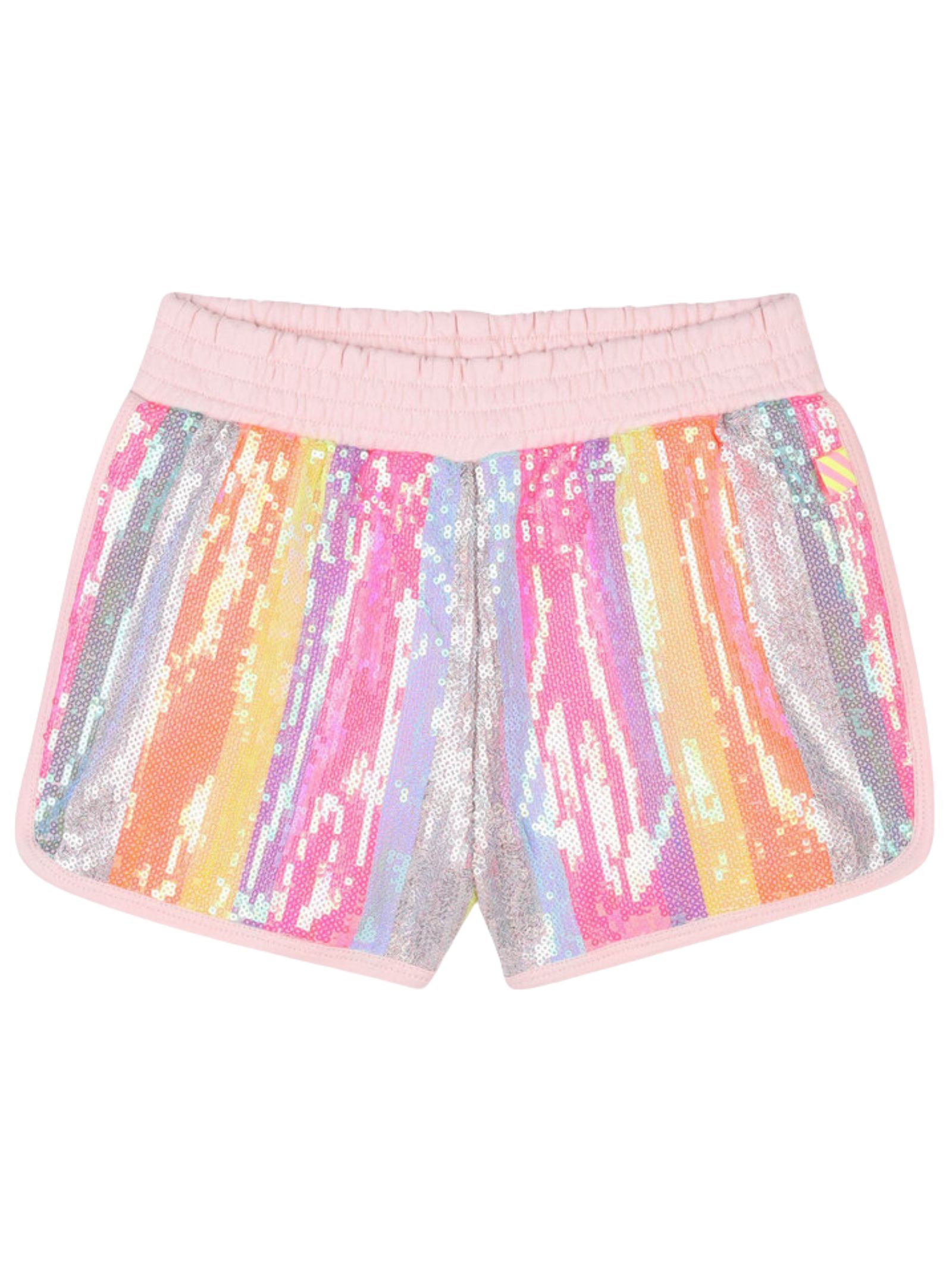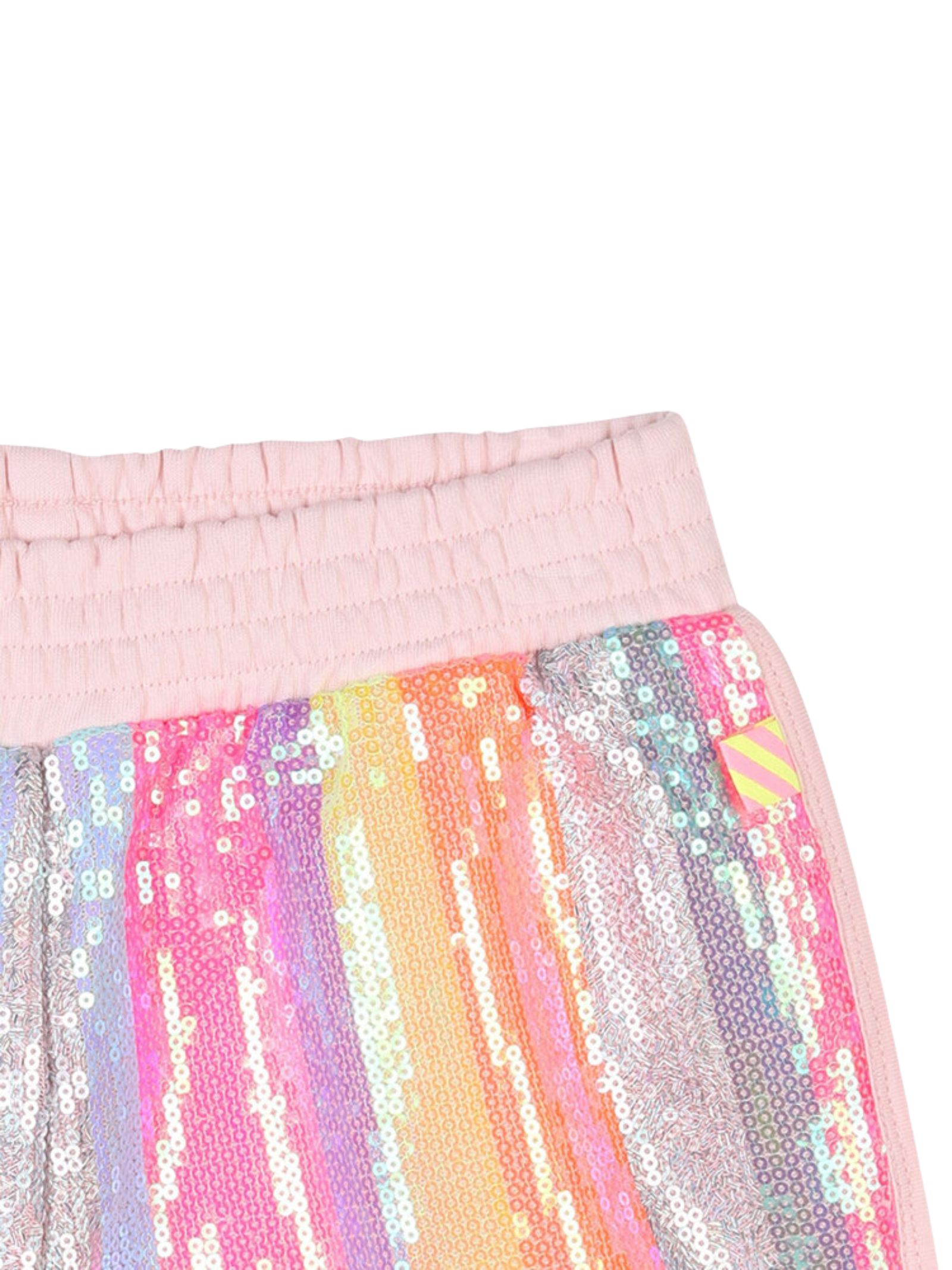 Billieblush Kids pink shorts with multicolored sequins on the front, elastic waistband, patch detail, regular fit. Composition: 100% cotton.