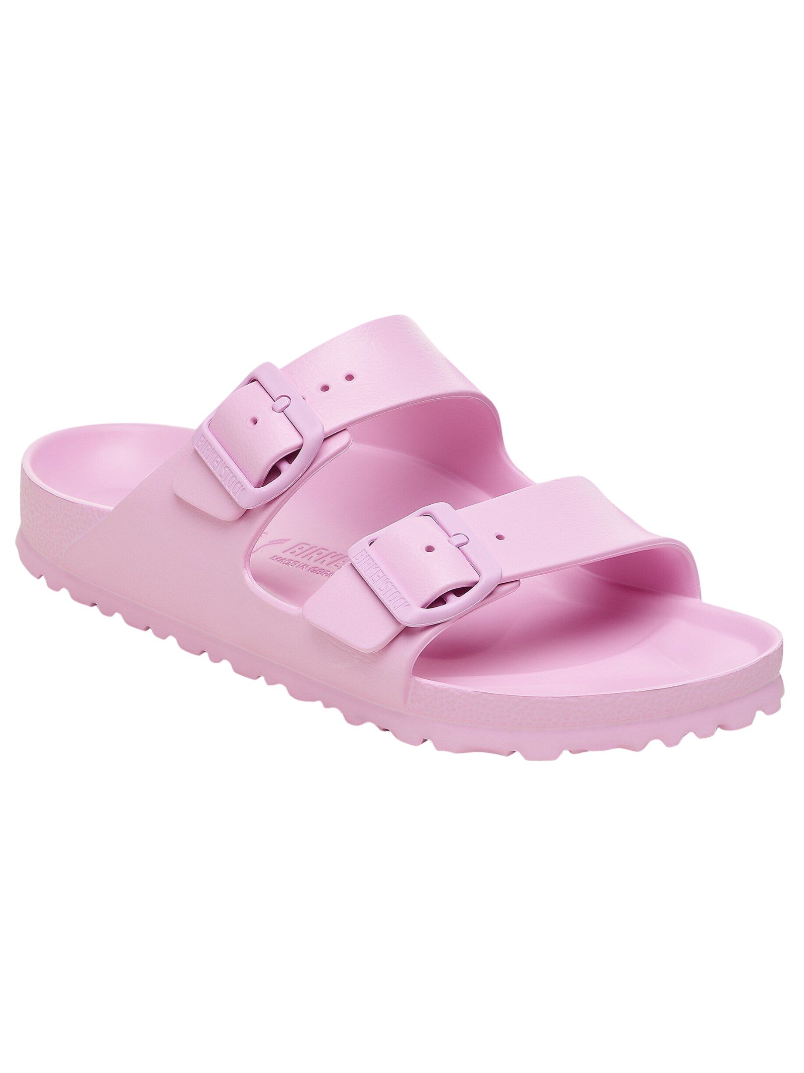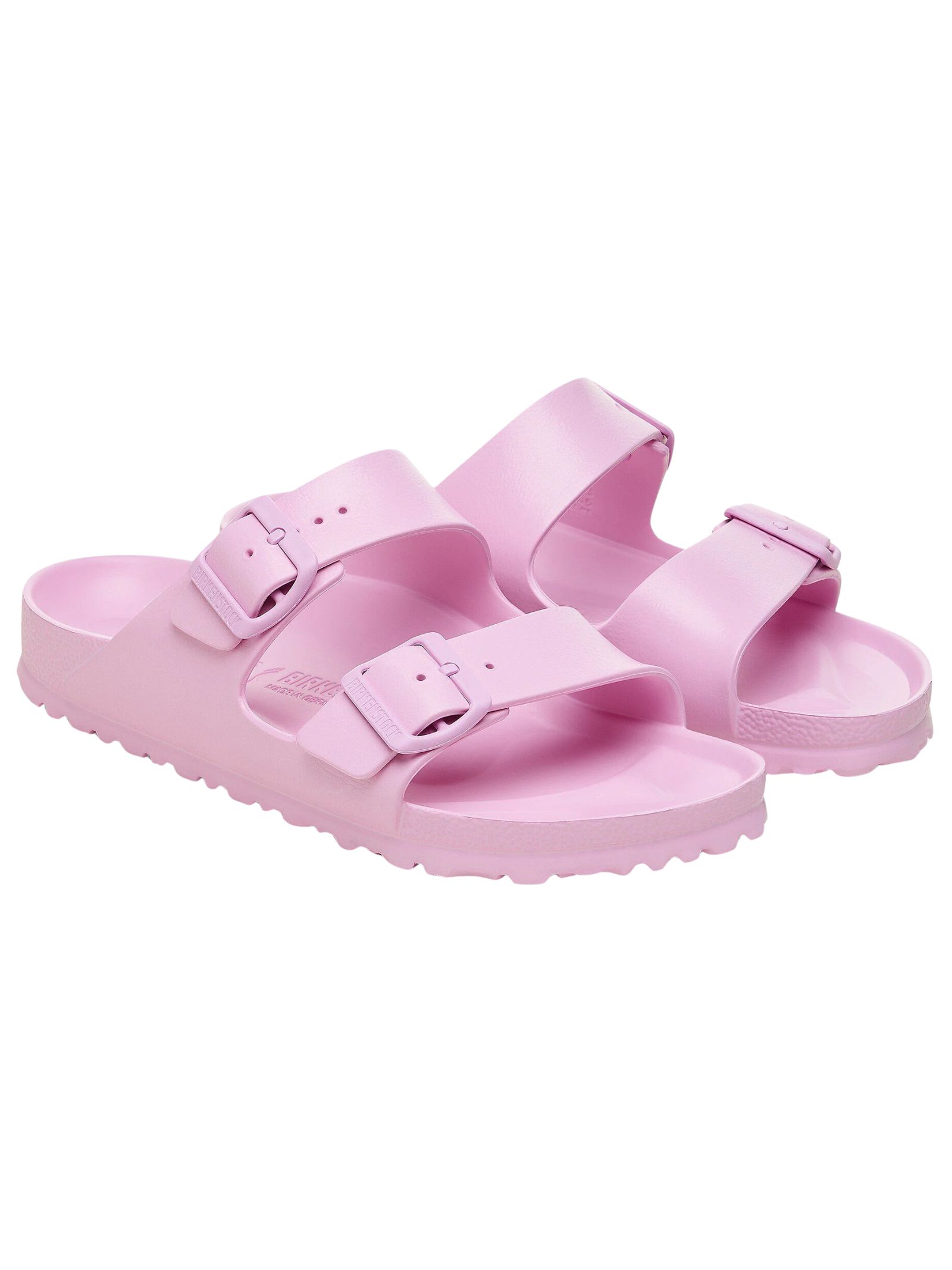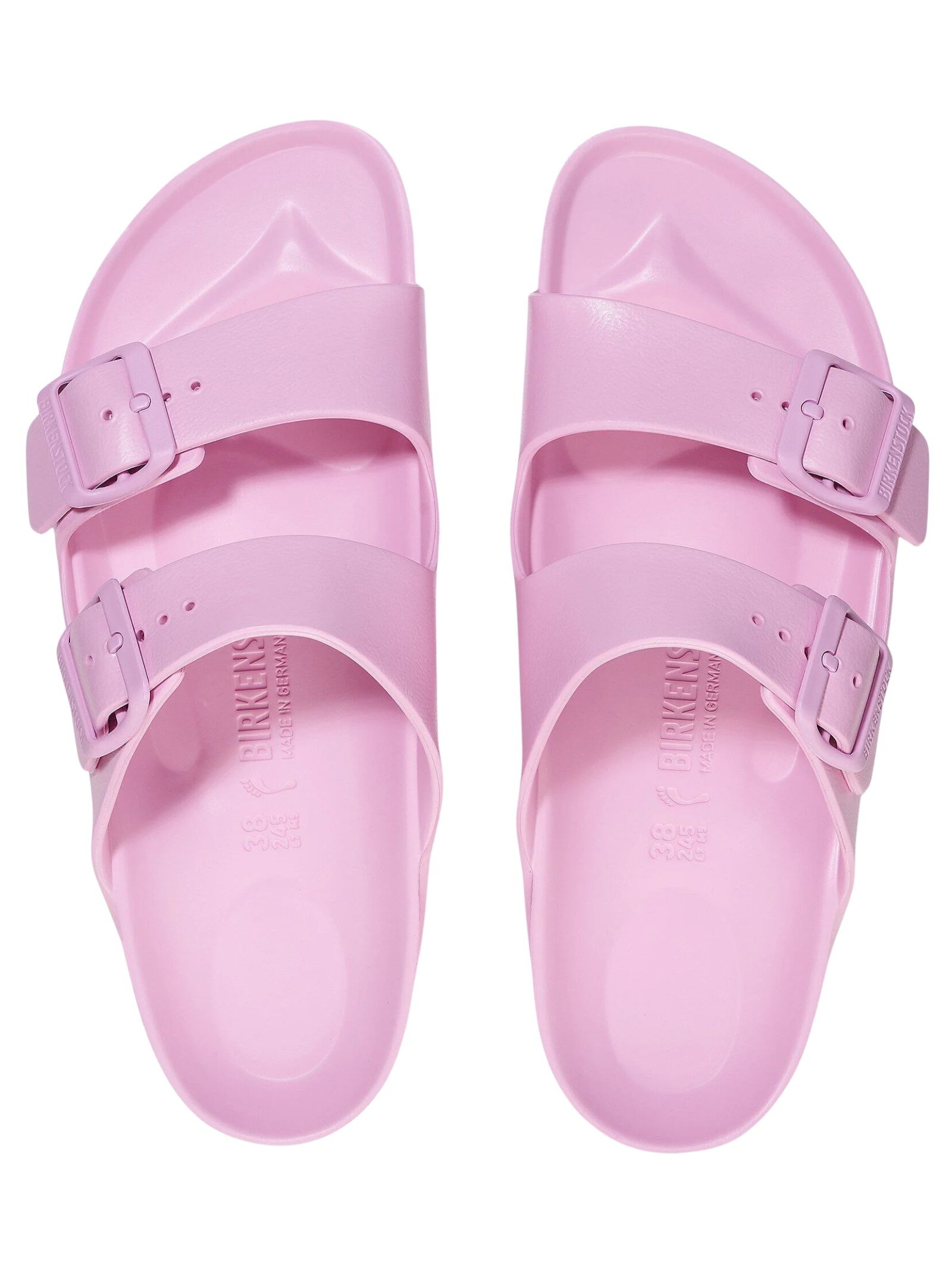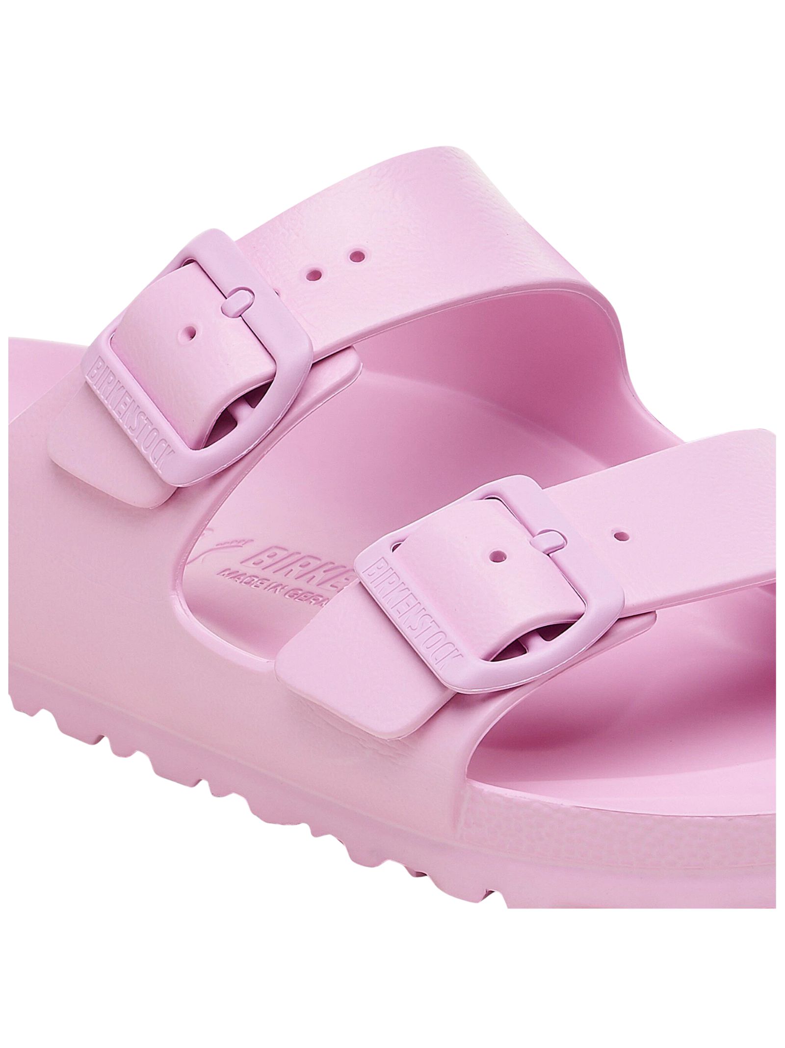 BIRKENSTOCK ARIZONA EVA girls' sandals in pink with a buckle closure, round toe, and non-slip rubber sole. They are waterproof, washable, and ultralight. Made entirely from one piece of 100% EVA (ethylene vinyl acetate). Made in Germany.