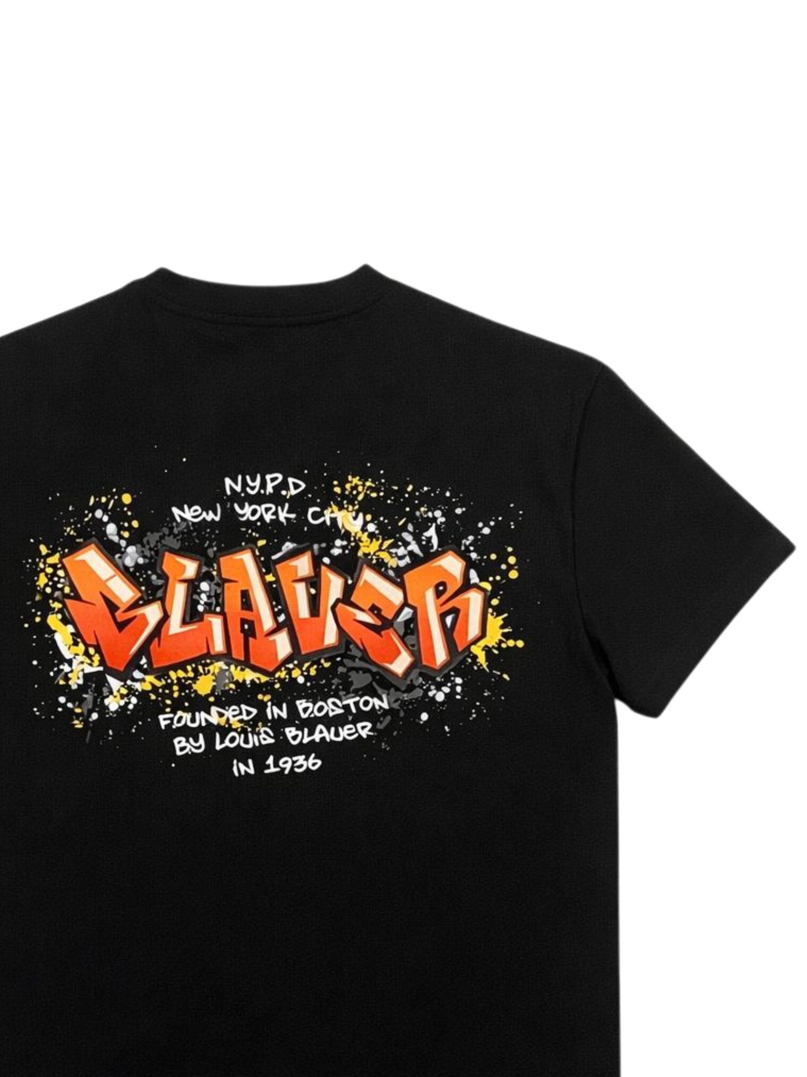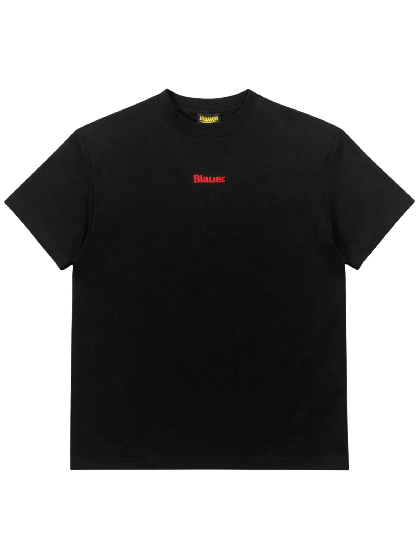 Blauer Kids black T-shirt, crew neck, short sleeves, contrasting red logo embroidery on the front, contrasting print on the back, regular fit. Composition: 95% cotton 5% elastane.