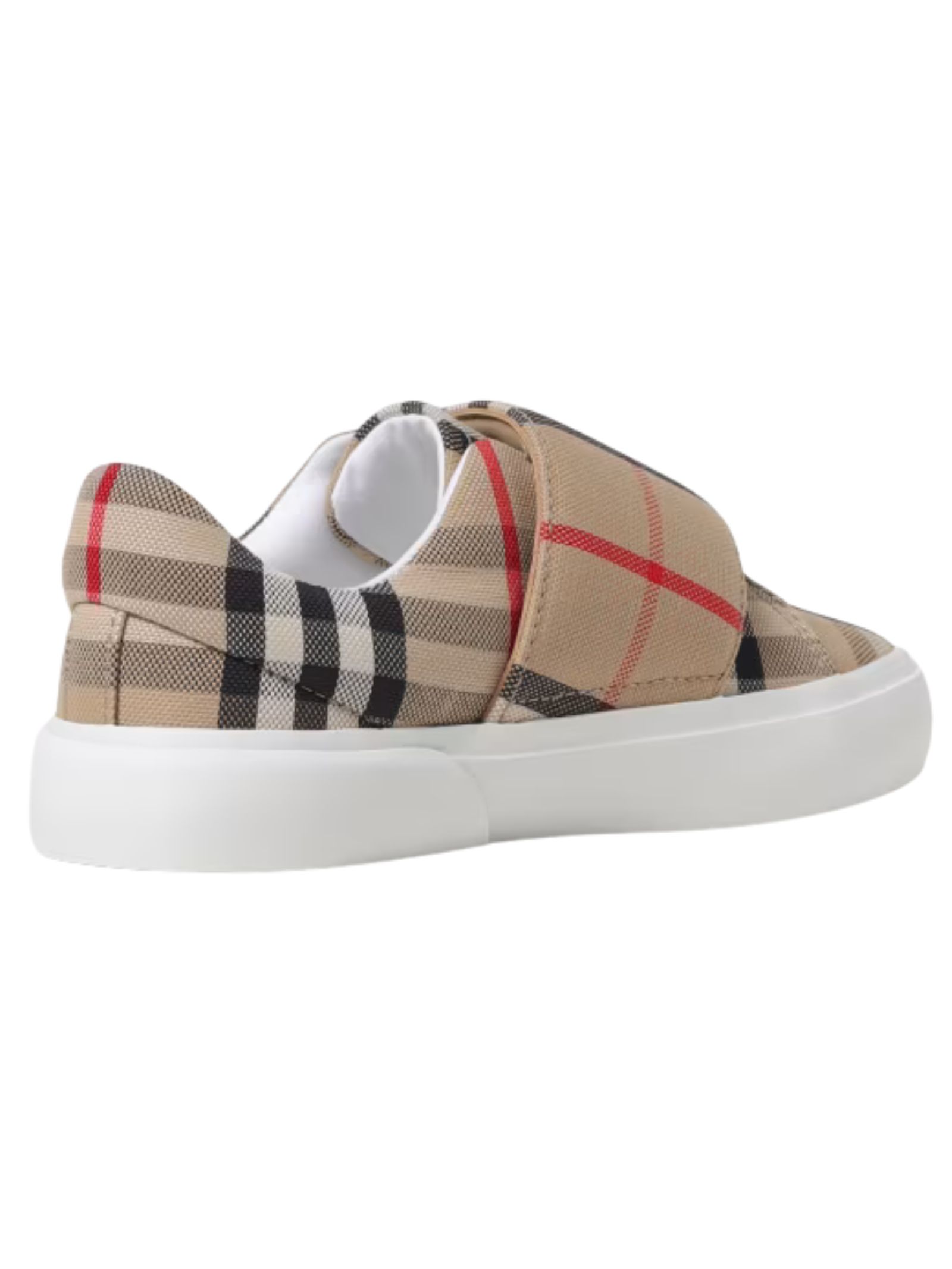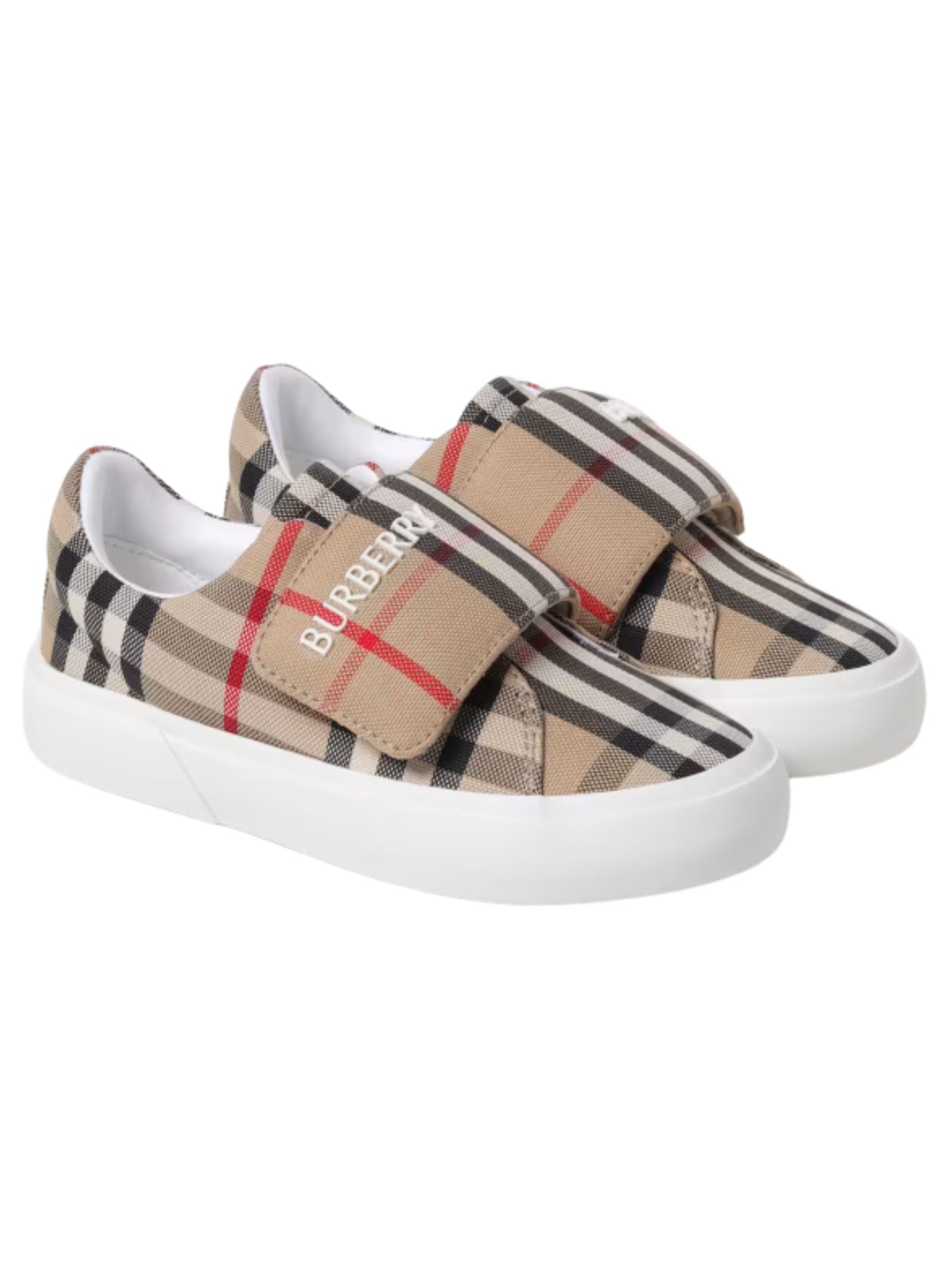Burberry Kids Vintage Check sneakers in jacquard canvas, casual style, contrasting logo, rubber lettering, interior with laminated logo, slip-on model, round toe, low top ankle, rubber sole, closure with velcro strap, canvas materials and vintage check pattern