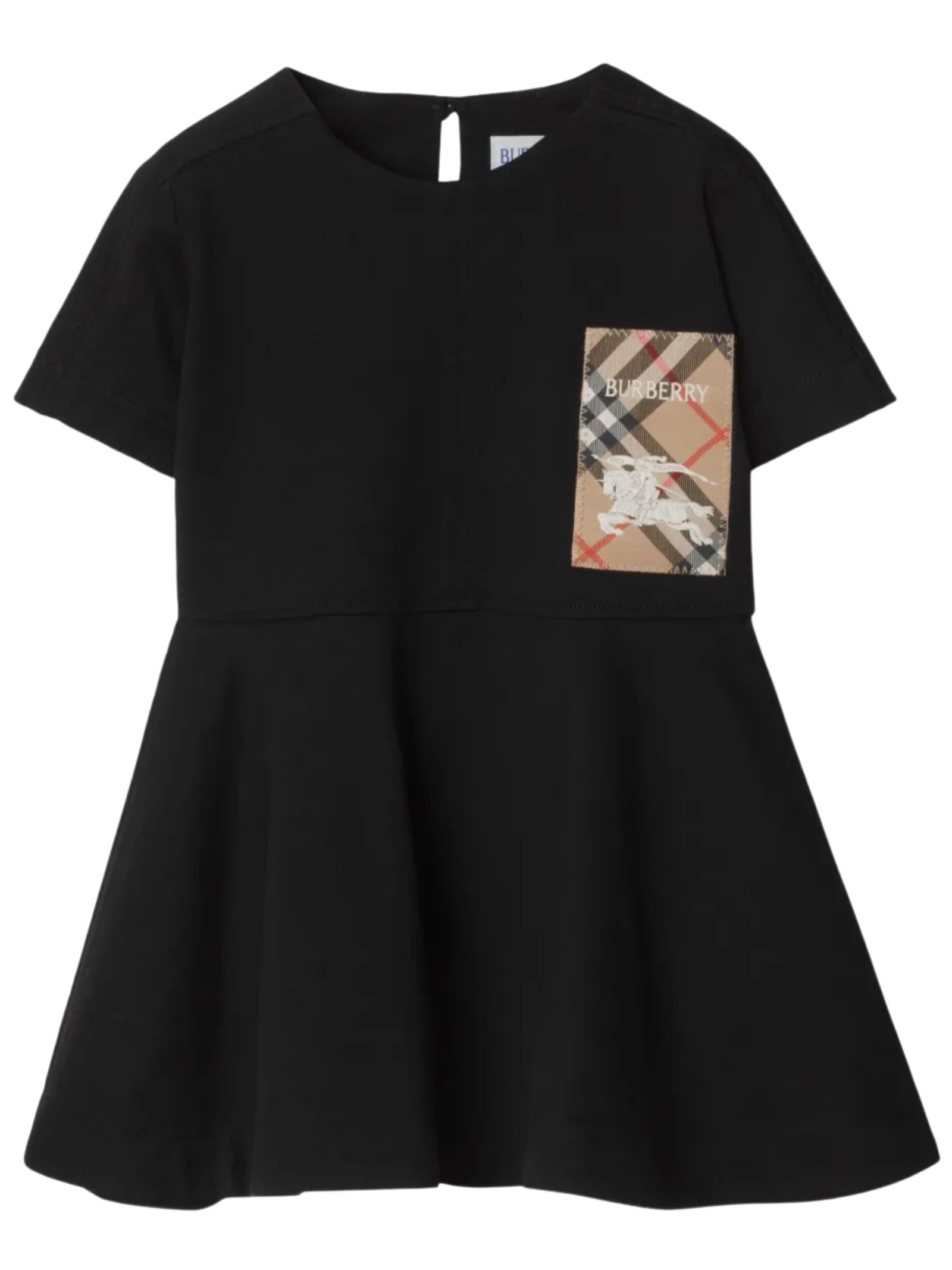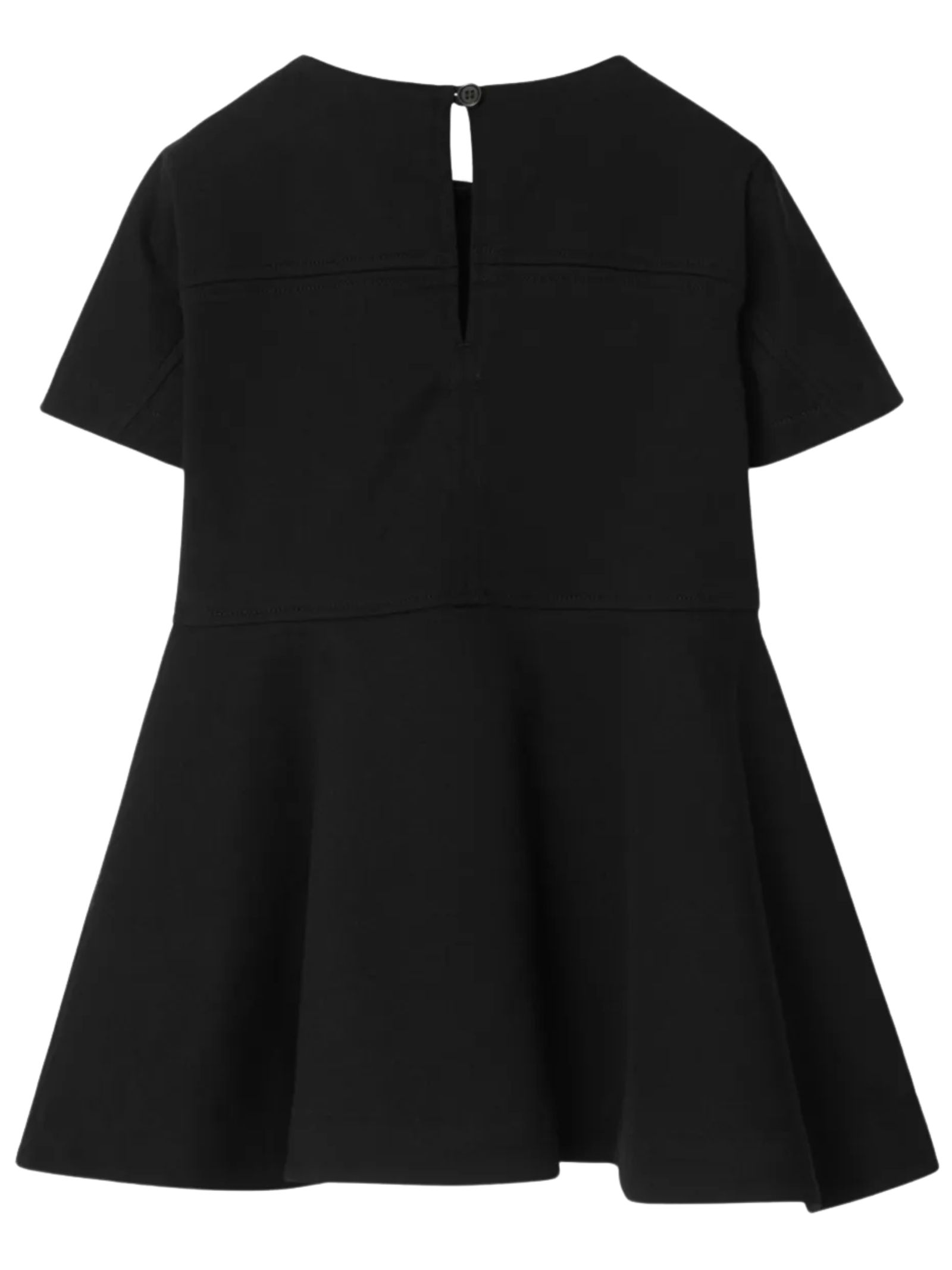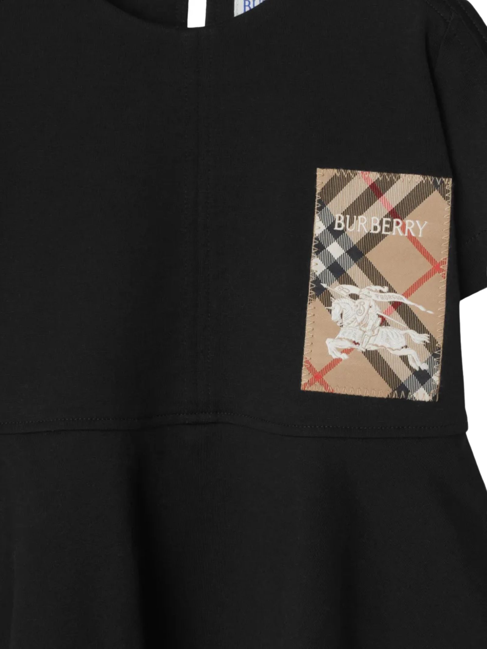 Burberry Kids black jersey dress with a keyhole back, a round neckline, a signature Equestrian Knight motif patch on the chest, short sleeves, and a flared skirt. Composition: 100% cotton.