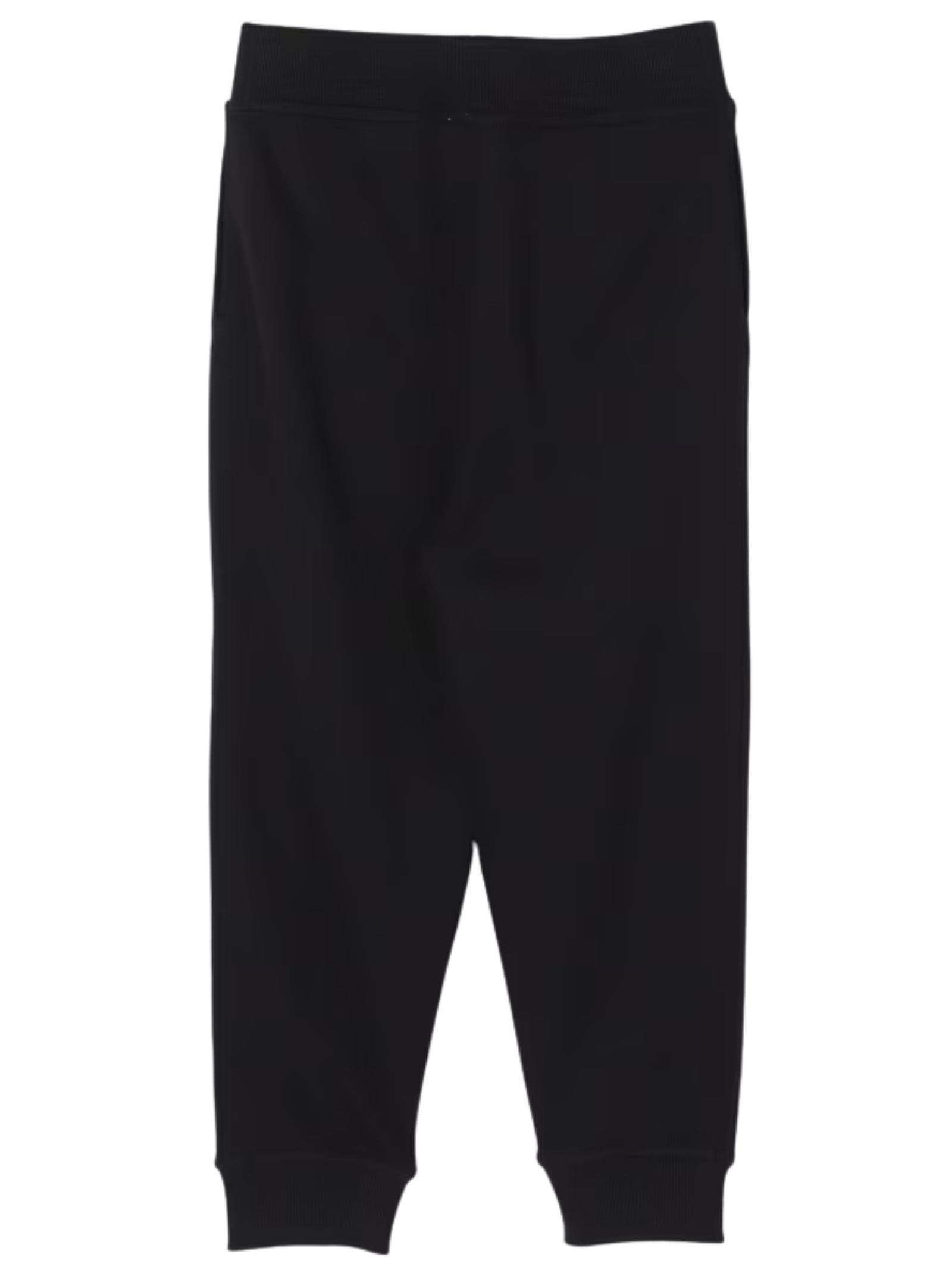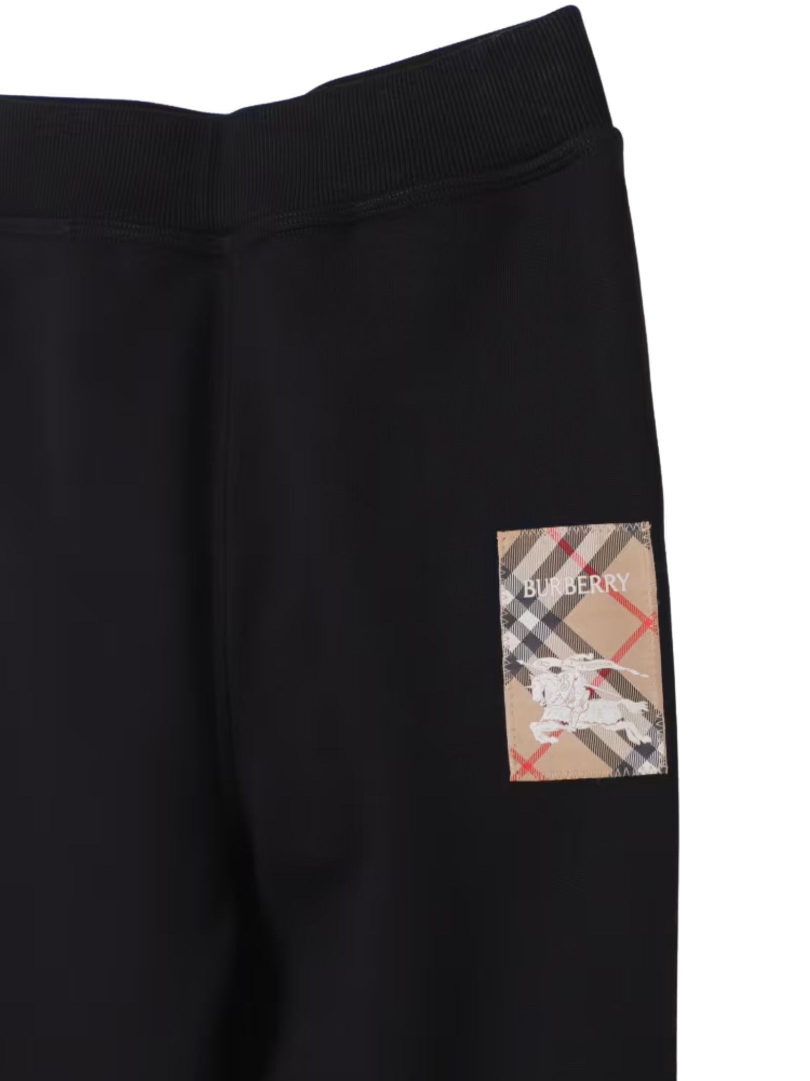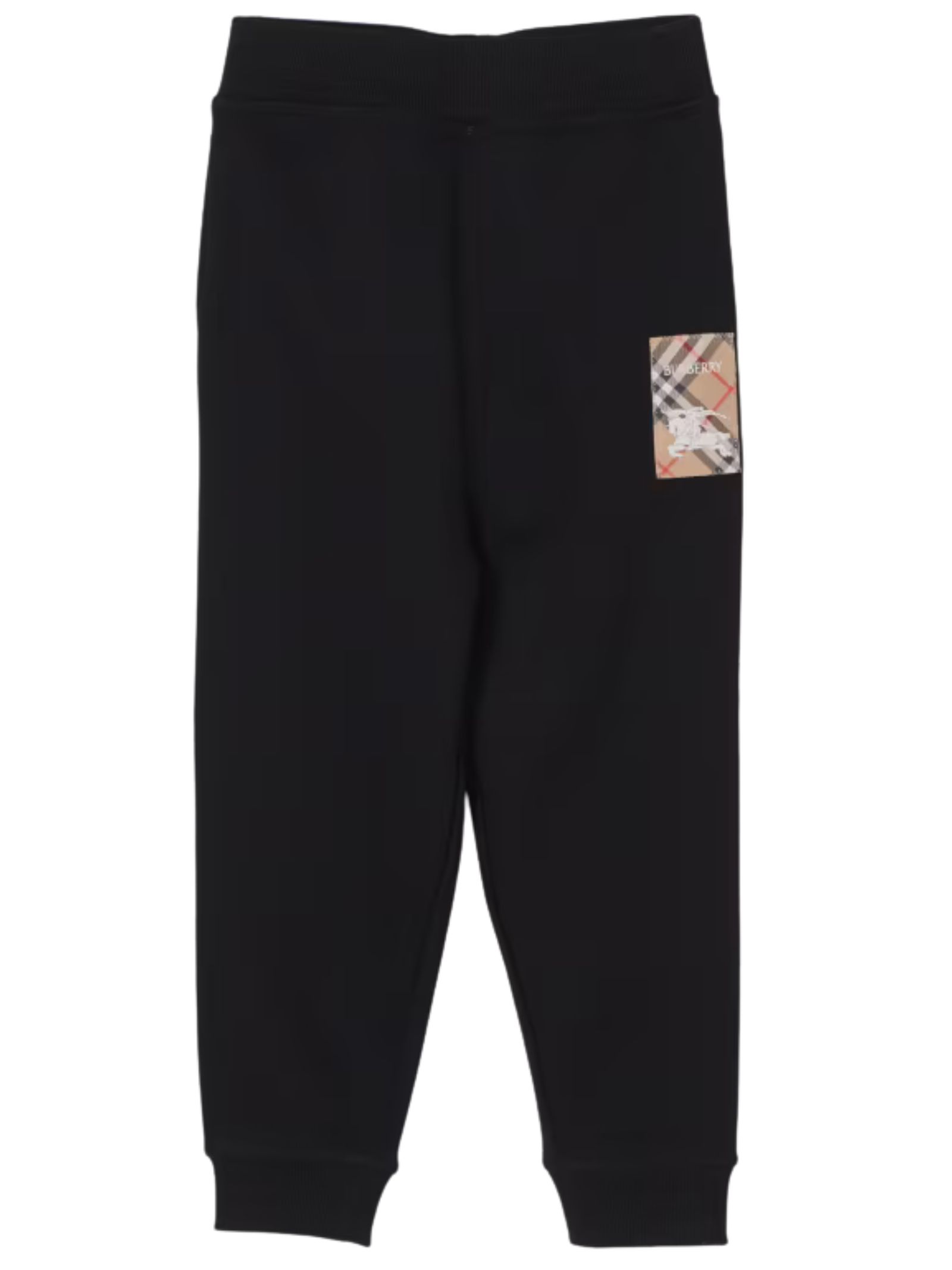 Burberry Kids black trousers with an elasticated waist, a signature Equestrian Knight motif patch on one side, elasticated ankles, and a regular fit. Composition: 100% cotton.