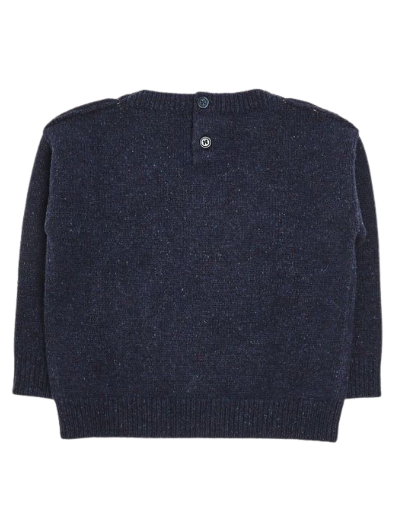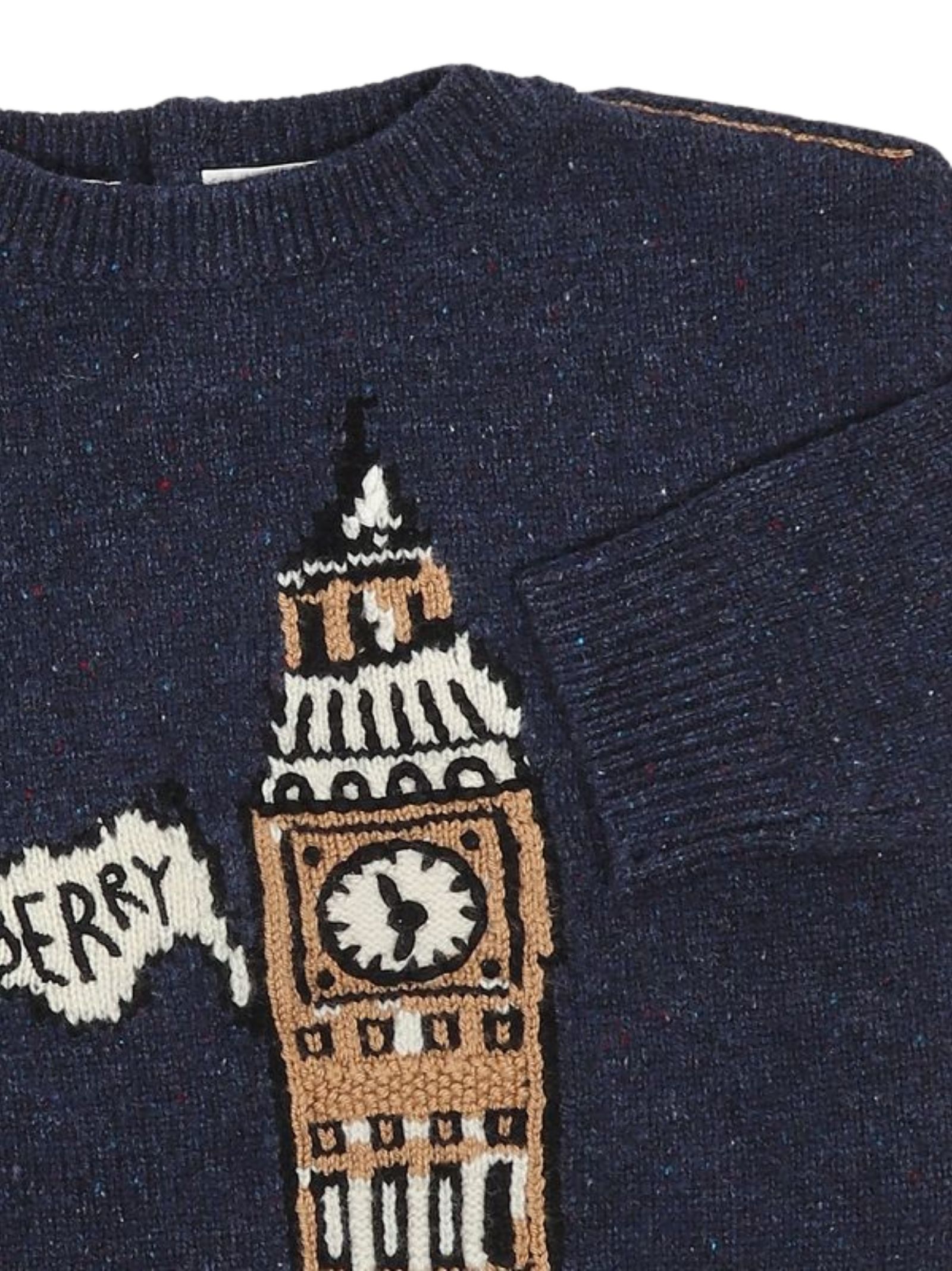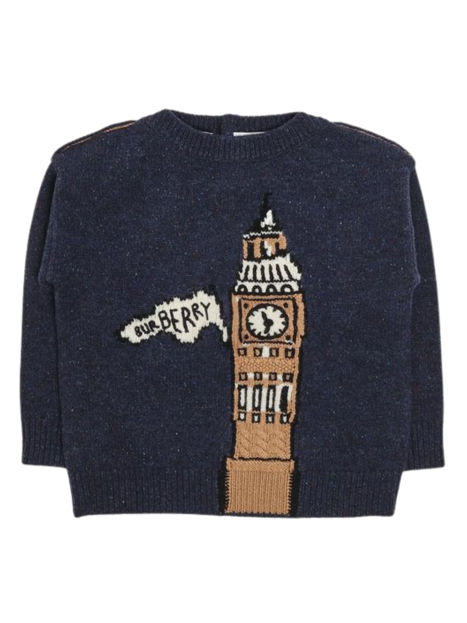 Burberry Kids blue knitted sweater, crew neck, contrasting logo print at the center, back buttons, ribbed cuffs, regular fit. Composition: 100% wool.