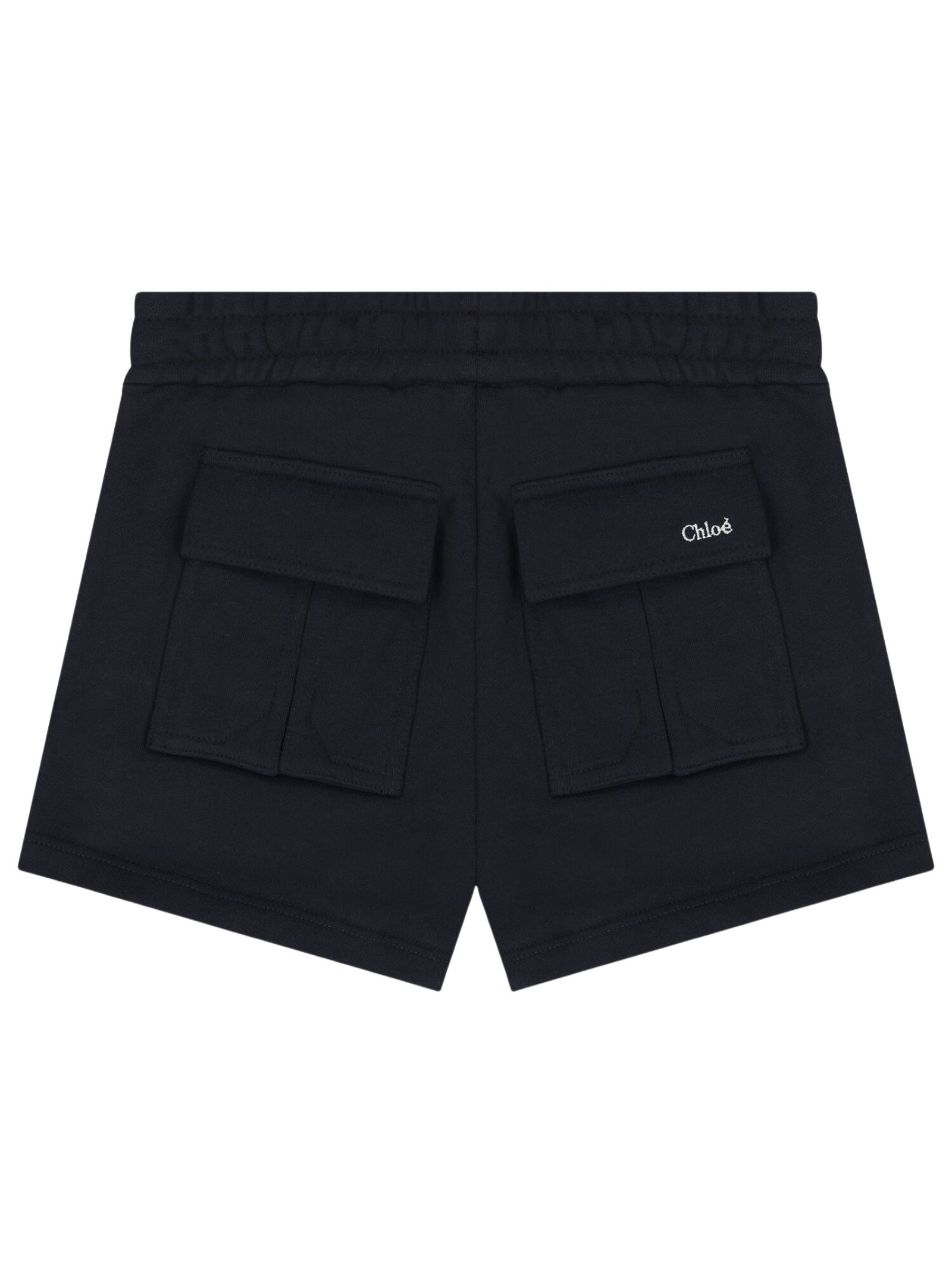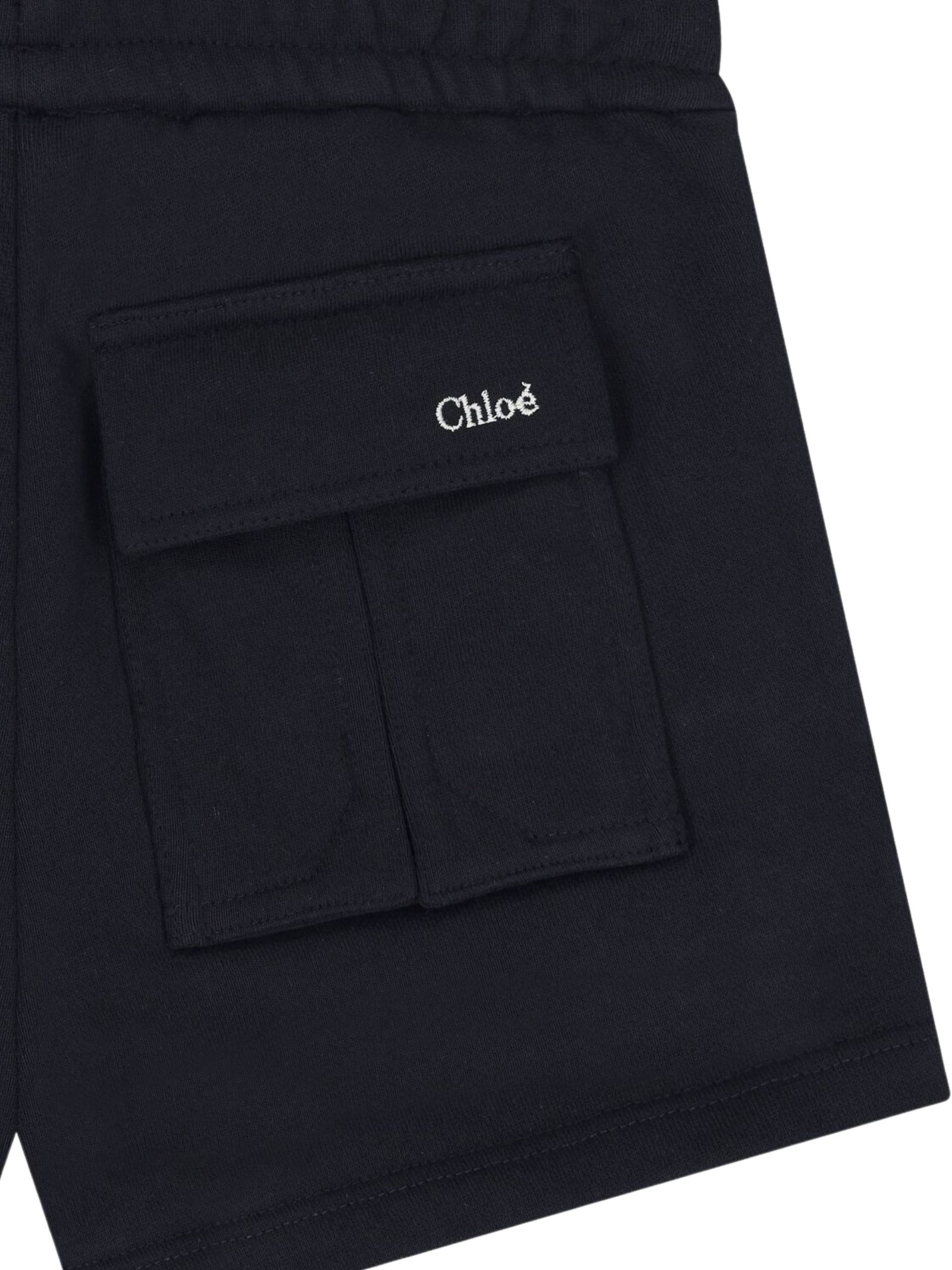 Chloè Kids blue shorts with an elasticated waist and drawstring, two side pockets, two back pockets, embroidered logo on the back, and a regular fit. Composition: 100% cotton.