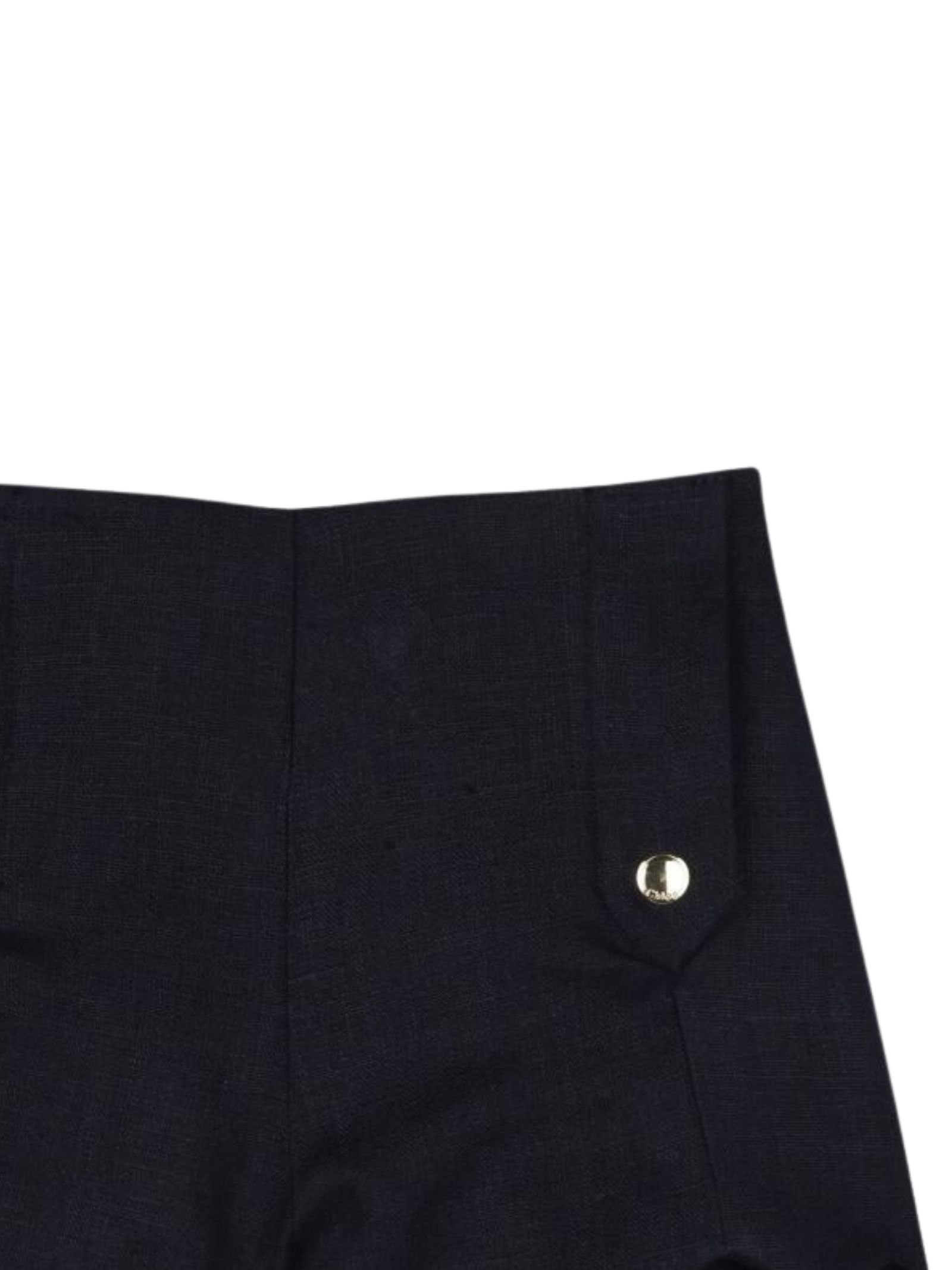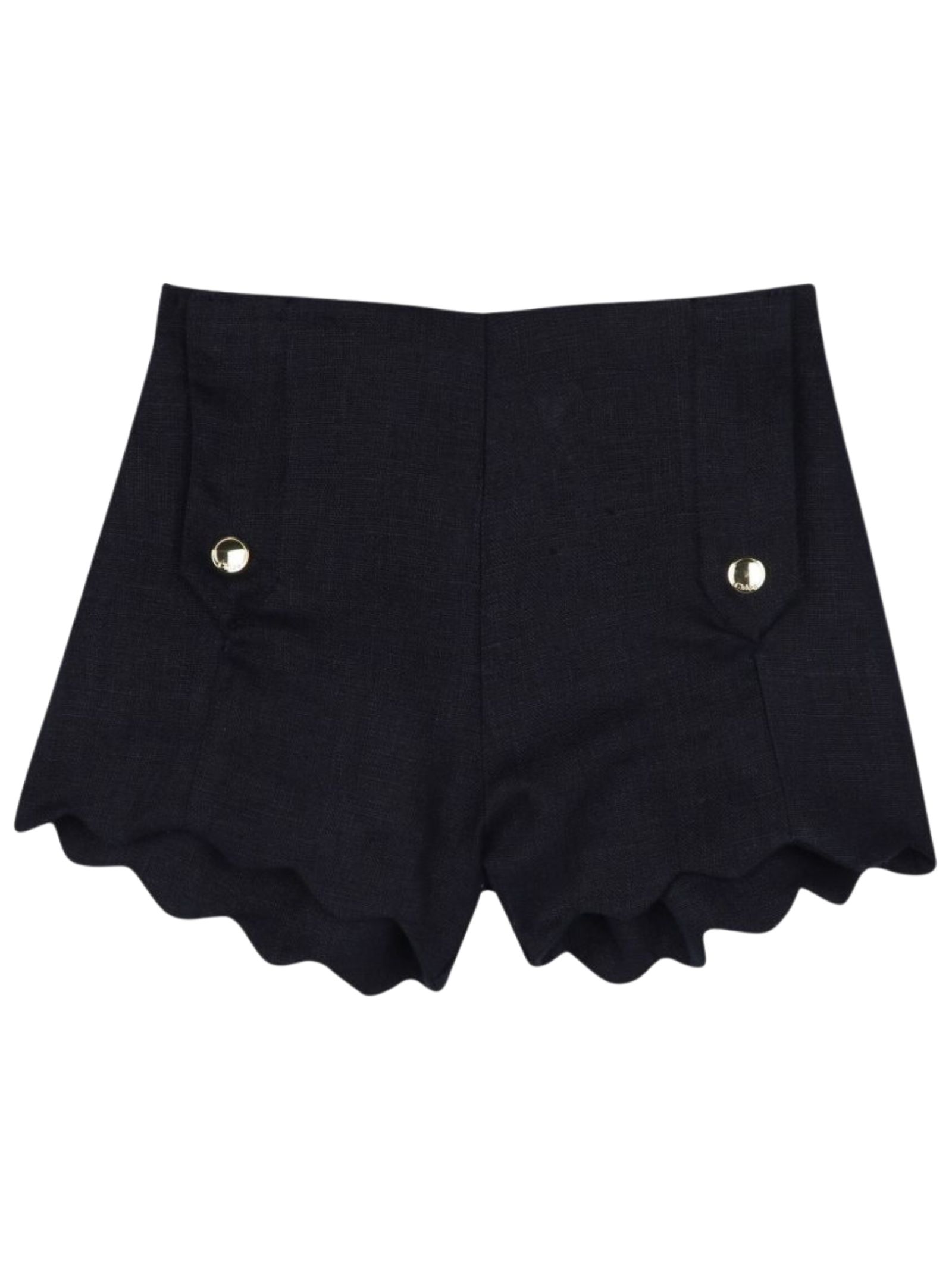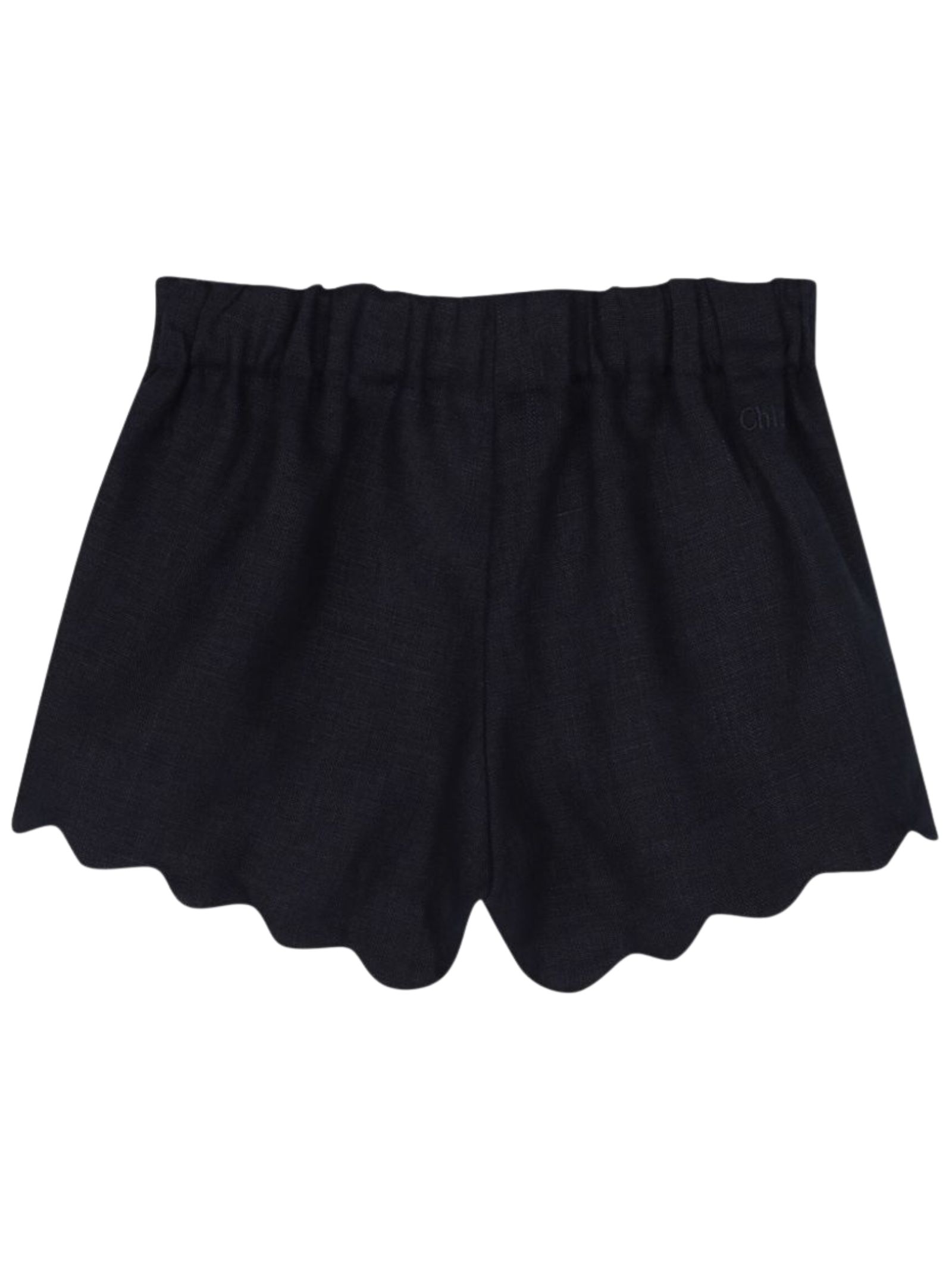 Chloè Kids blue shorts with contrasting gold button detail, elastic waistband at the back, wavy hem, regular fit. Composition: 100% linen.