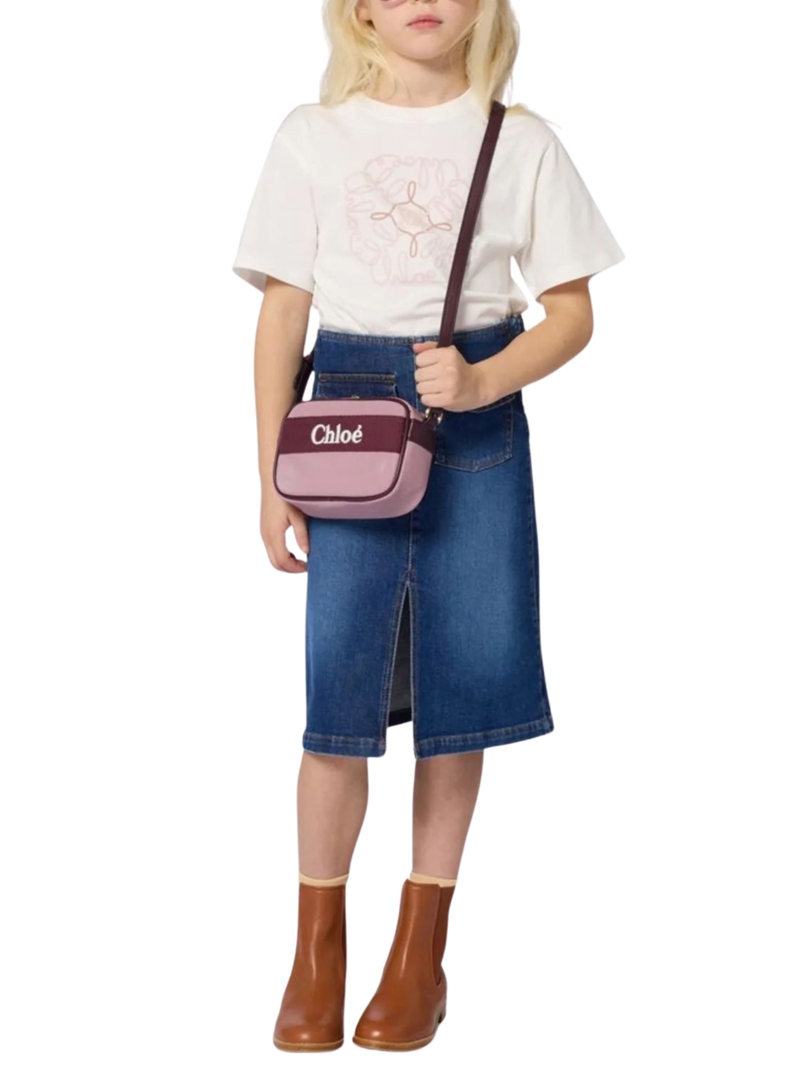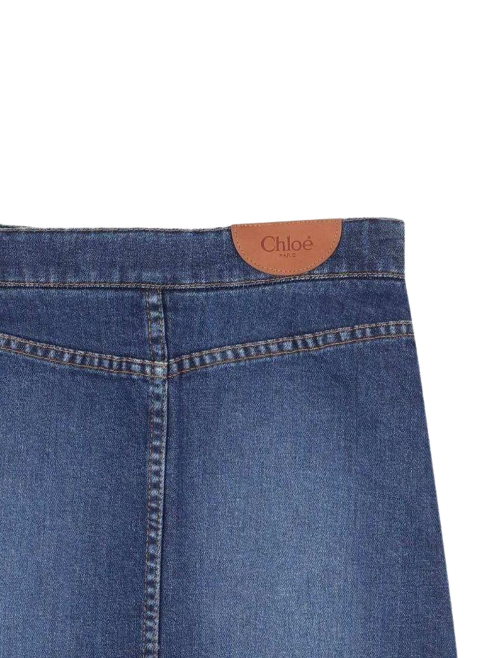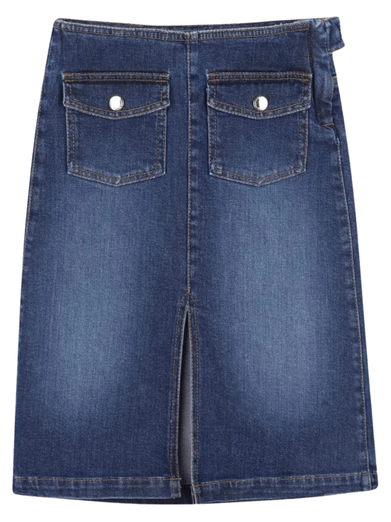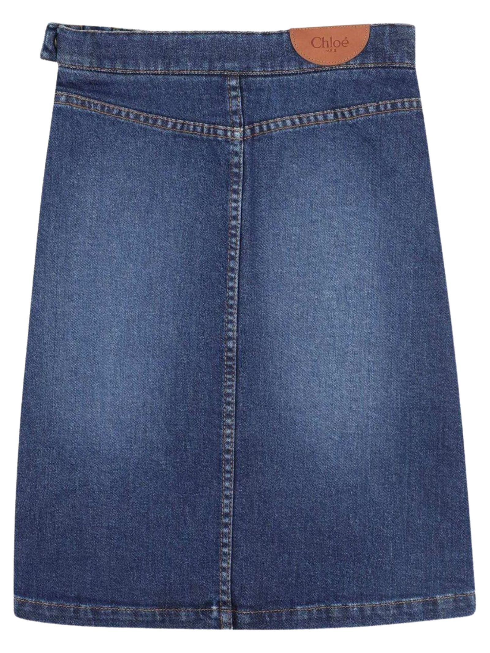 Chloè Kids blue denim cotton midi skirt with a regular waist, a front slit, two back flap pockets, a logo patch at the waist, and tone-on-tone stitching. Composition: 99% cotton, 1% elastane.