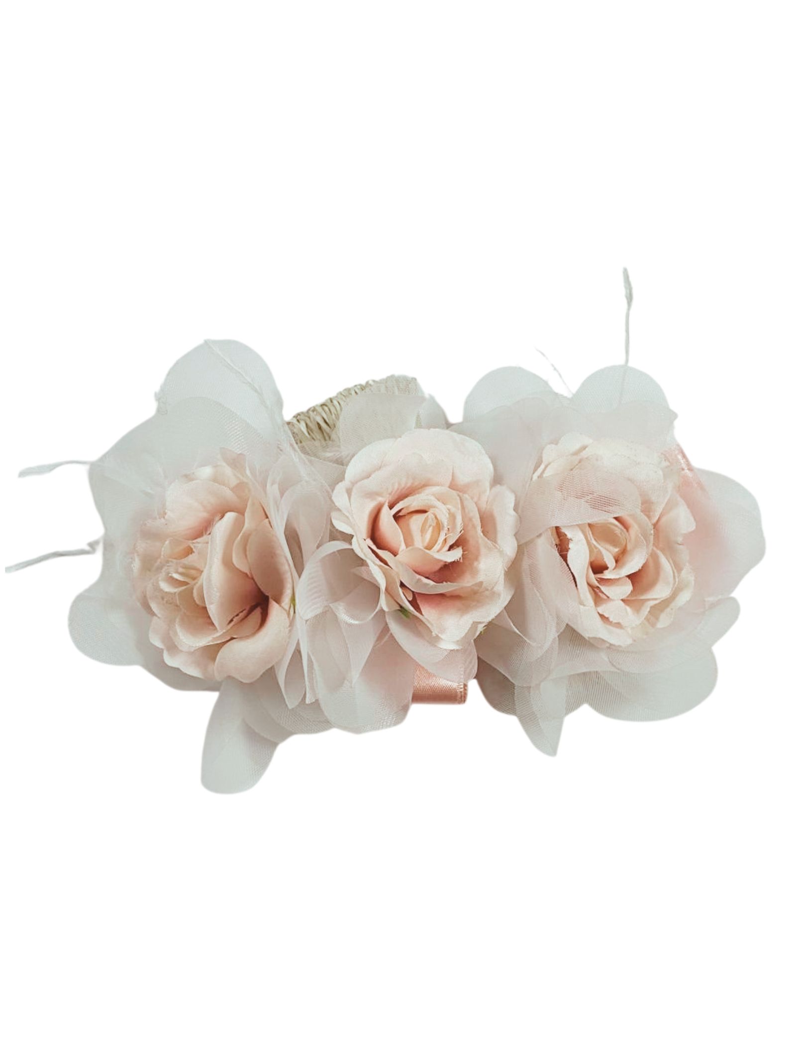 Colorichiari Kids white hair clip with light pink flowers, tulle details with feathers.