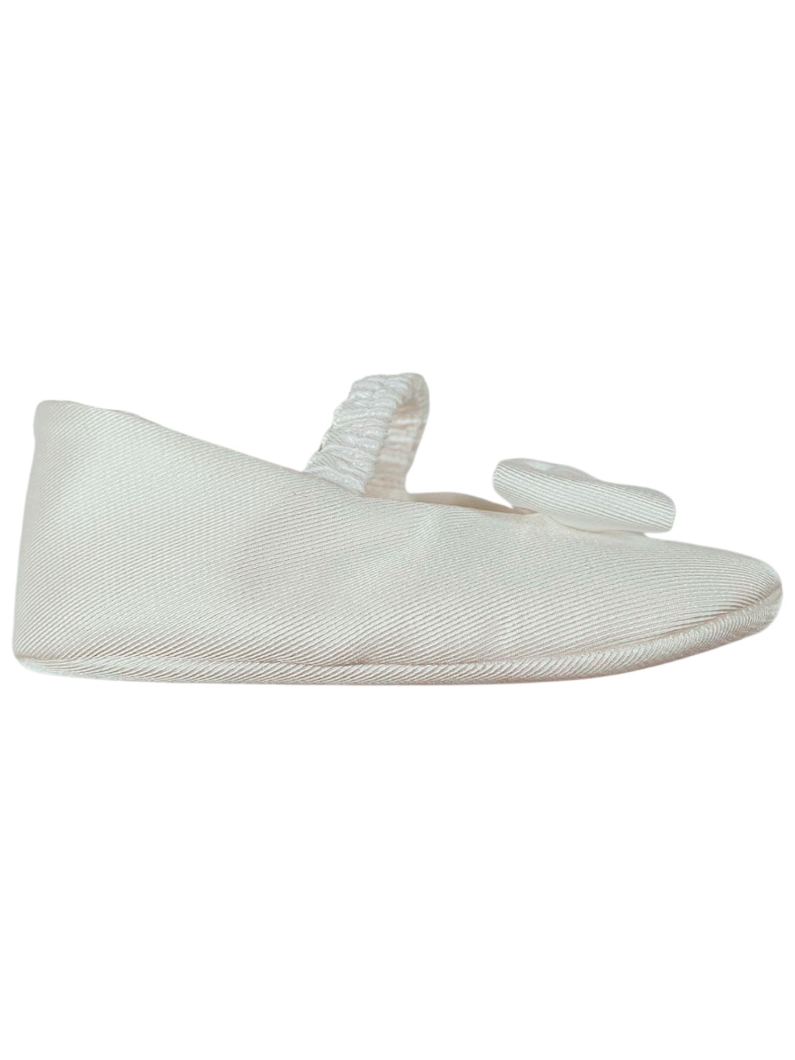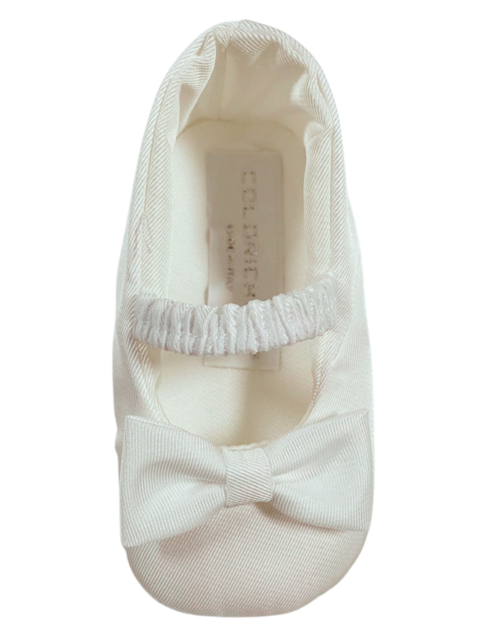 Colorichiari Kids pre-walk shoes made of white grosgrain cotton, ballerina style, round toe, bow appliqué, elastic detail, and logo insole. Composition: 80% cotton, 20% polyamide. Made in Italy.