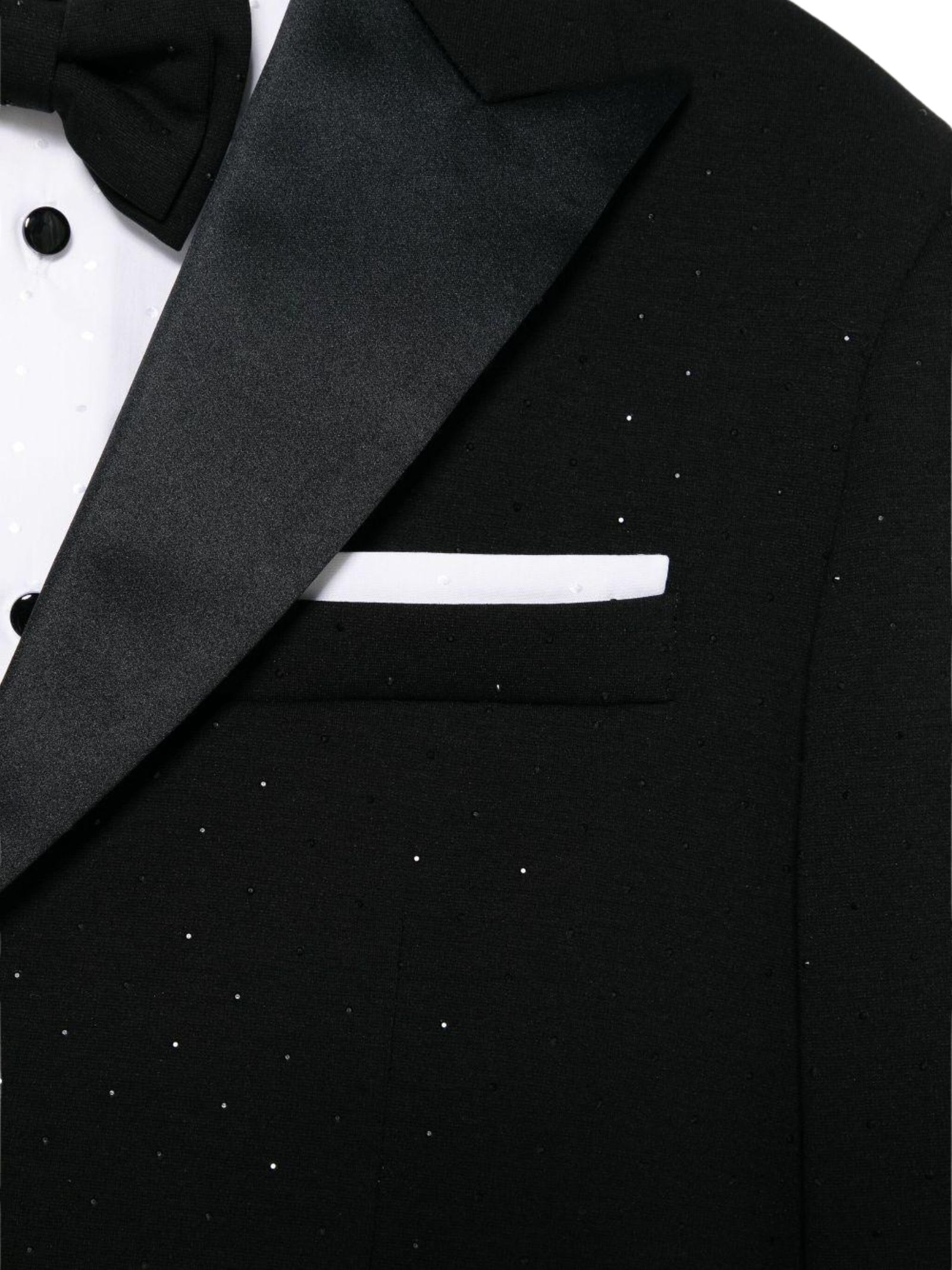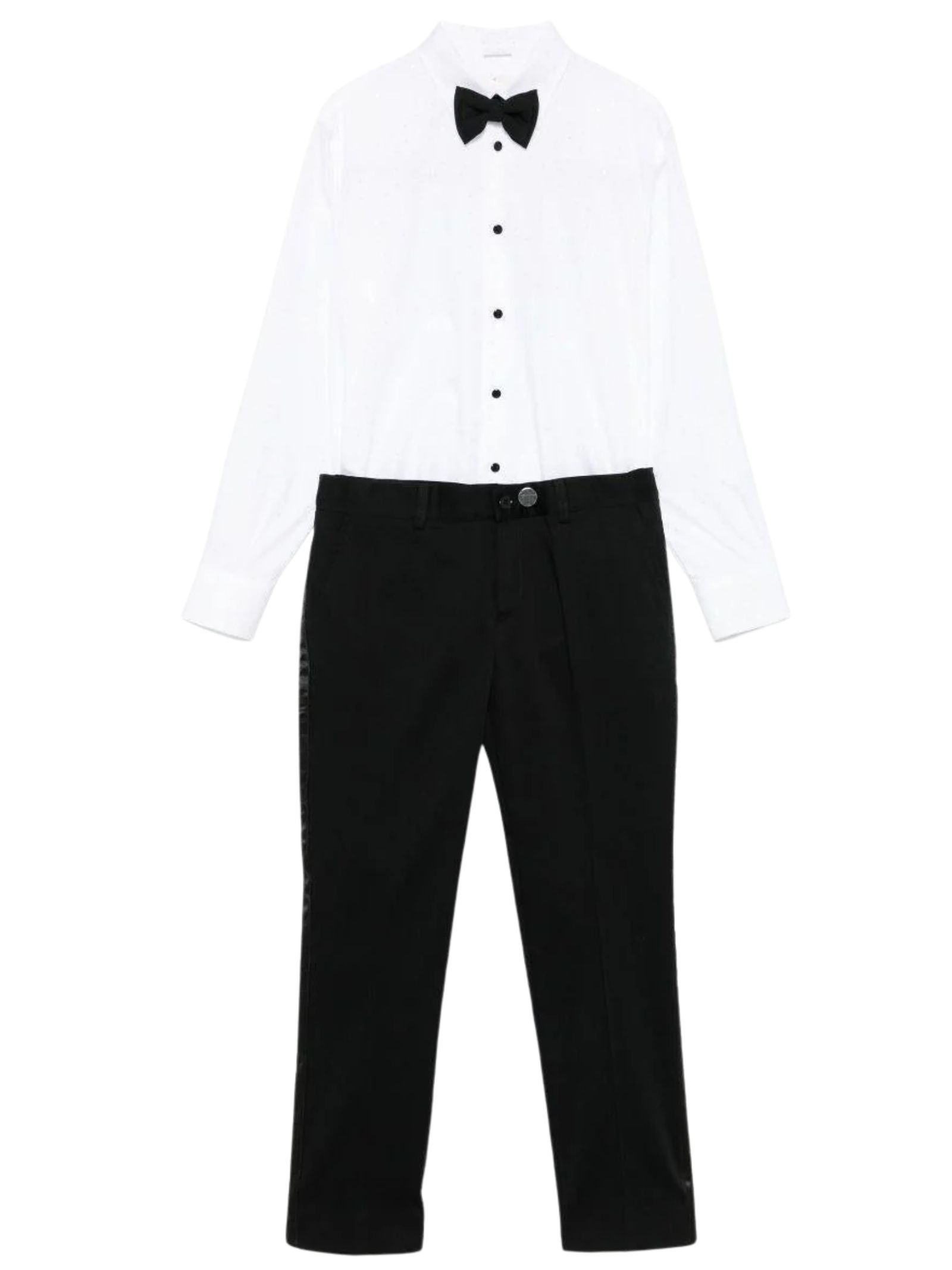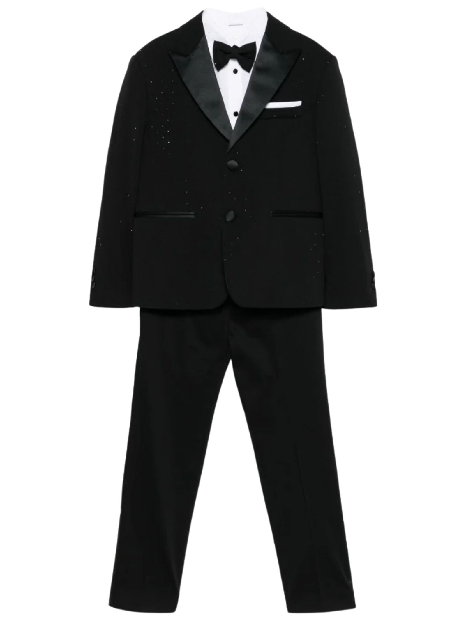 Colorichiari Kids black formal suit, consisting of a two-button jacket with rhinestone detail, peak collar, viscose lining, and satin trim; a white shirt with polka dot embroidery; a matching bow tie and handkerchief; and classic trousers with a regular waist and satin side bands, a regular fit. Jacket: 52% cotton, 40% polyamide, 8% elastane. Shirt: 60% cotton, 40% viscose. Trousers: 97% cotton, 3% elastane. Made in Italy