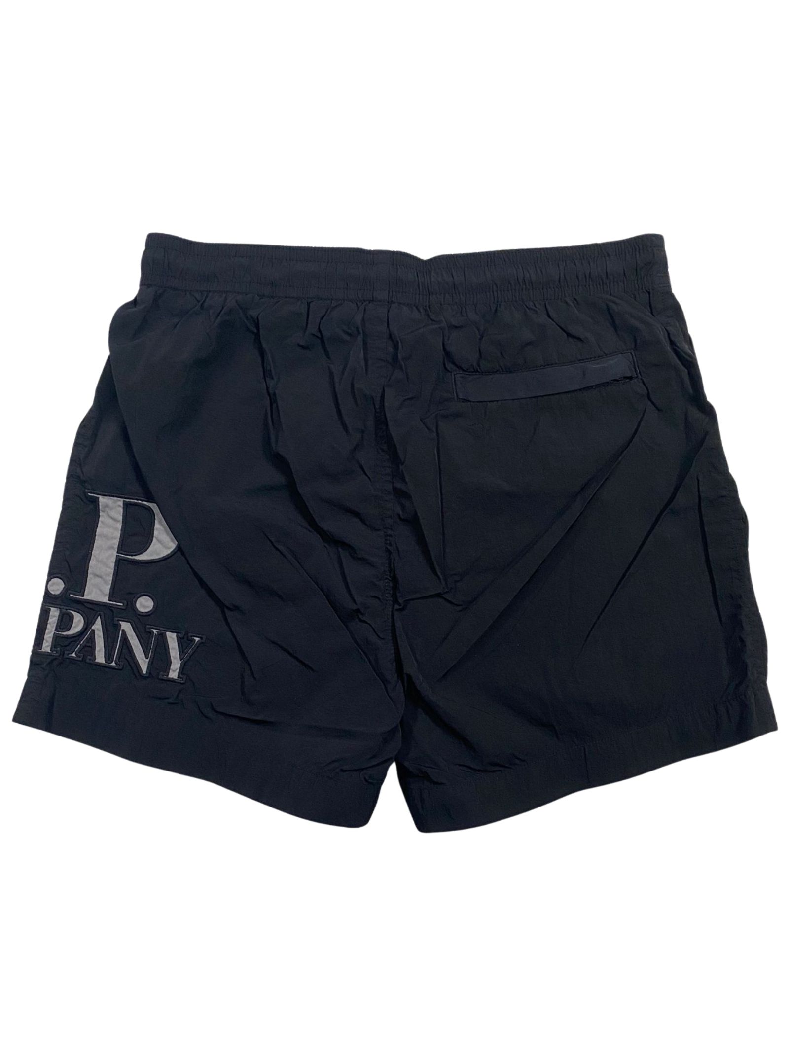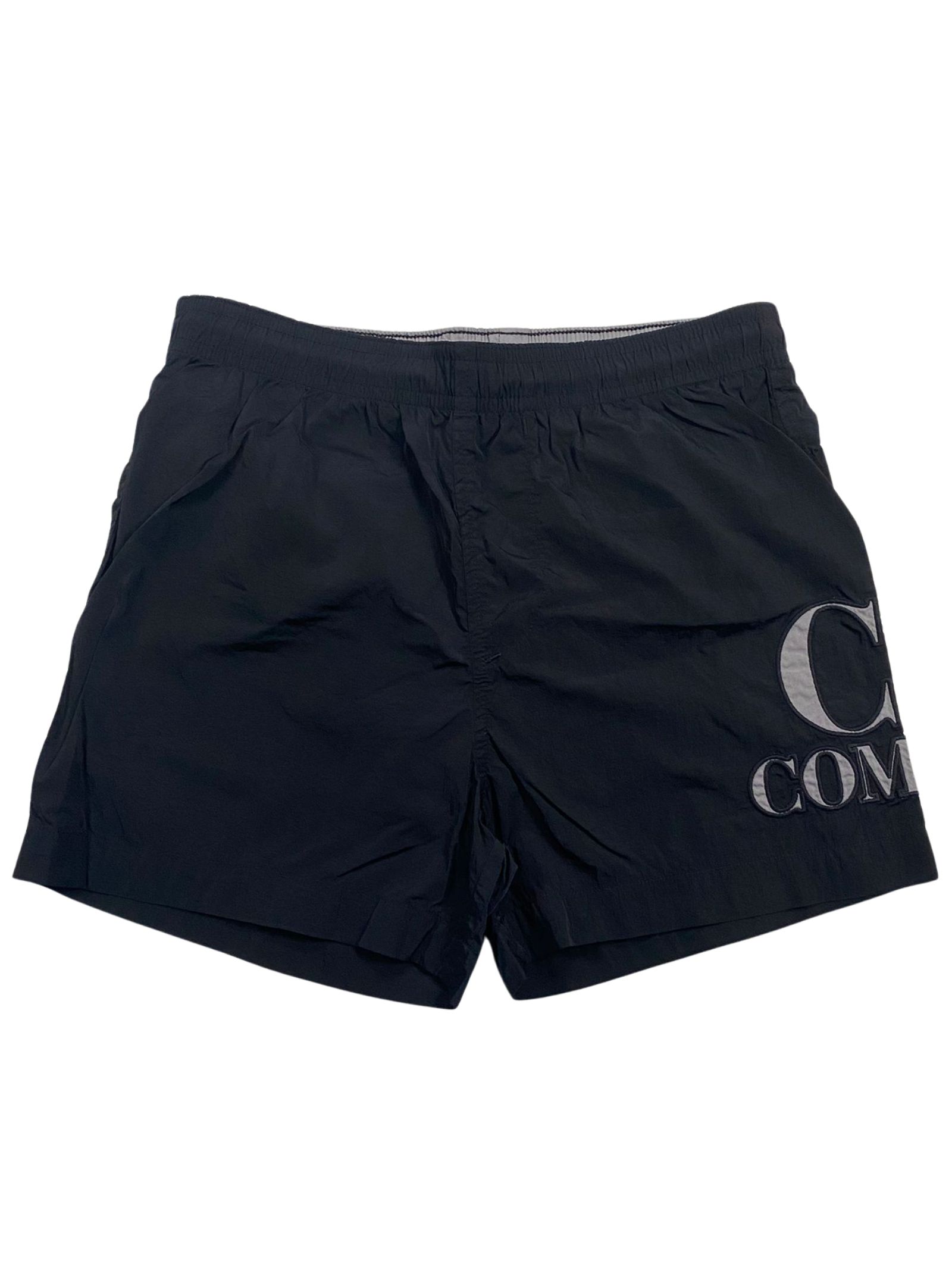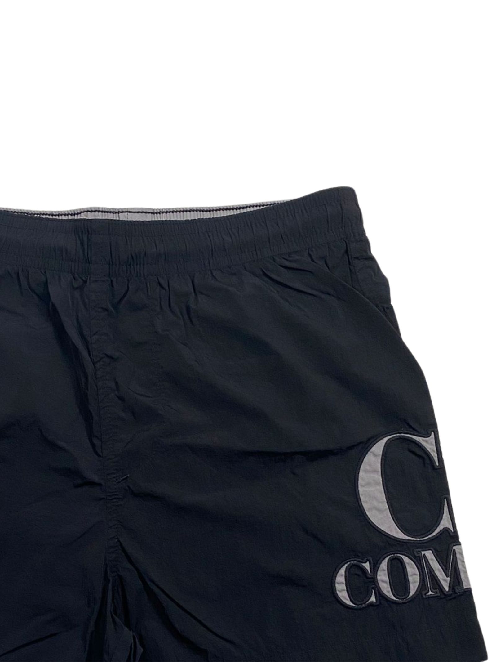 CP Company Kids' midnight blue swimsuit, elasticated waist with internal drawstring, side print with embroidered logo on the leg, above-the-knee length. Composition: 100% polyamide.