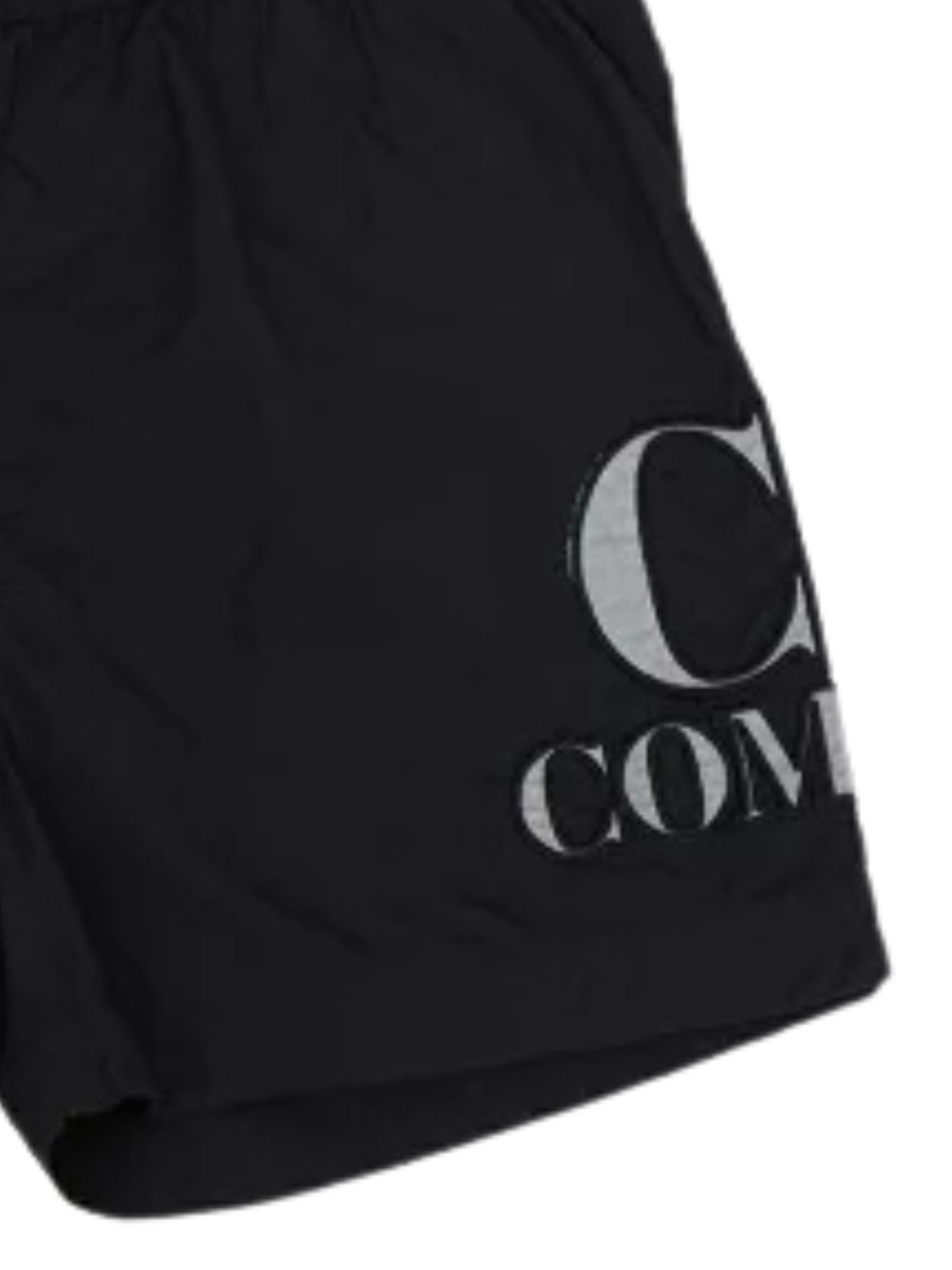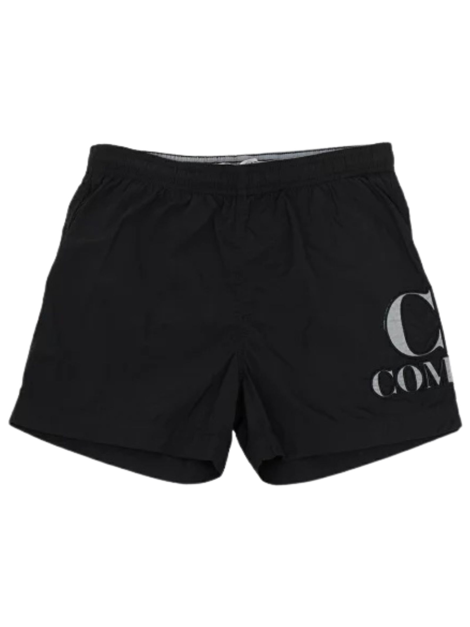 CP Company Kids black swimsuit, elasticated waist with internal drawstring, side print with embroidered logo on the leg, above-the-knee length. Composition: 100% polyamide.