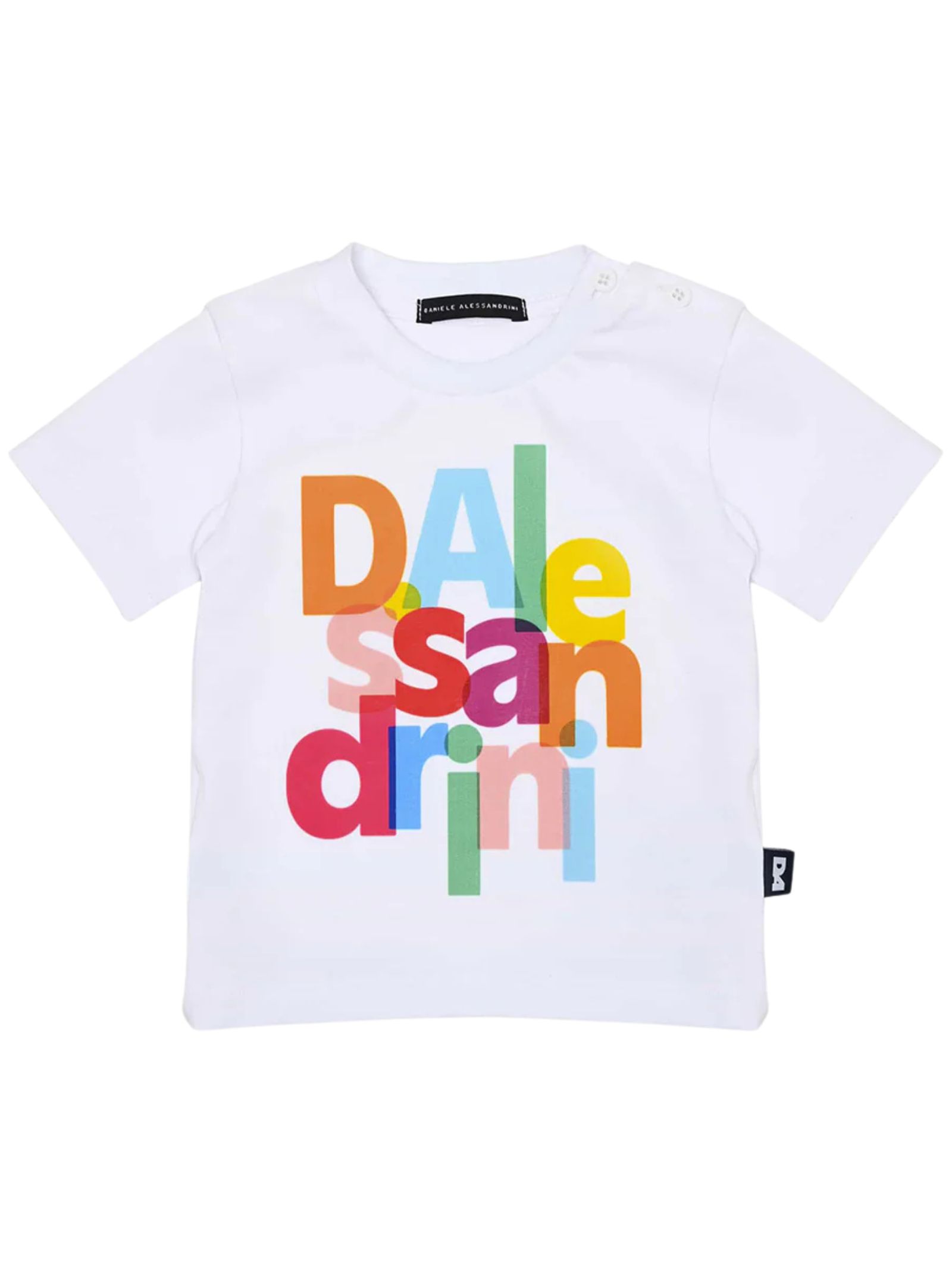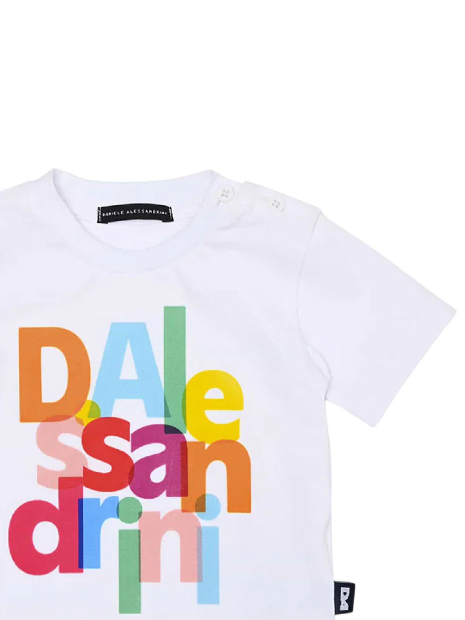 Daniele Alessandrini Kids white T-shirt, crew neck, short sleeves, contrasting multicolor logo print at the center, button closure on the shoulder, straight hem, regular fit. Composition: 95% cotton 5% elastane. Made in Italy.