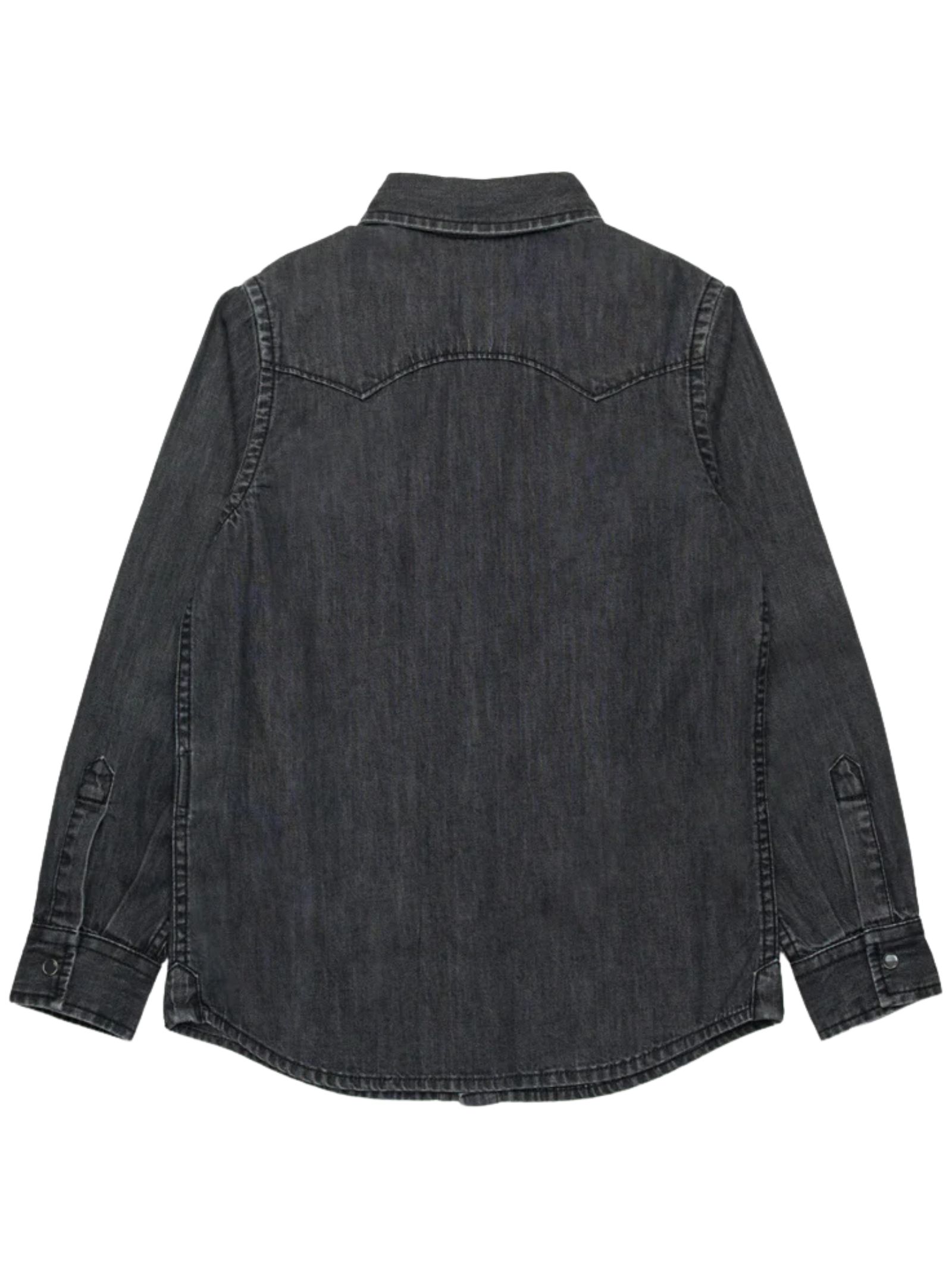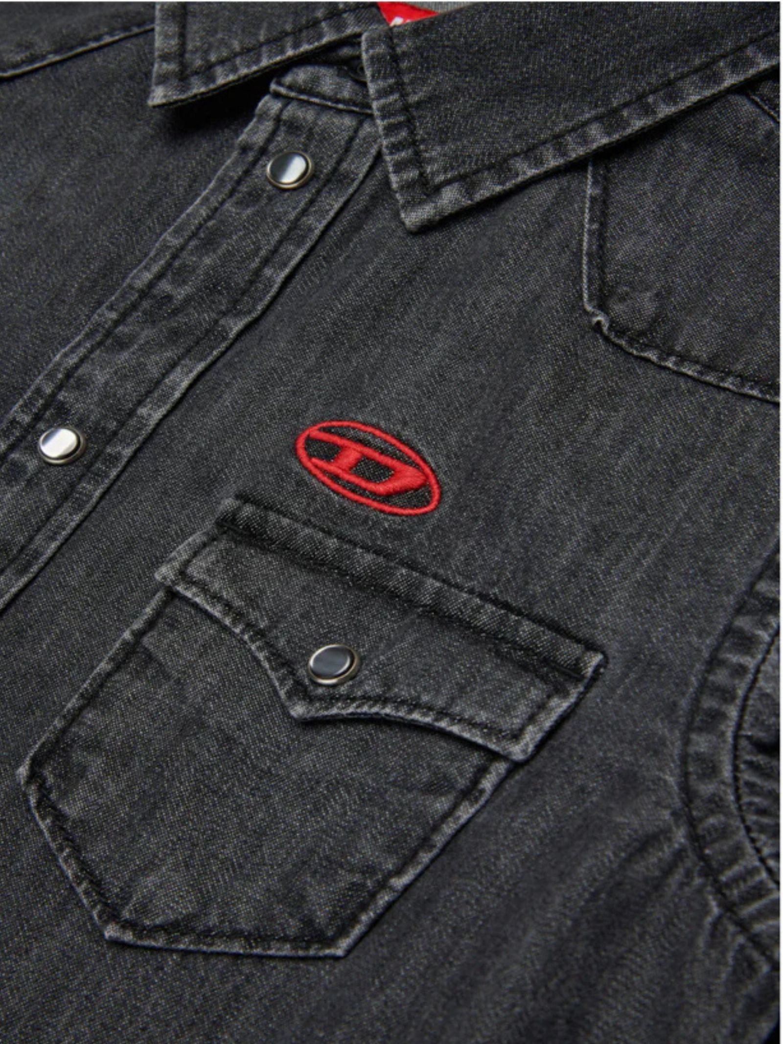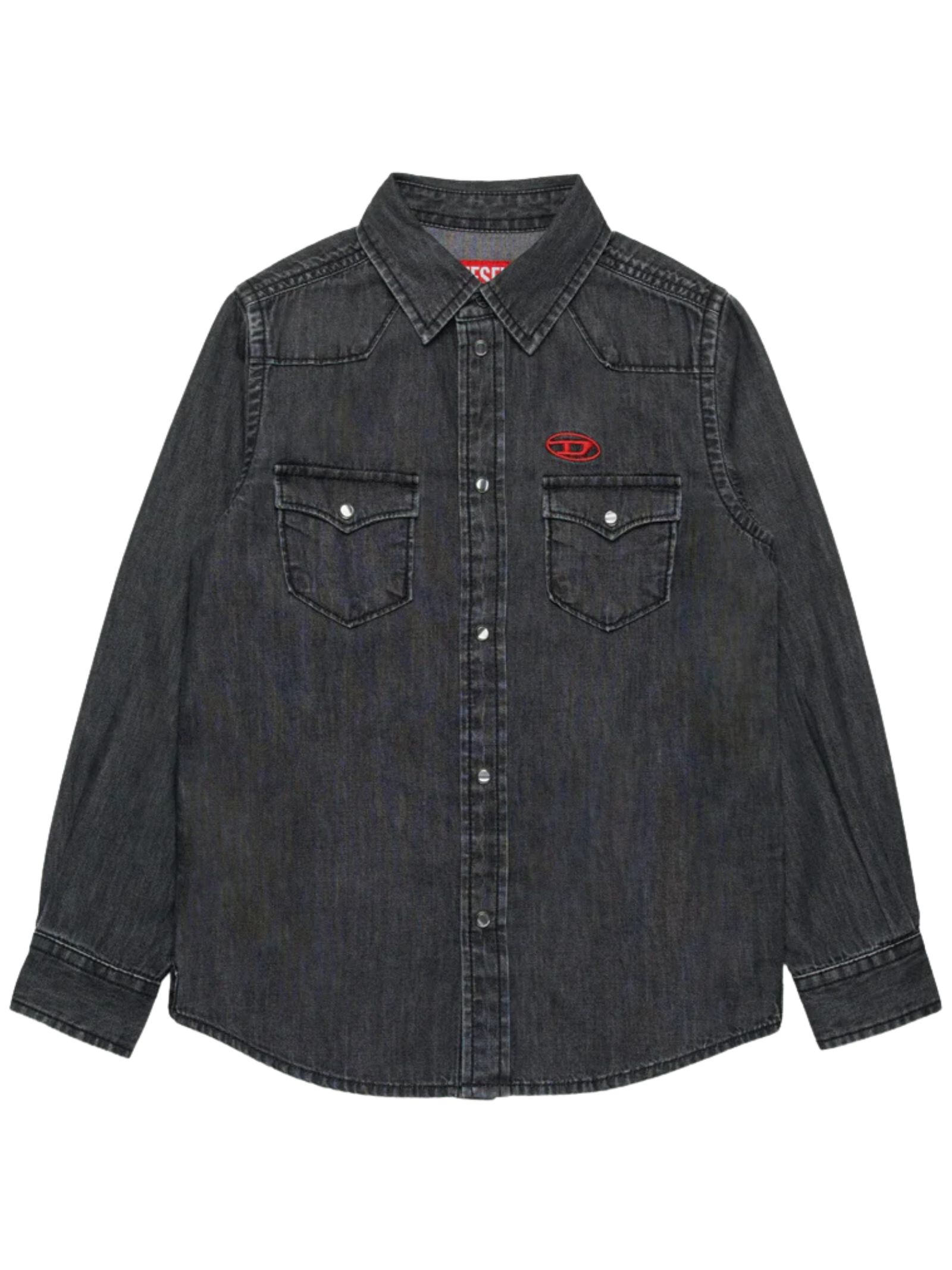 Diesel Kids black cotton denim shirt, long sleeves, pointed collar, front snap button closure and front pockets, decorated with a contrasting red embroidered logo on the chest, regular fit, curved hem. Composition: 100% cotton.