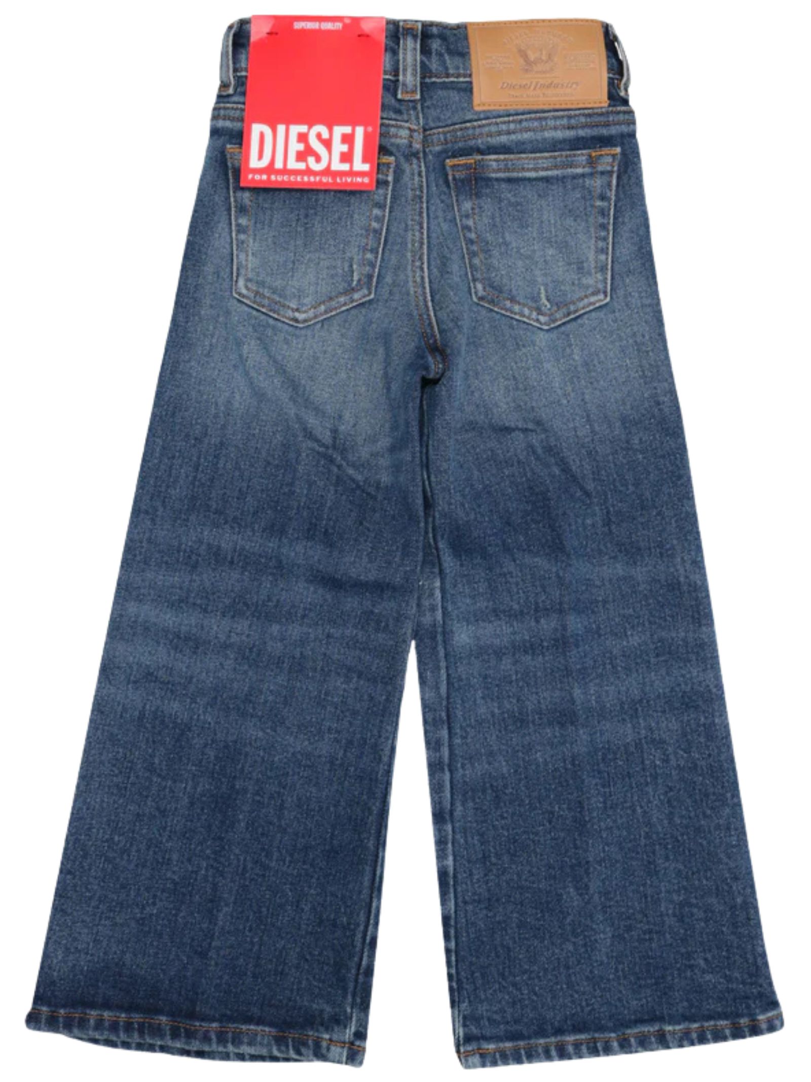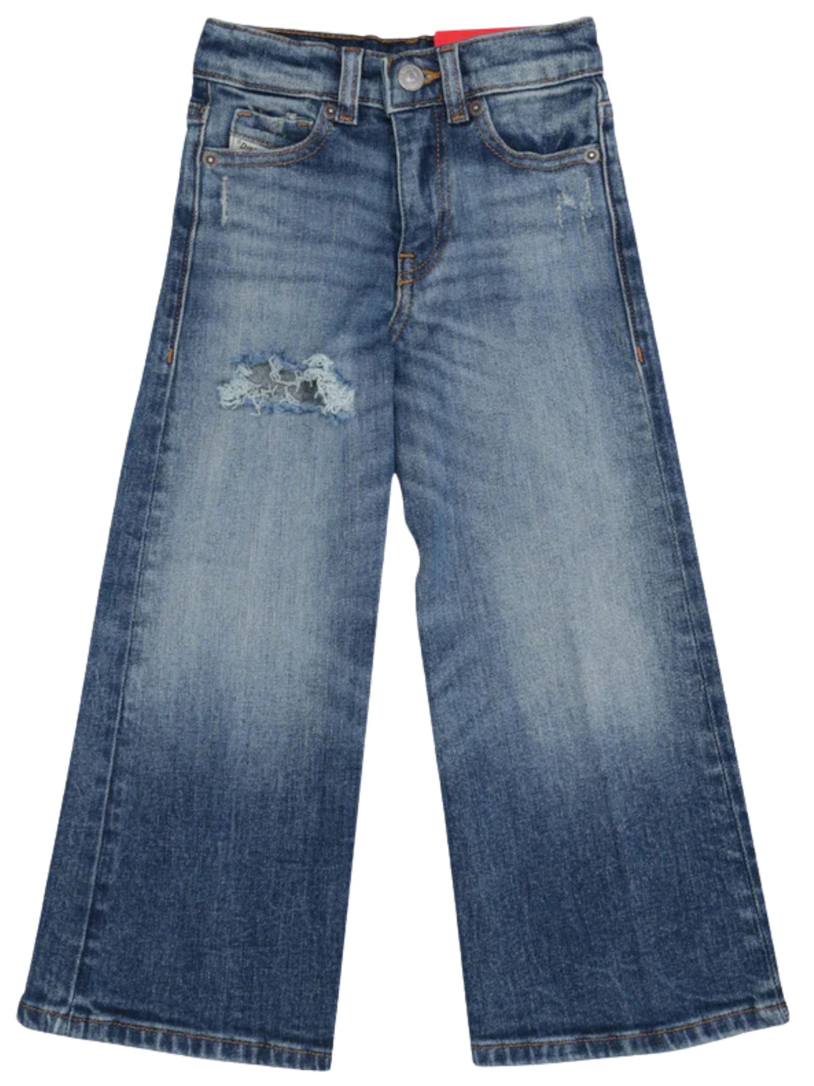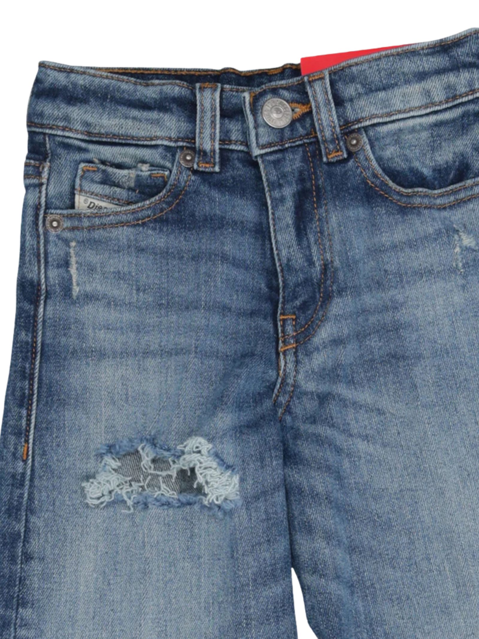 Diesel Kids medium-dark blue wash jeans, regular-waisted, five-pocket design, featuring faded and torn details for a vintage effect, iconic brand patch detail on the back, loose fit. Composition: 99% cotton, 1% elastane.