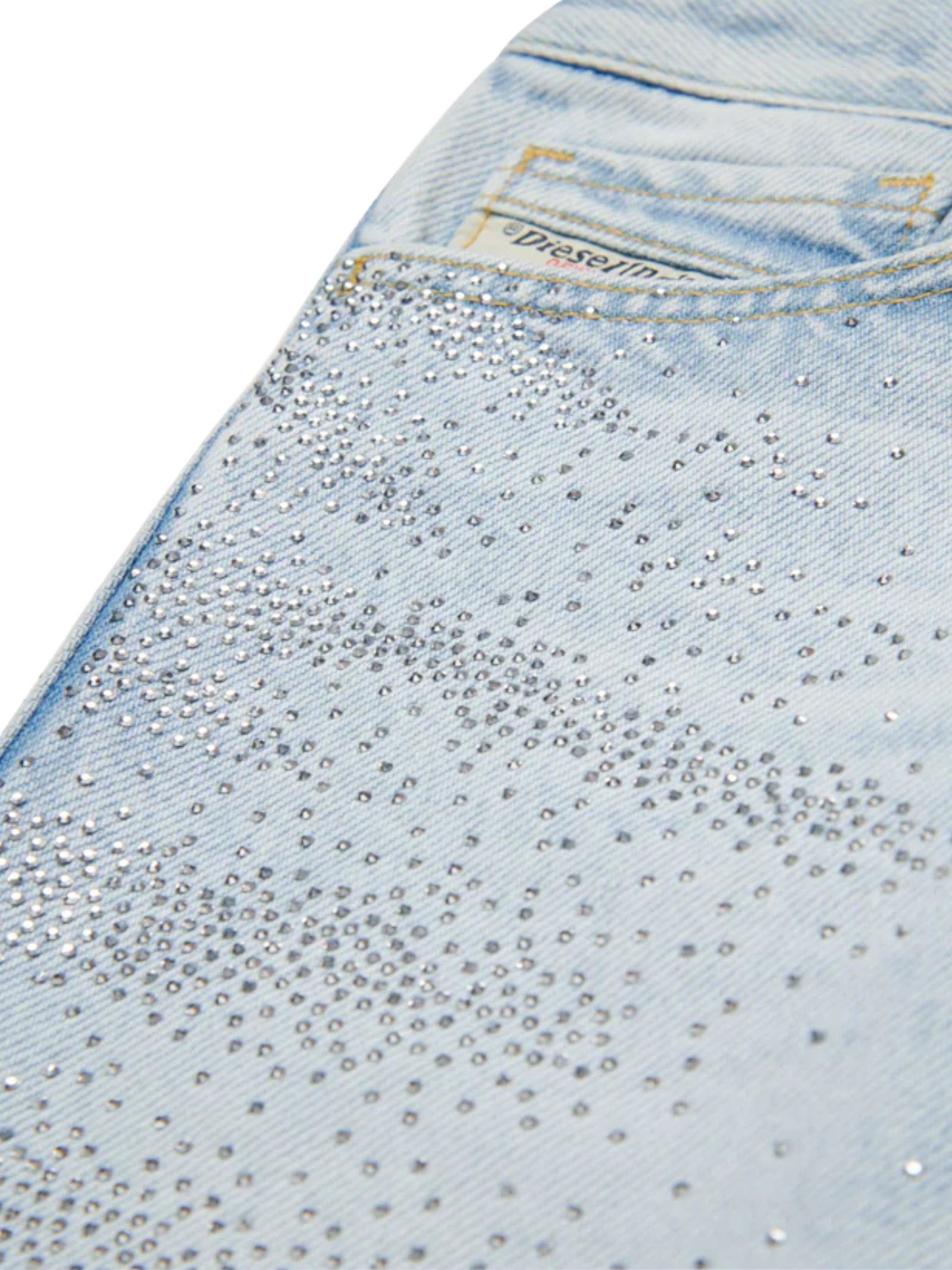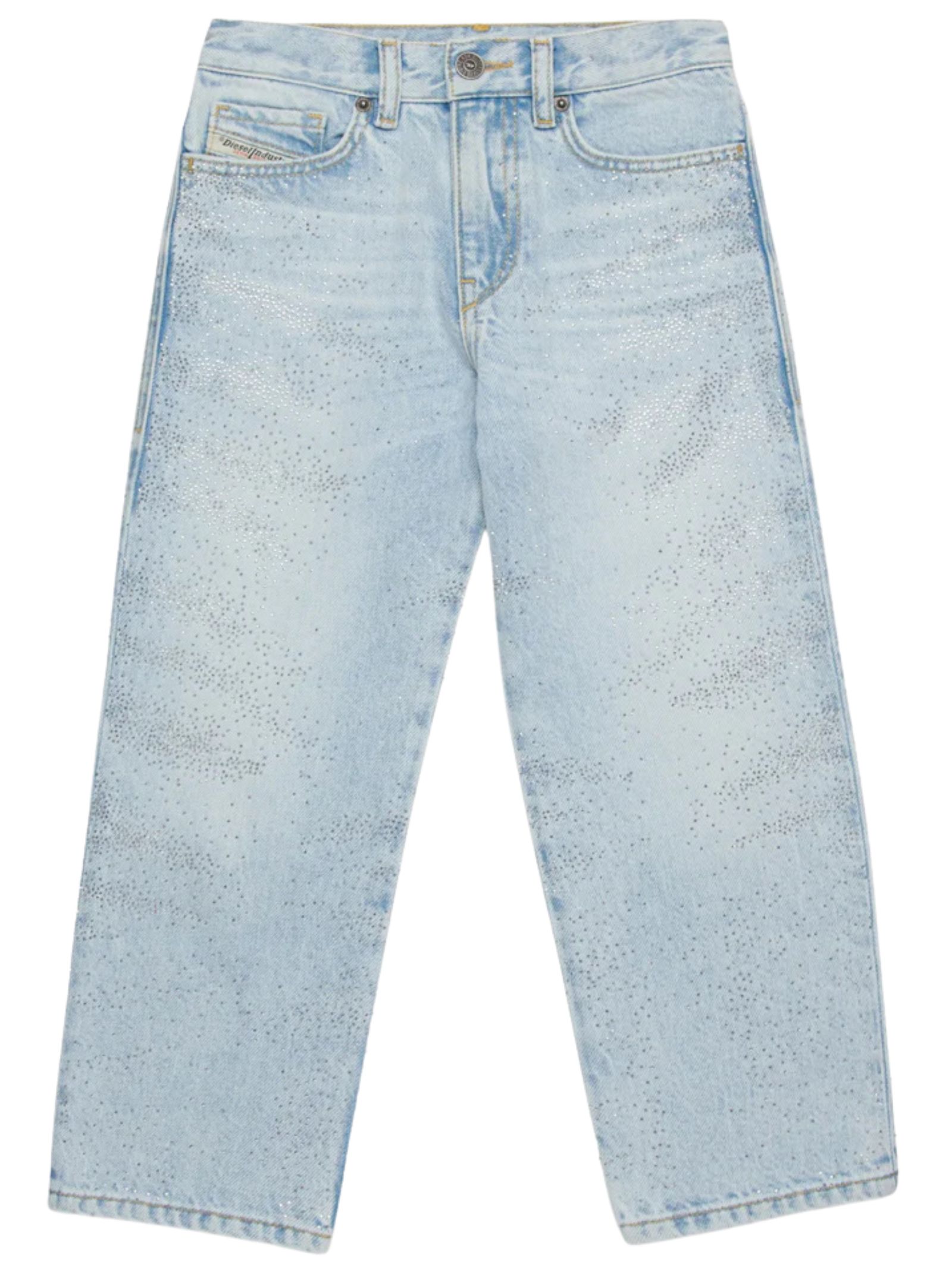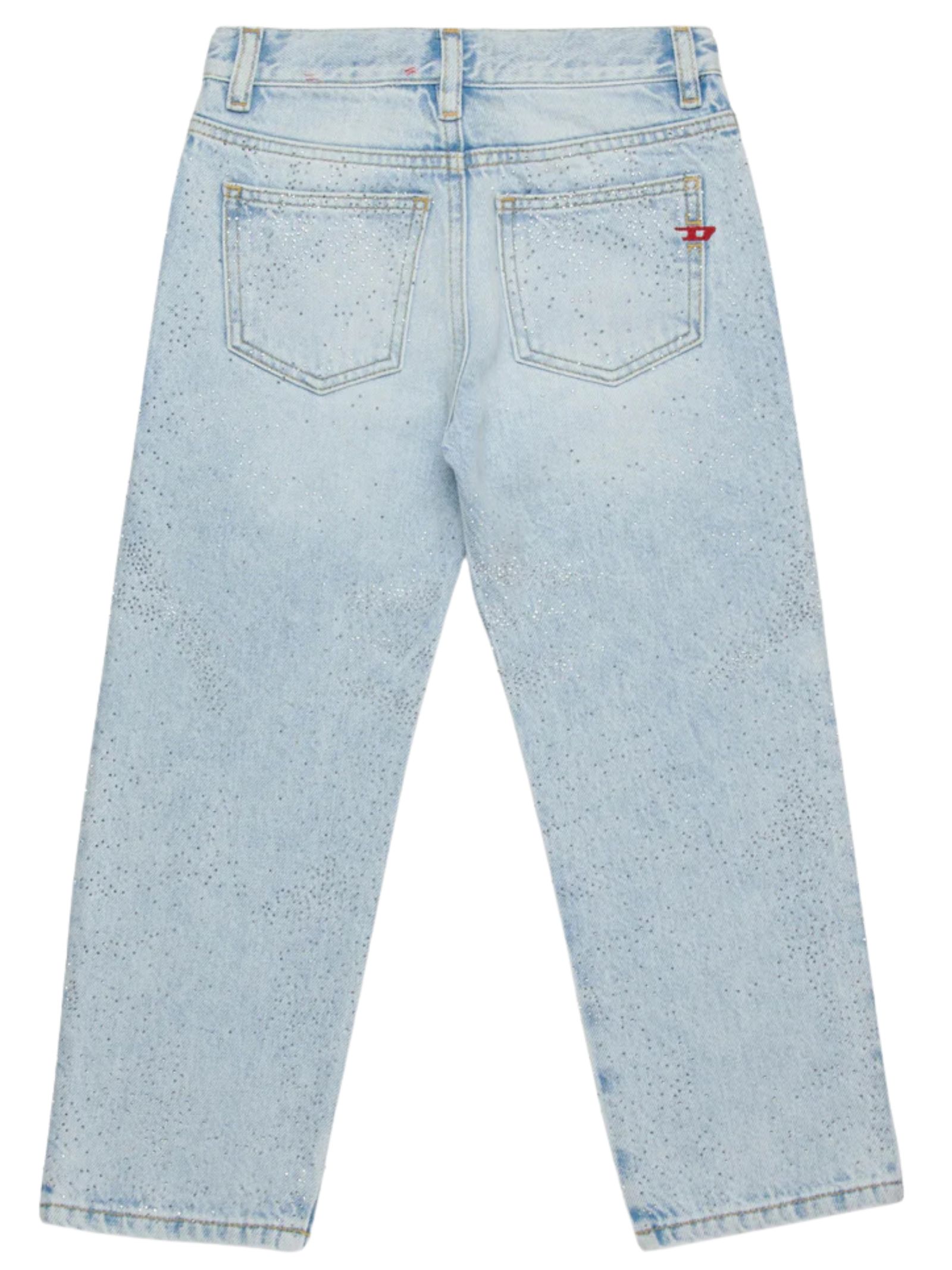 Diesel Kids light-wash jeans, embellished with bright rhinestones all over, regular-waisted design, five-pocket design, iconic brand patch detail on the back, regular fit. Composition: 100% cotton.