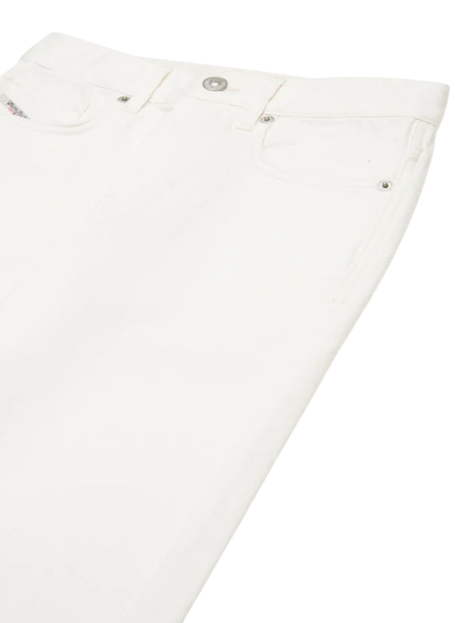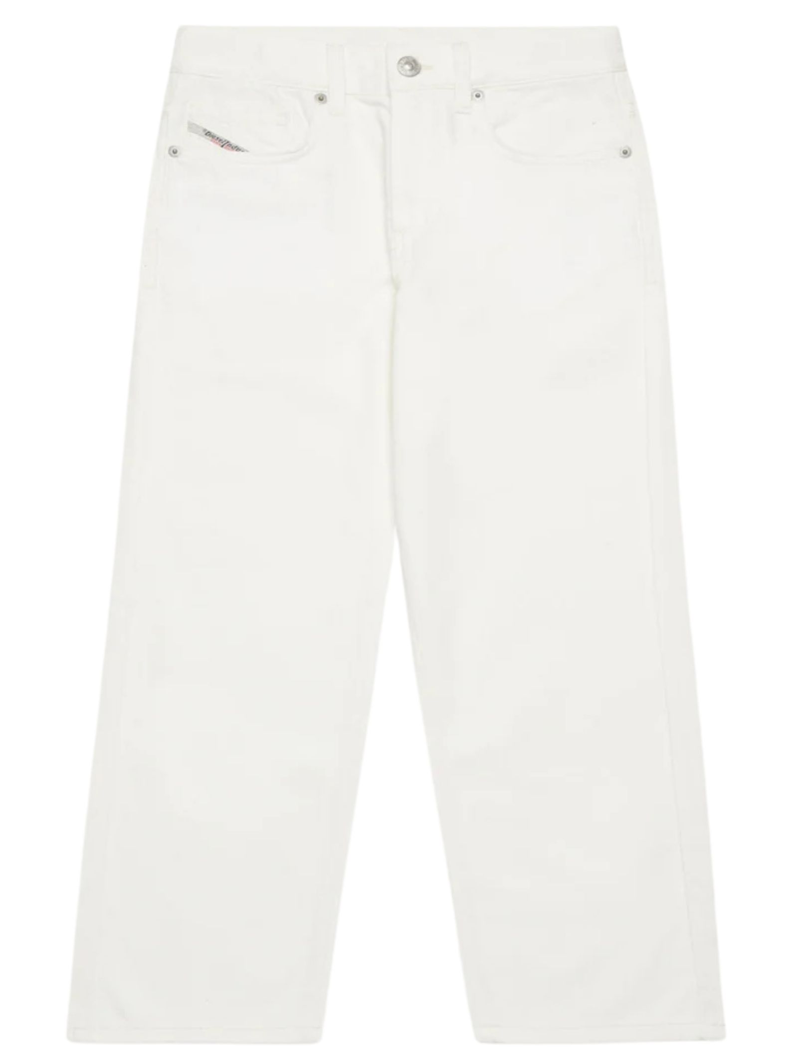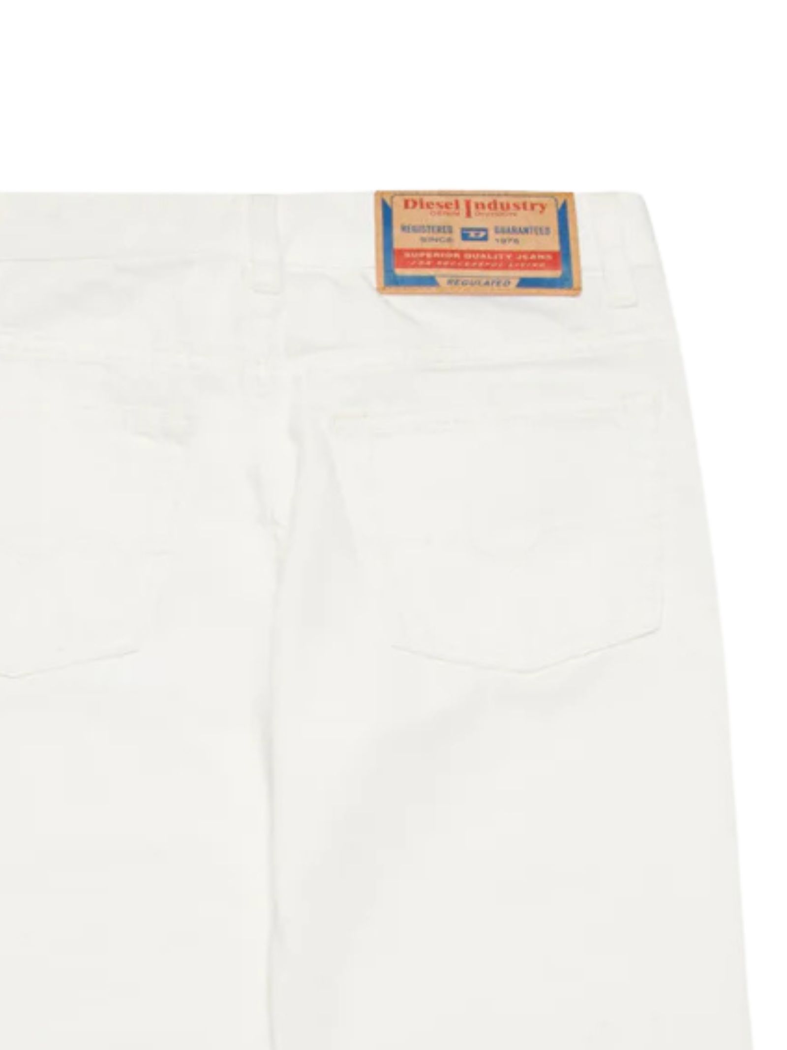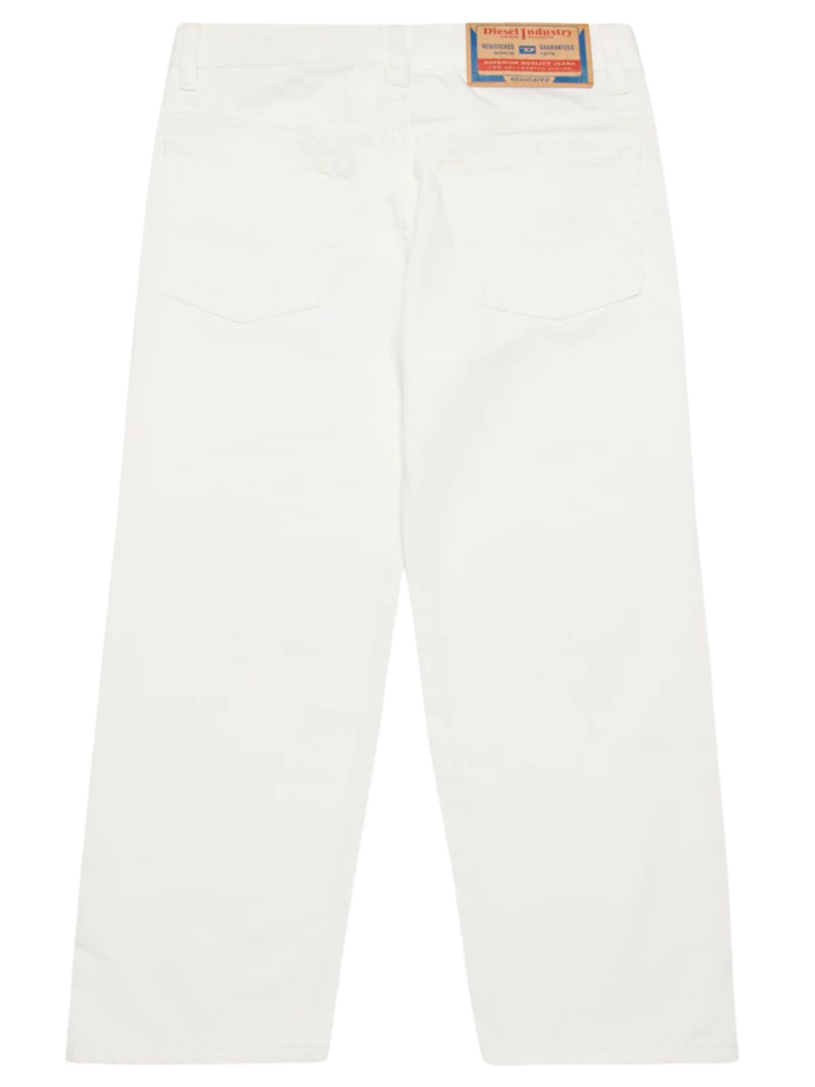 Diesel Kids white cotton denim jeans, five pockets, belt loops, front zip and button closure, adjustable waist with internal elastic bands with buttons, decorated with a logo patch on the back, regular fit. Composition: 100% cotton.