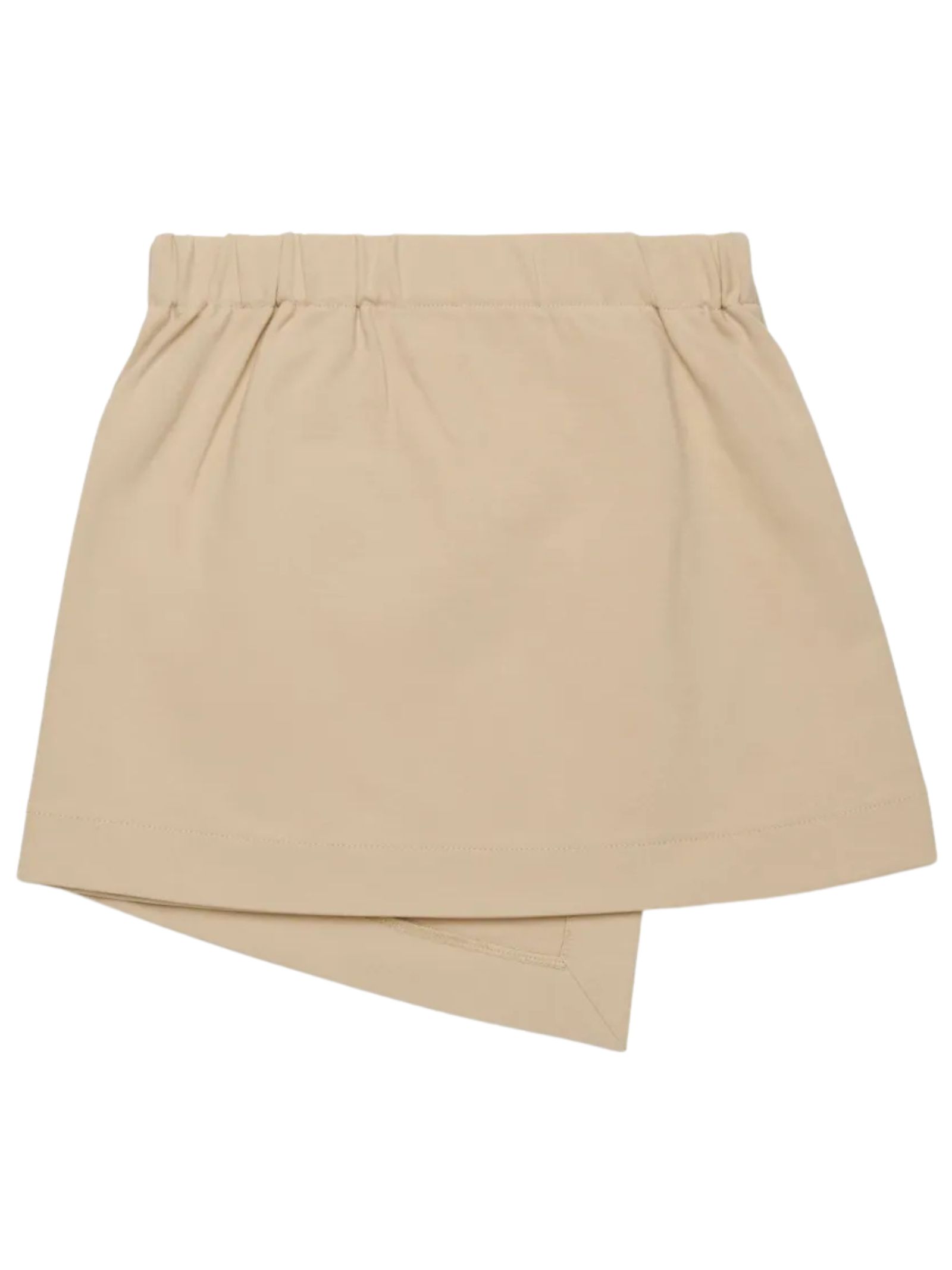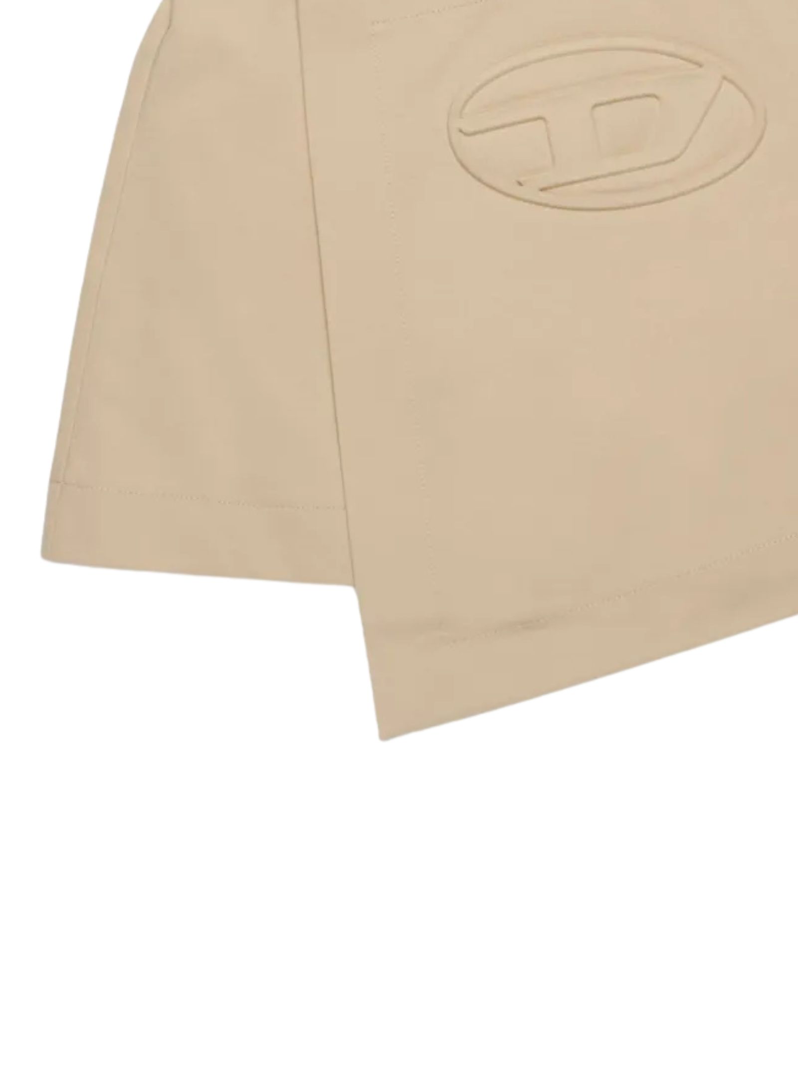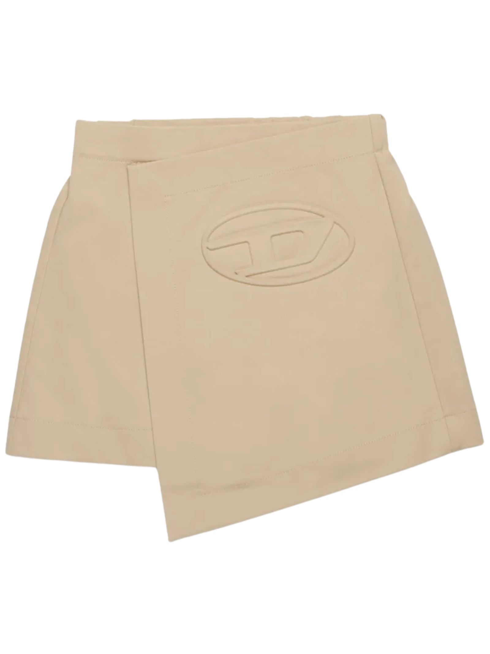 Diesel Kids beige skirt, elasticated waist, wrap closure, slanted front panel with snap button, embossed Over D logo on the front. Composition: 55% Viscose, 39% Polyamide, 6% Elastane.