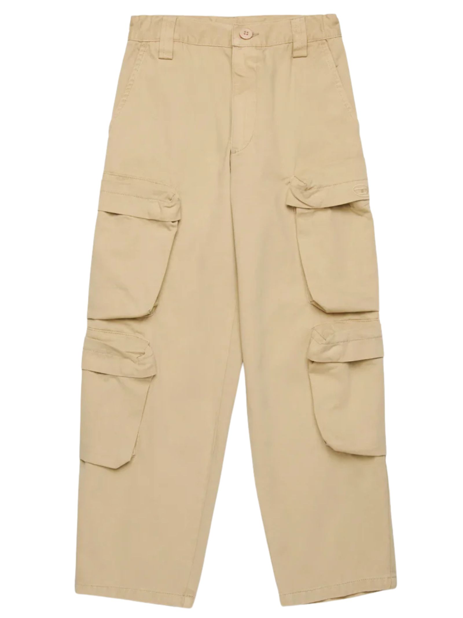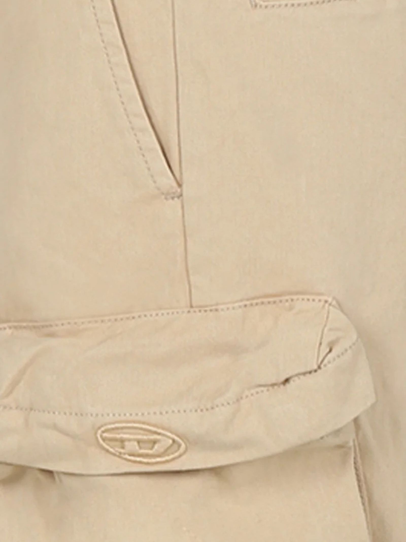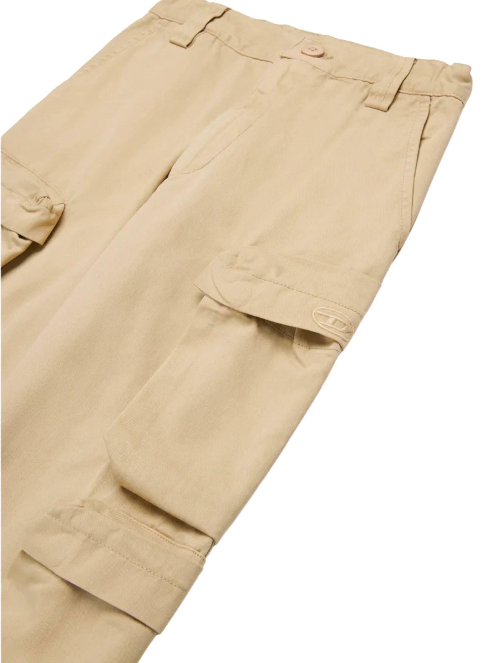 Diesel Kids beige trousers, regular-waisted, featuring slash pockets on the sides, welt pockets on the back, a tone-on-tone embroidered Oval D logo, an iconic brand detail, and a loose fit. Composition: 100% cotton.