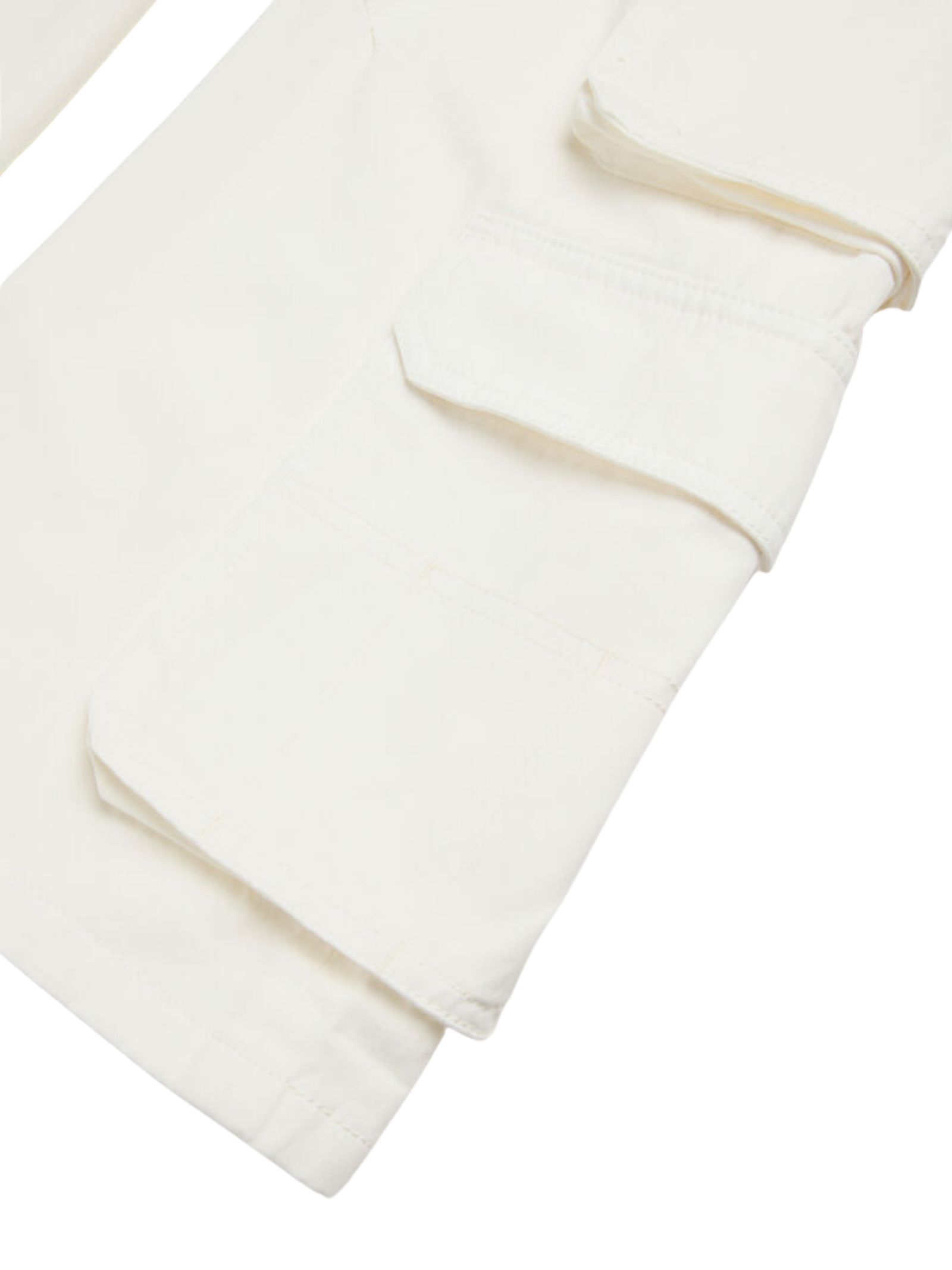 Diesel Kids white trousers, regular-waisted, featuring slash pockets on the sides, welt pockets on the back, a tone-on-tone embroidered Oval D logo, an iconic brand detail, and a loose fit. Composition: 100% cotton.