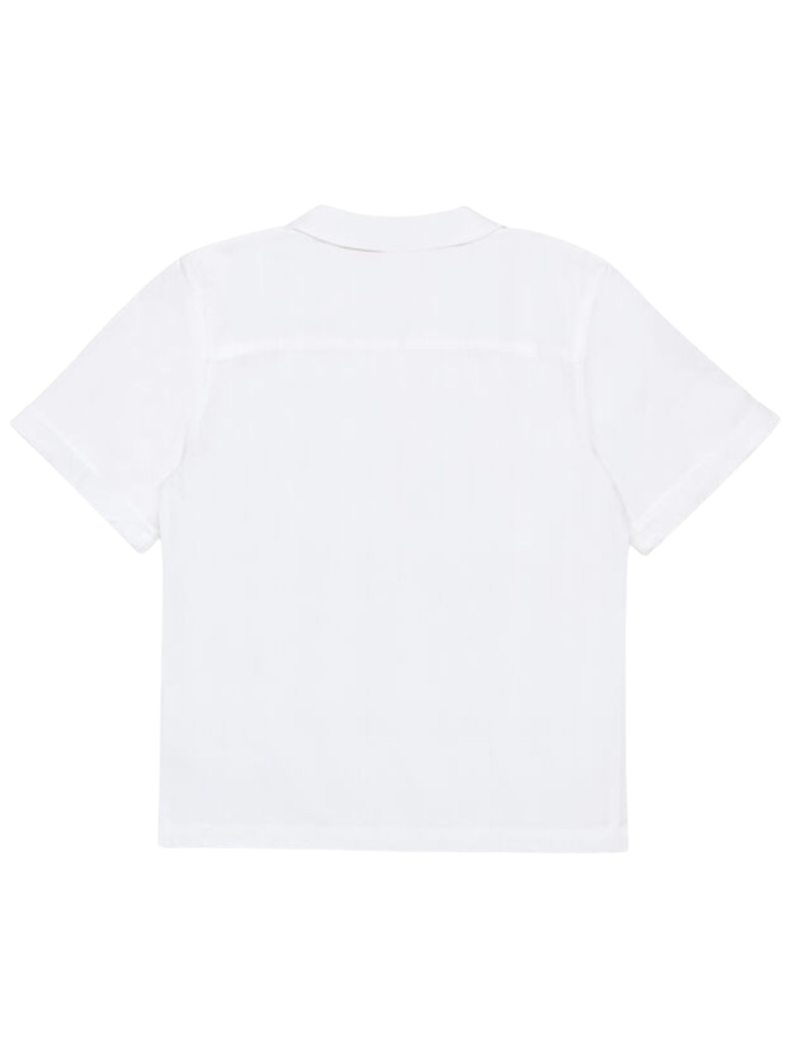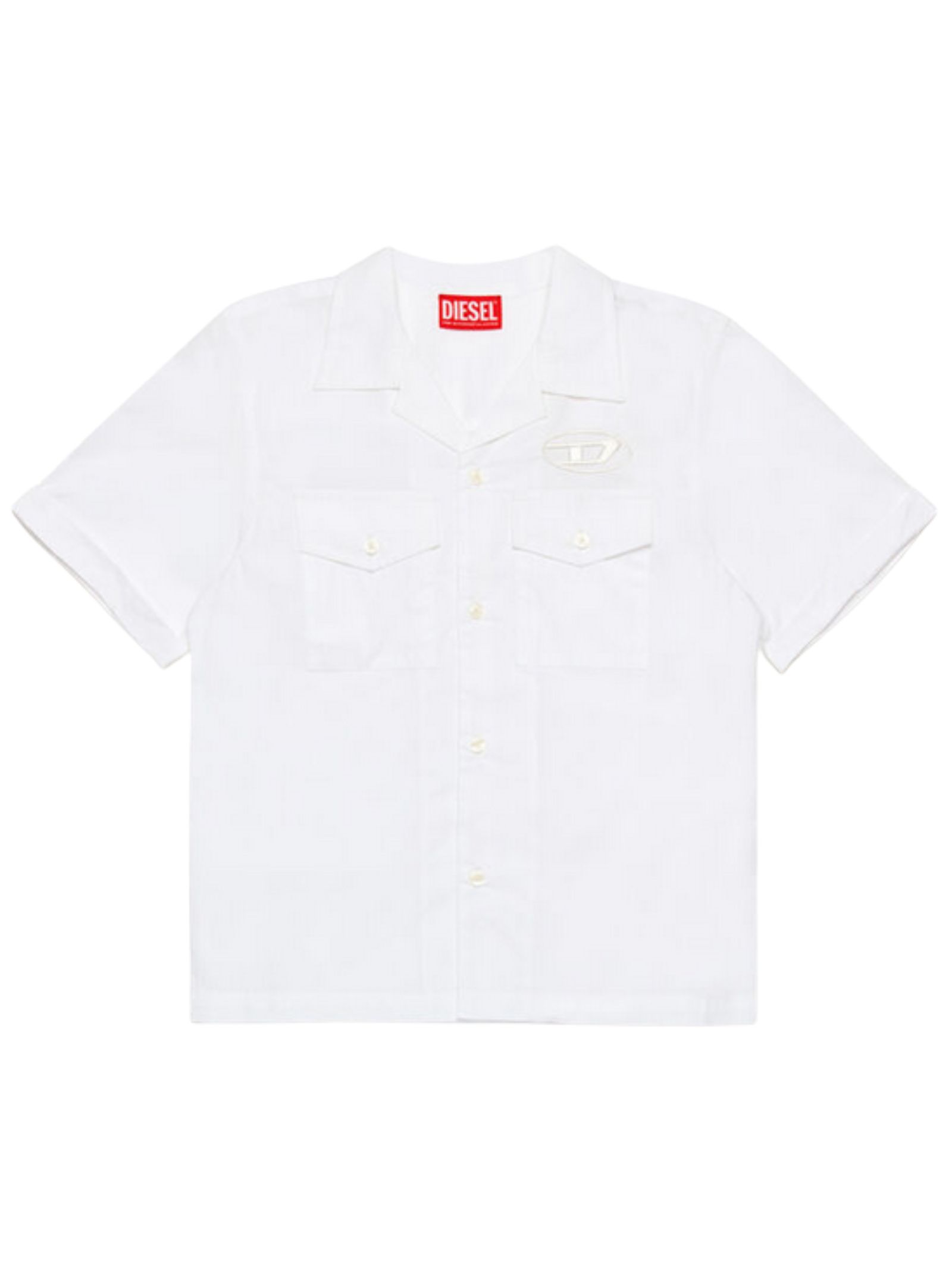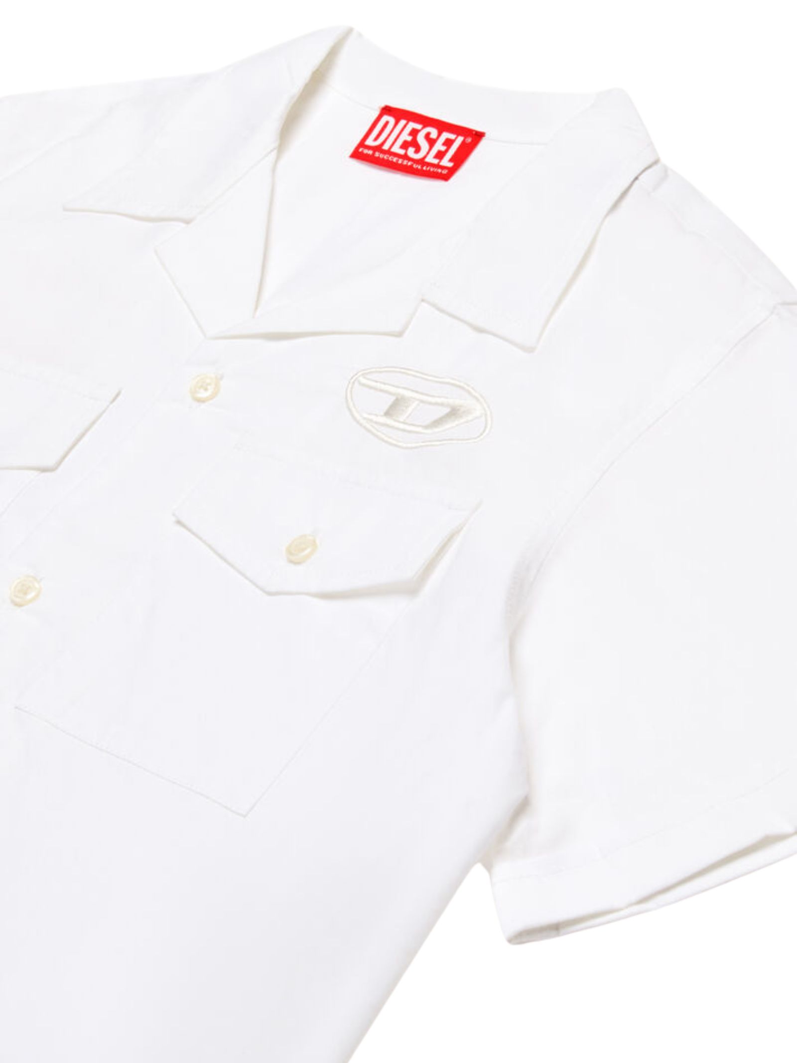 Diesel Kids white cotton shirt with short sleeves, a pointed collar, a front button closure, and front pockets. It features an embroidered logo on the chest and a regular fit. Composition: 100% cotton.