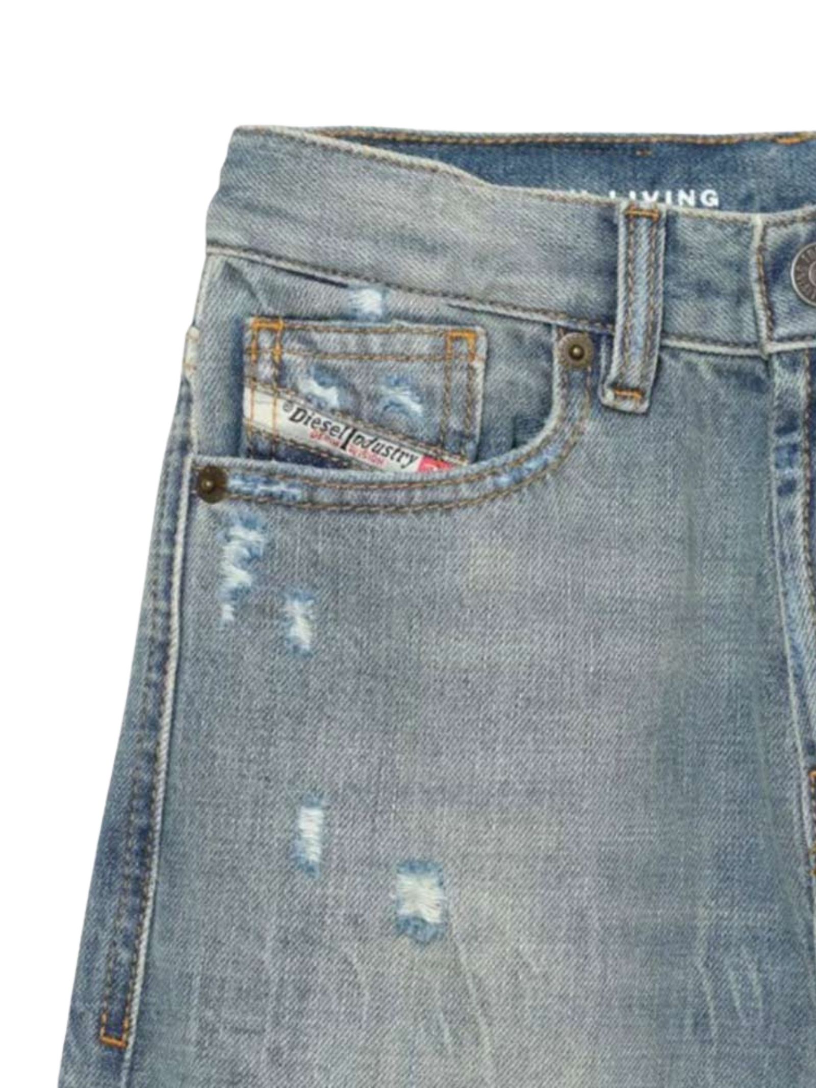Diesel Kids jeans in a medium-light blue wash, featuring a regular waist, a 5-pocket design, faded details, scuffs, and rips for a vintage look, a signature brand patch detail on the back, and a loose fit. Composition: 100% cotton.