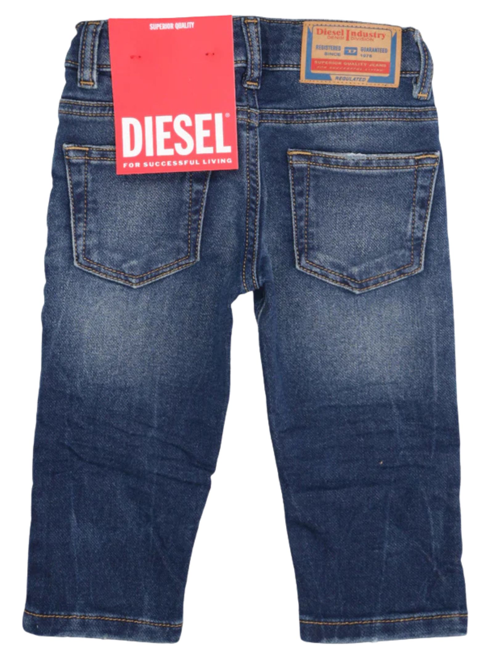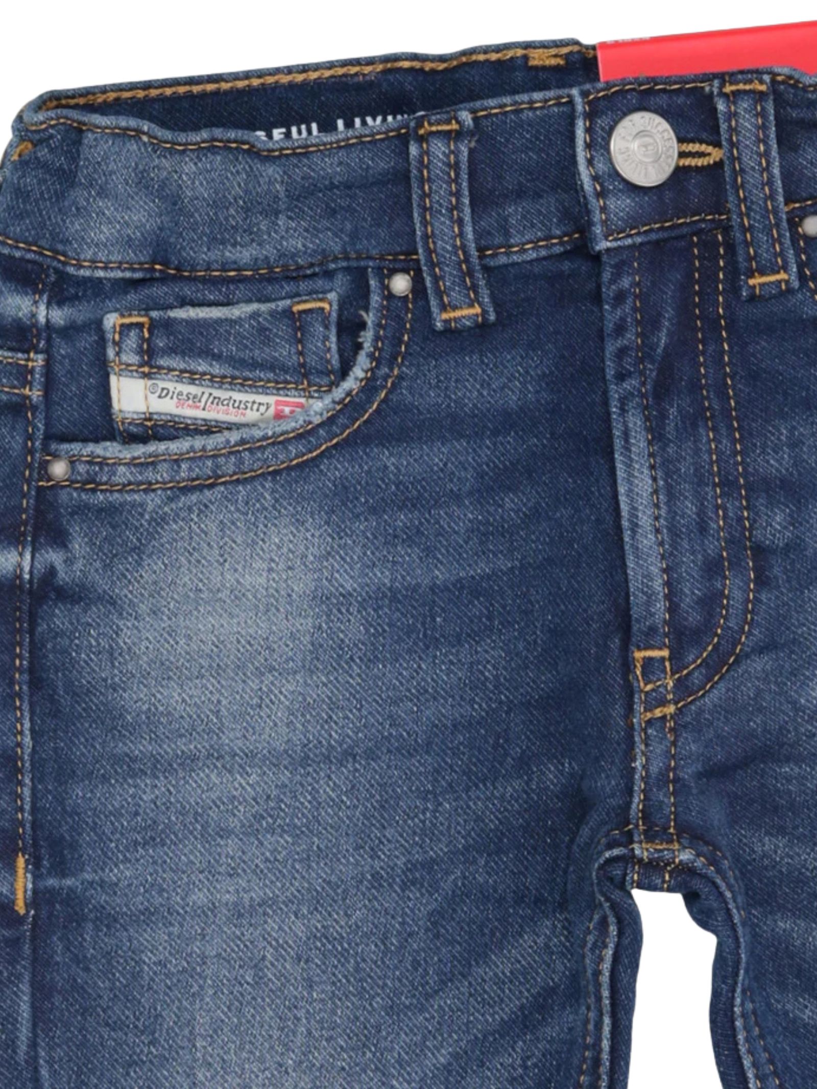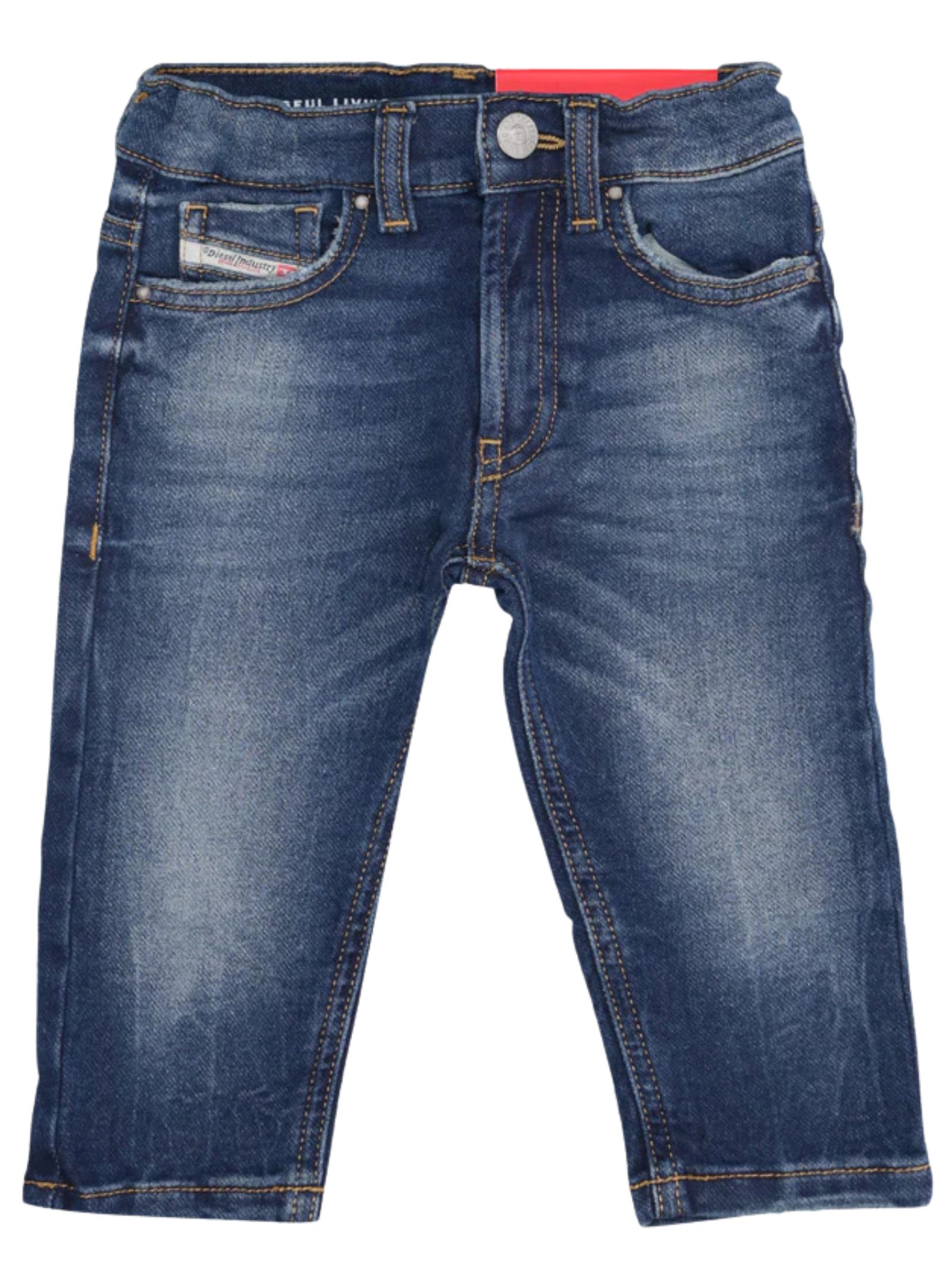 Diesel Kids D-Jools-B JJJ jeans in a blue wash with a distressed effect, classic five-pocket style, regular waist with internal elastic and belt loops, button and zip fly closure, logo patch applied on the back of the waist. Composition: 82% cotton 16% polyester 2% elastane