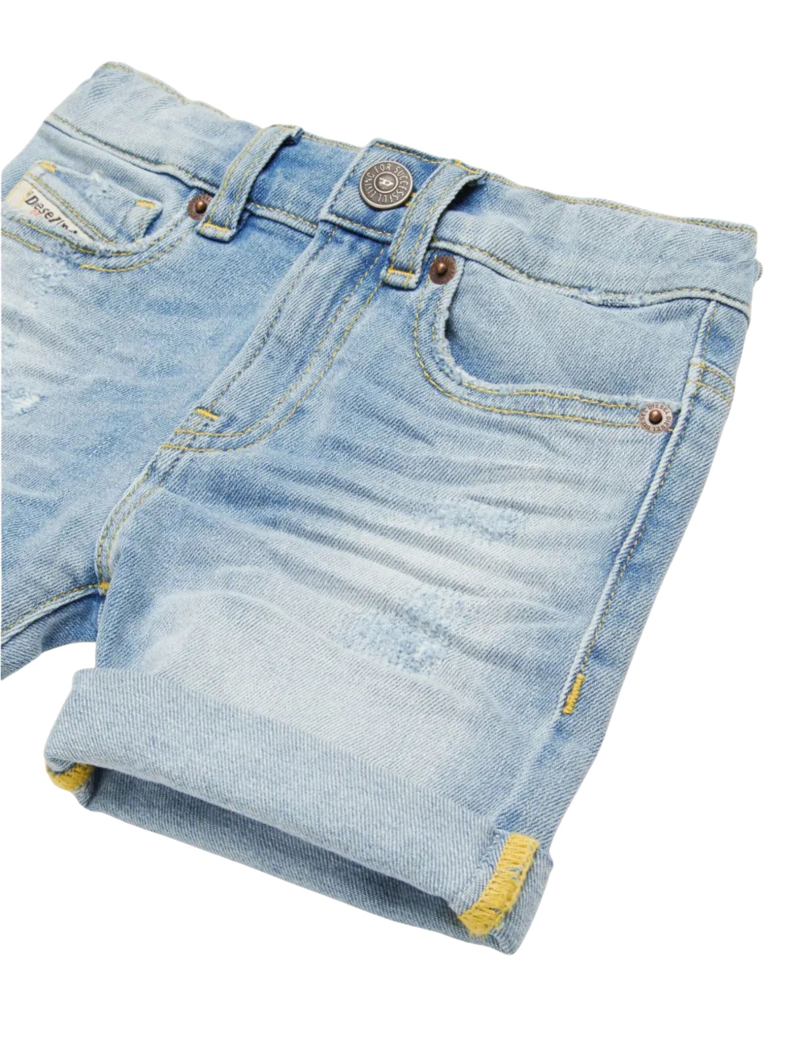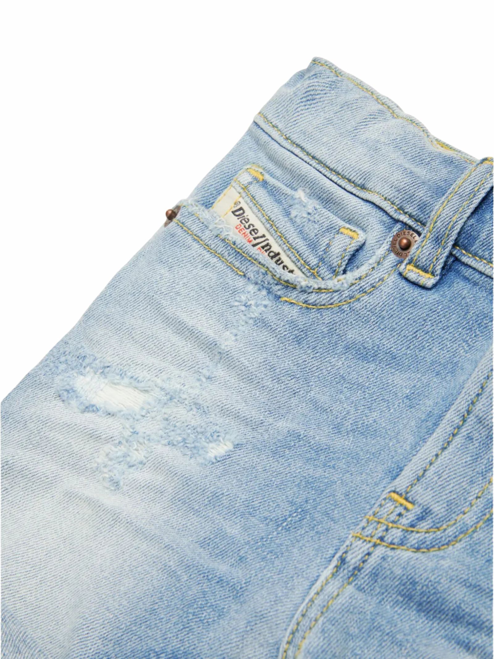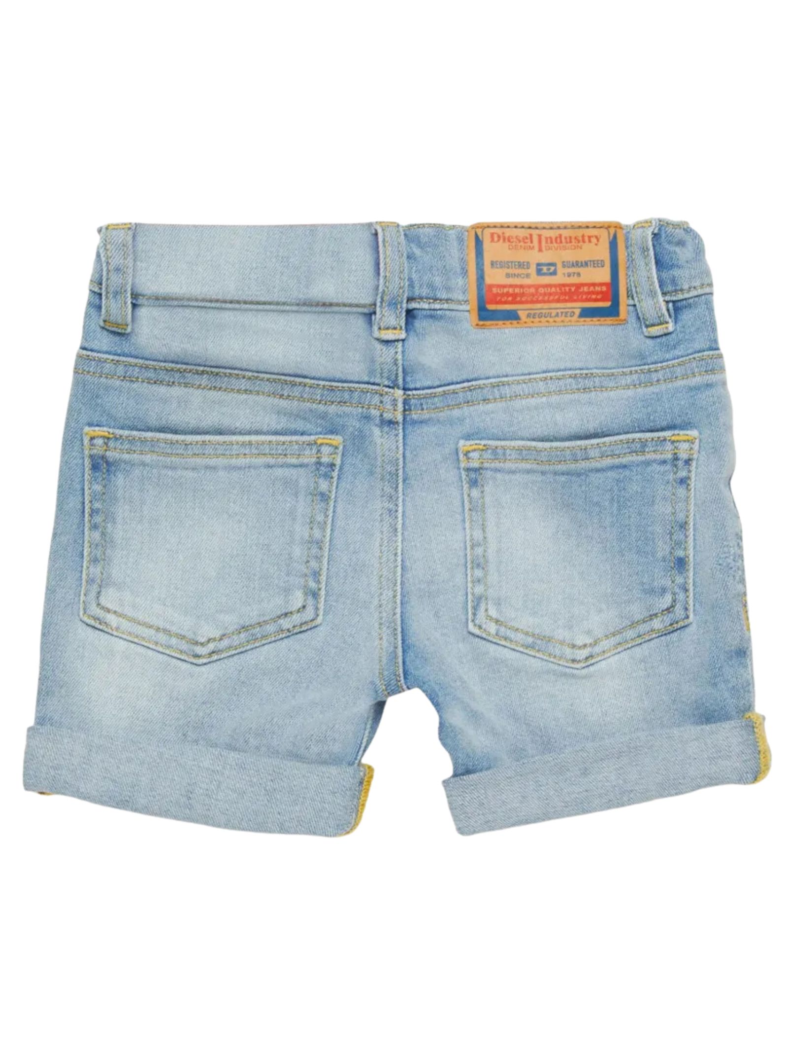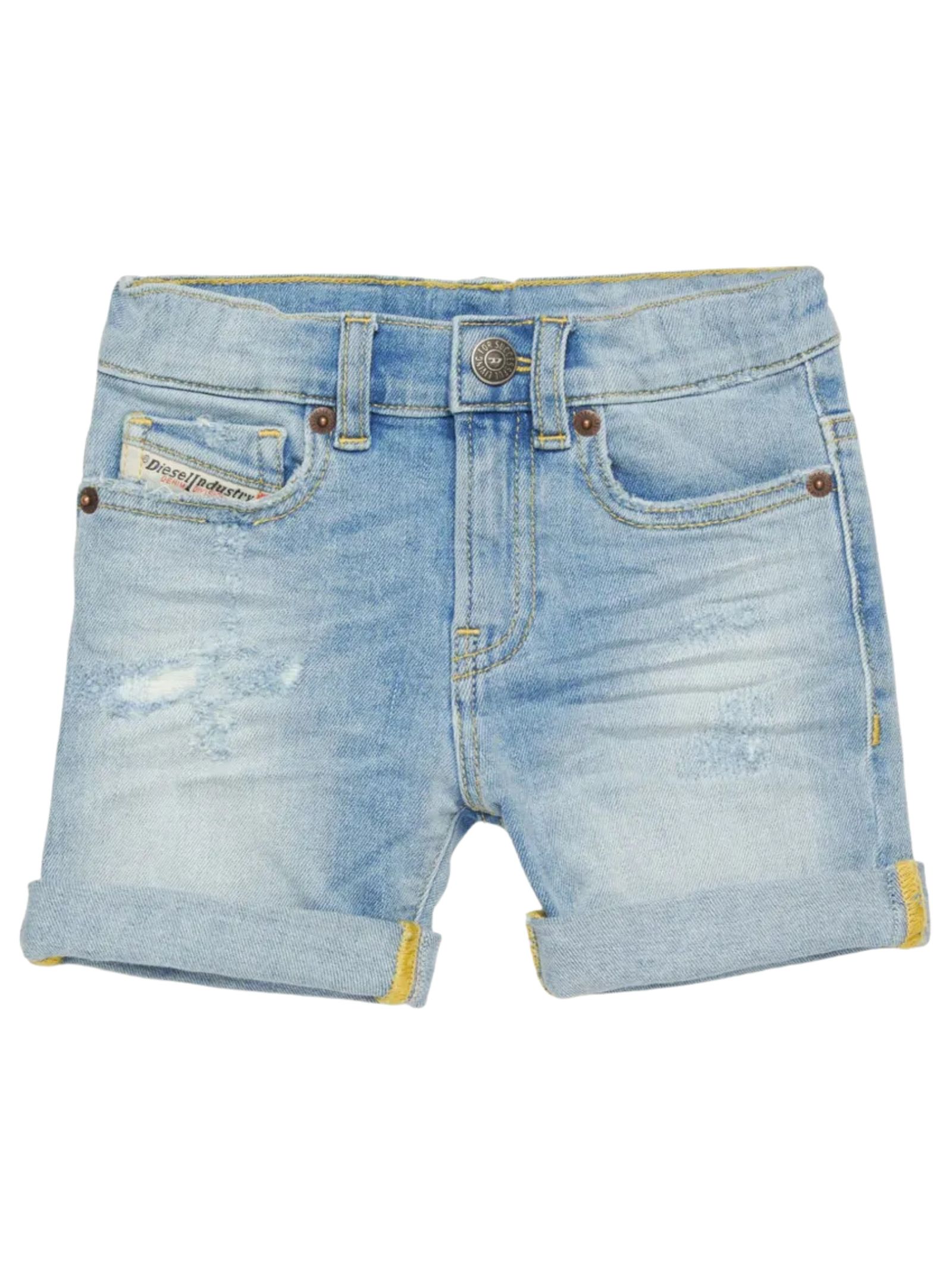 Diesel Kids PGALLYB Bermuda shorts in a blue wash with a distressed effect, classic five-pocket style, regular waist with internal elastic and belt loops, button and zip fly closure, logo patch on the back of the waist, cuffed hems. Composition: 98% Cotton 2% Elastane
