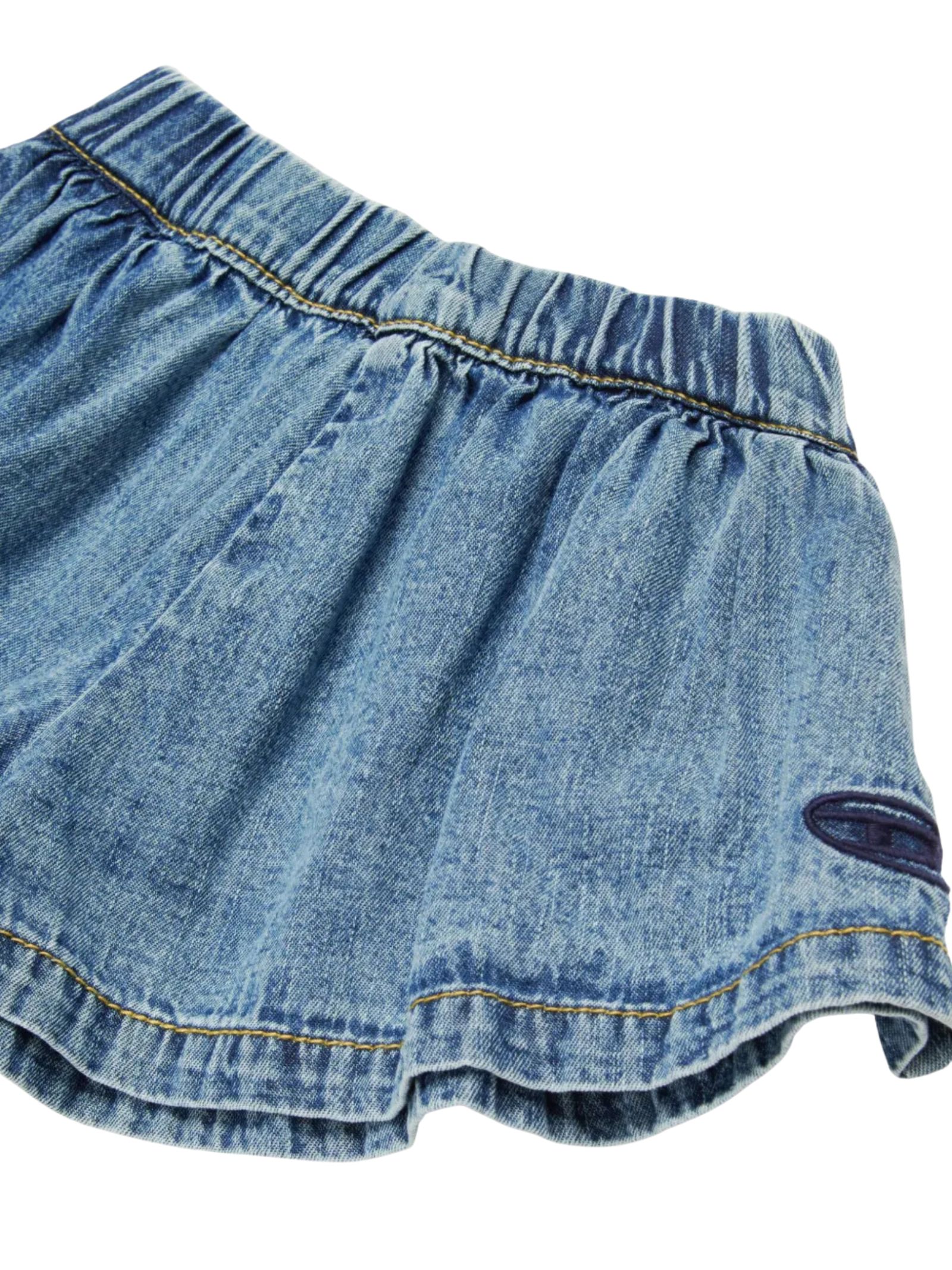 Diesel Kids lightweight denim shorts with a blue wash and a distressed effect, featuring an elastic waistband, two side welt pockets, contrasting logo embroidery, and a flared design. Composition: 100% cotton.