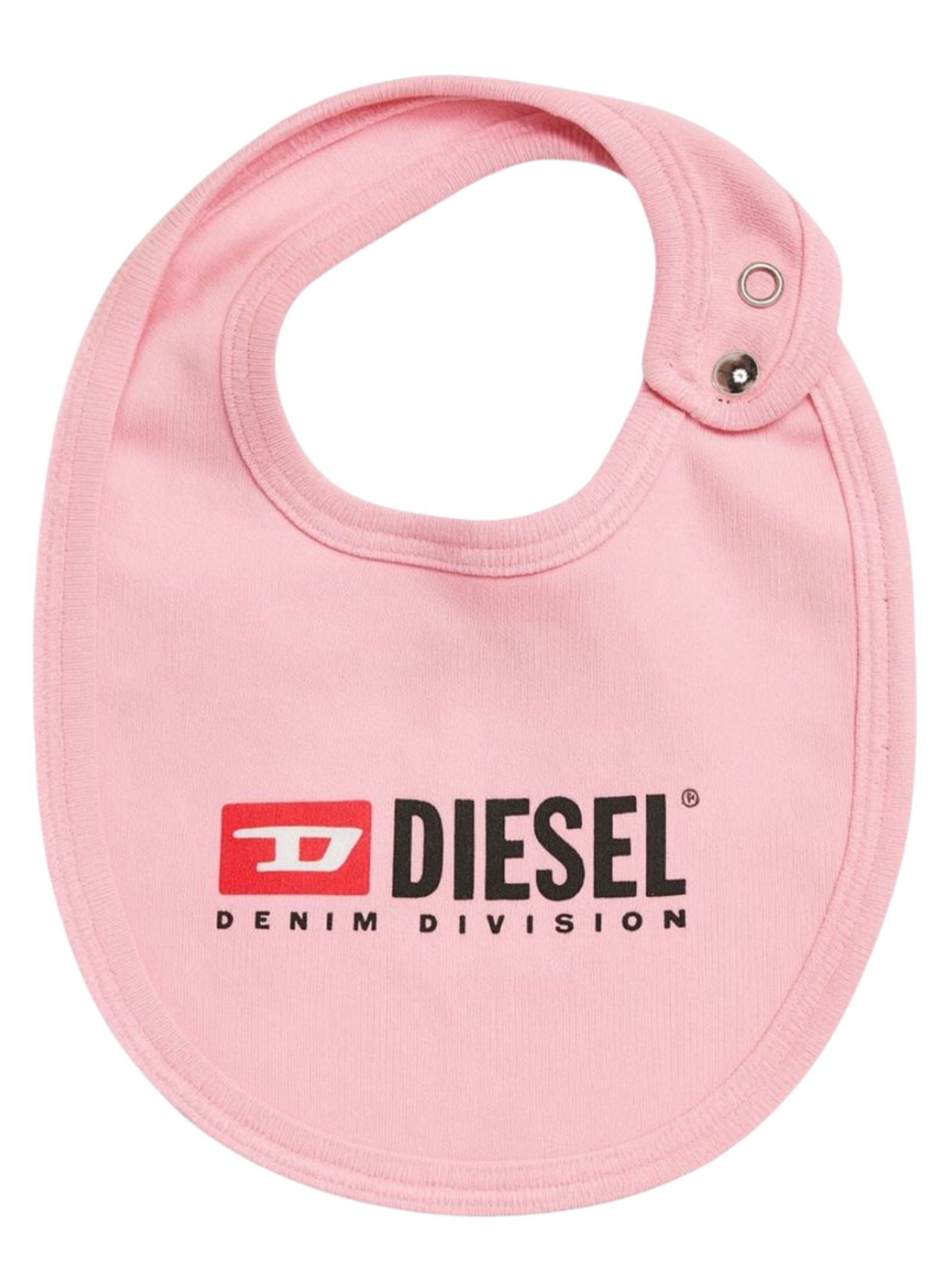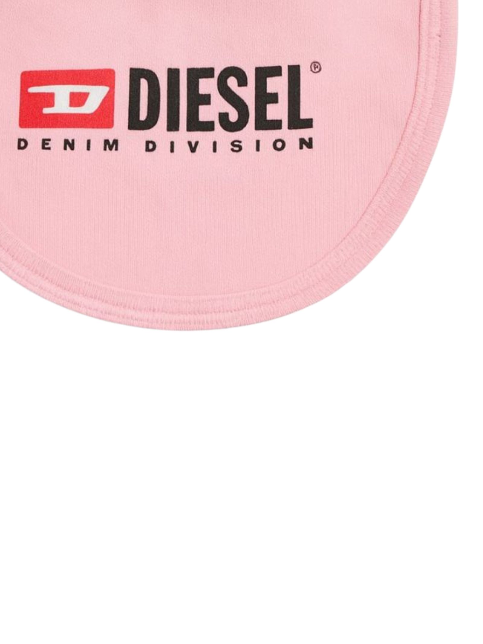 Diesel Kids pink bib, round design, contrasting logo print, adjustable snap closure. Composition: 100% cotton.