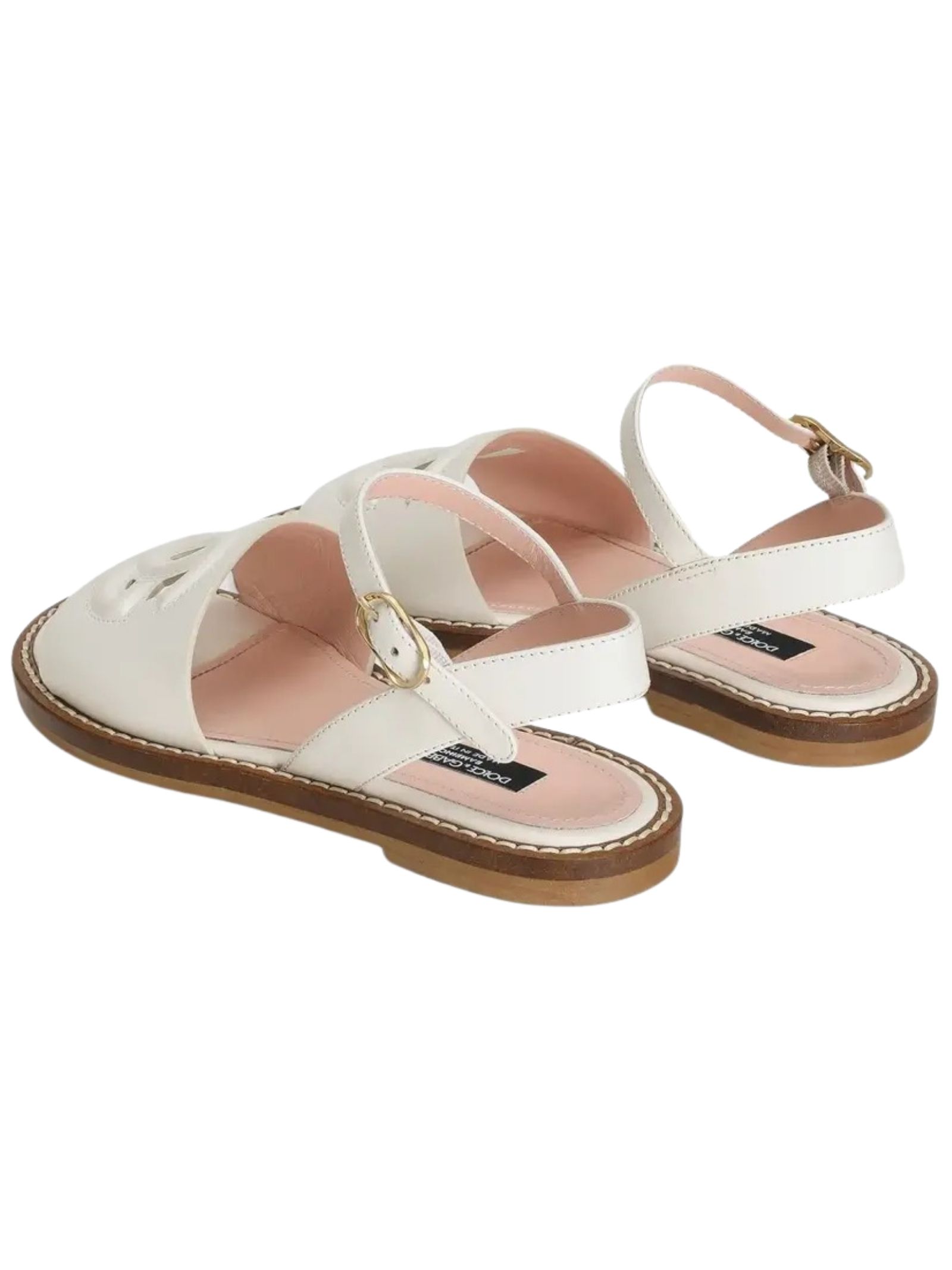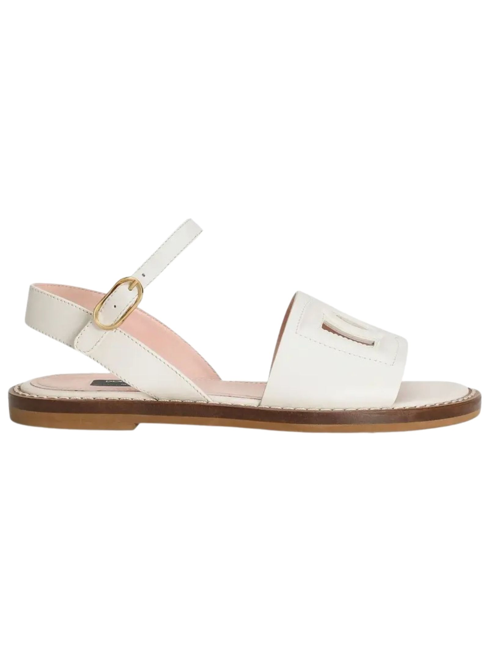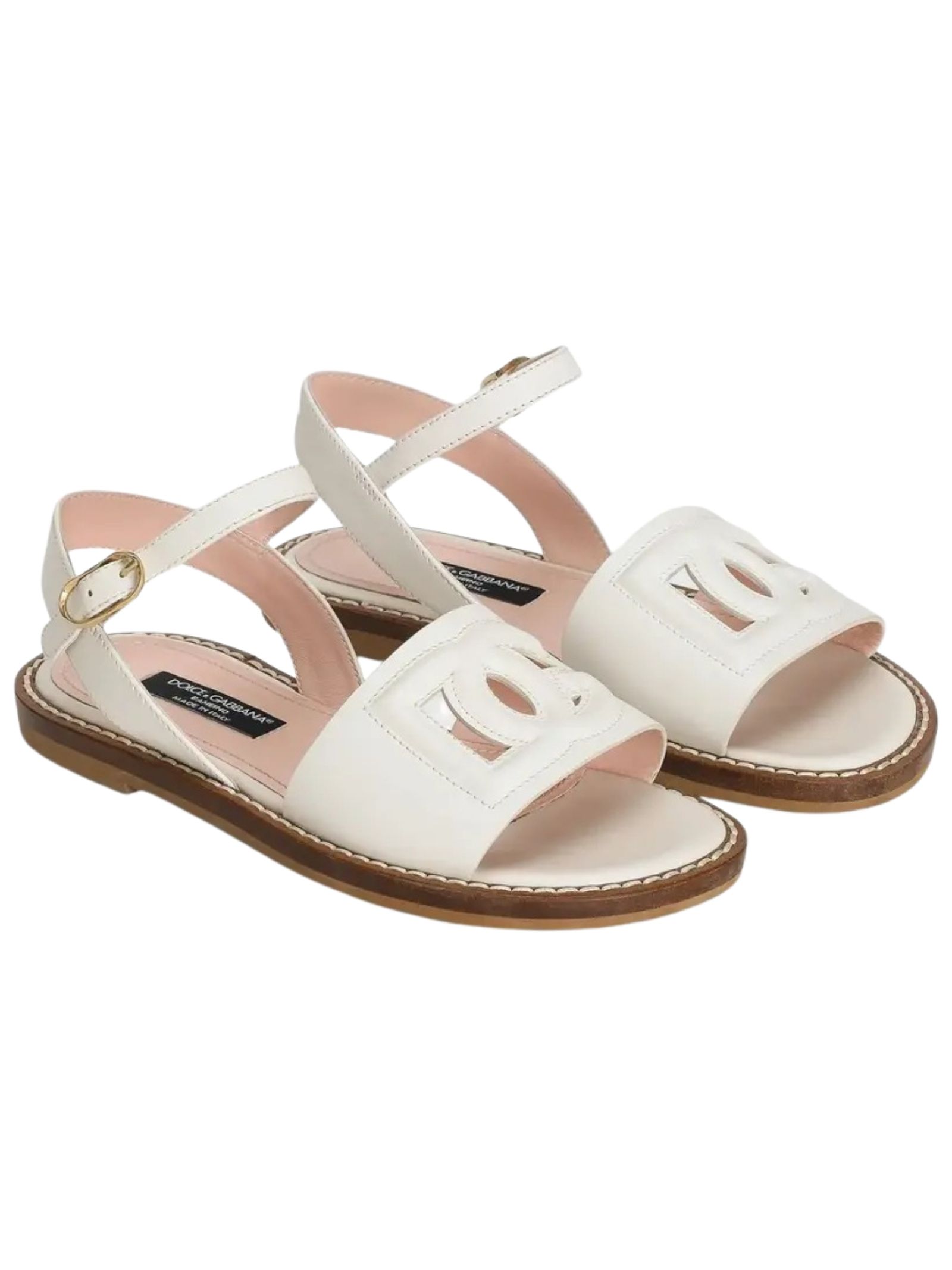Dolce & Gabbana Kids white calfskin sandals with a velcro closure, a cut-out DG logo in padded leather with a 3D effect, a lambskin insole, a logoed fabric label, and a natural leather sole. Made in Italy.