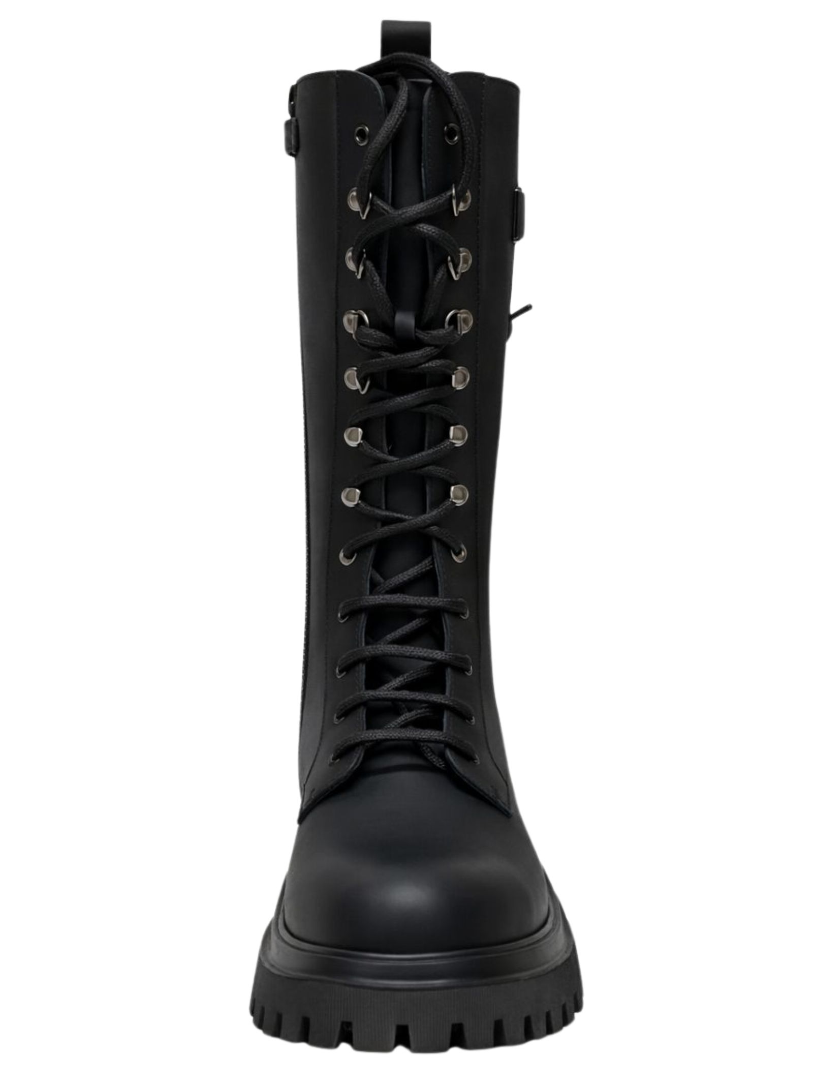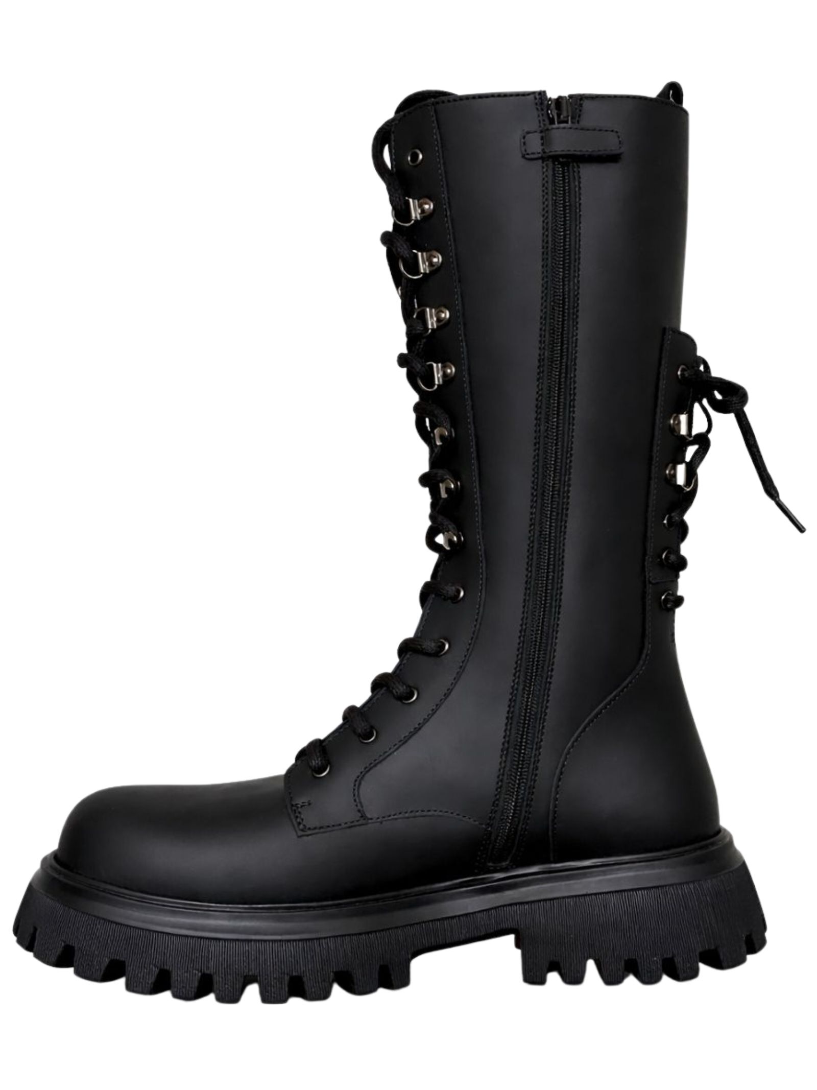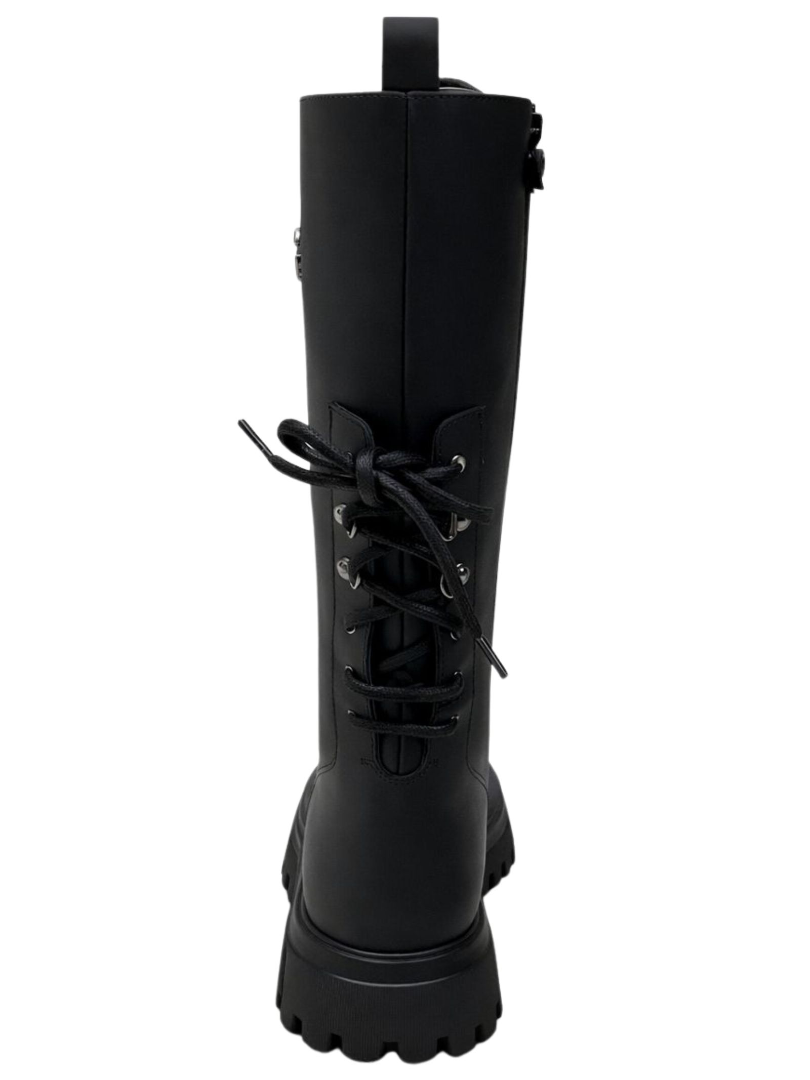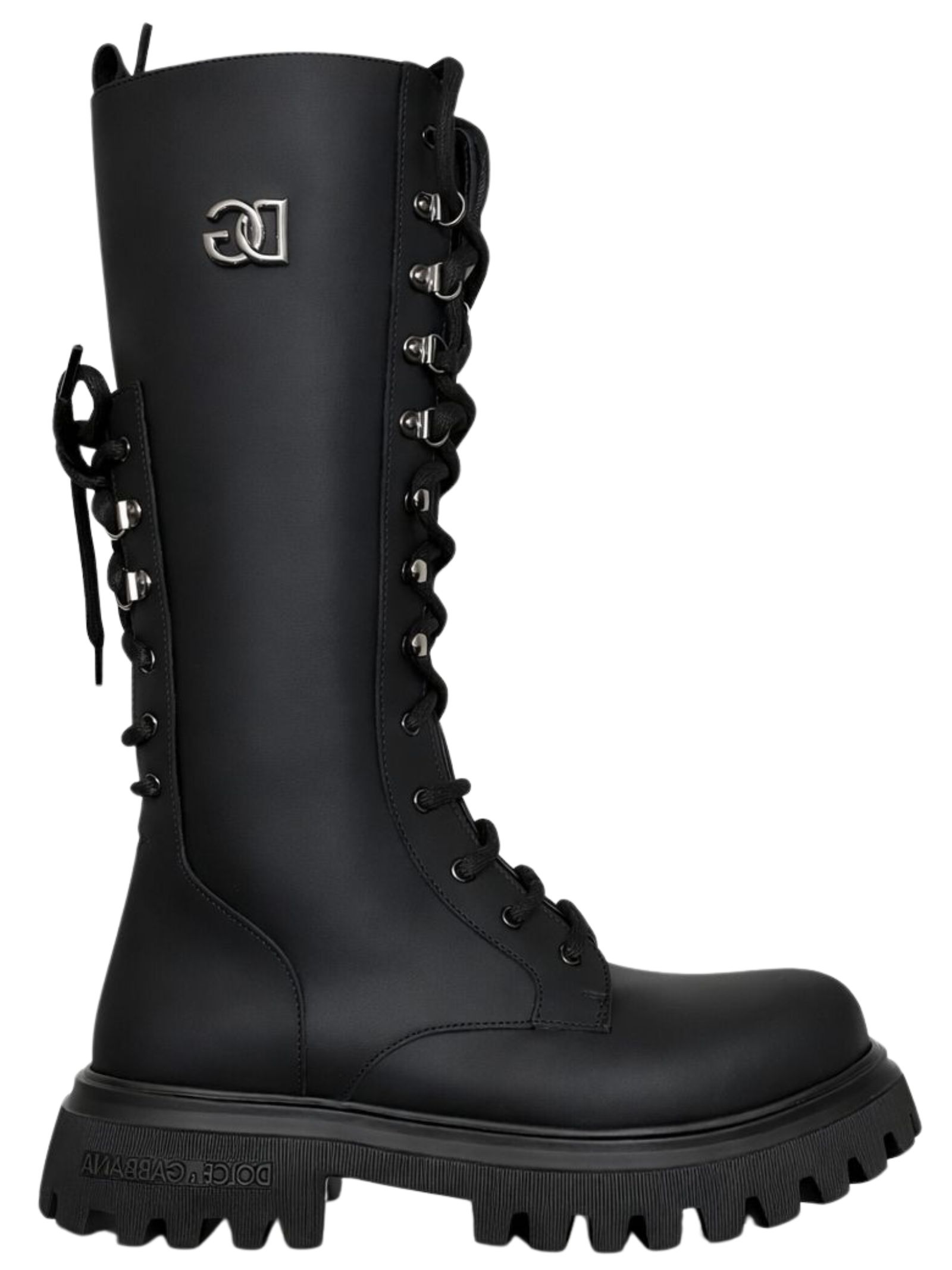 Dolce & Gabbana Kids black combat boots made of soft nappa calfskin, featuring a round toe, front laces, side zip, back laces, metal logo applique, and a rubber lug sole. Made in Italy.