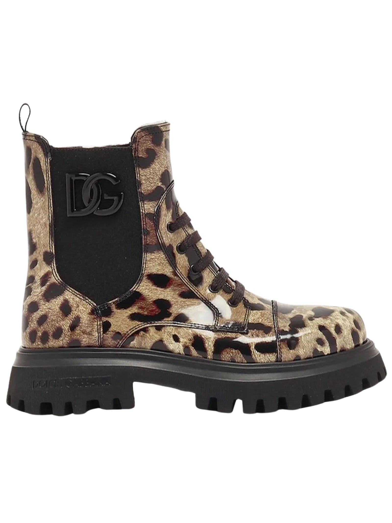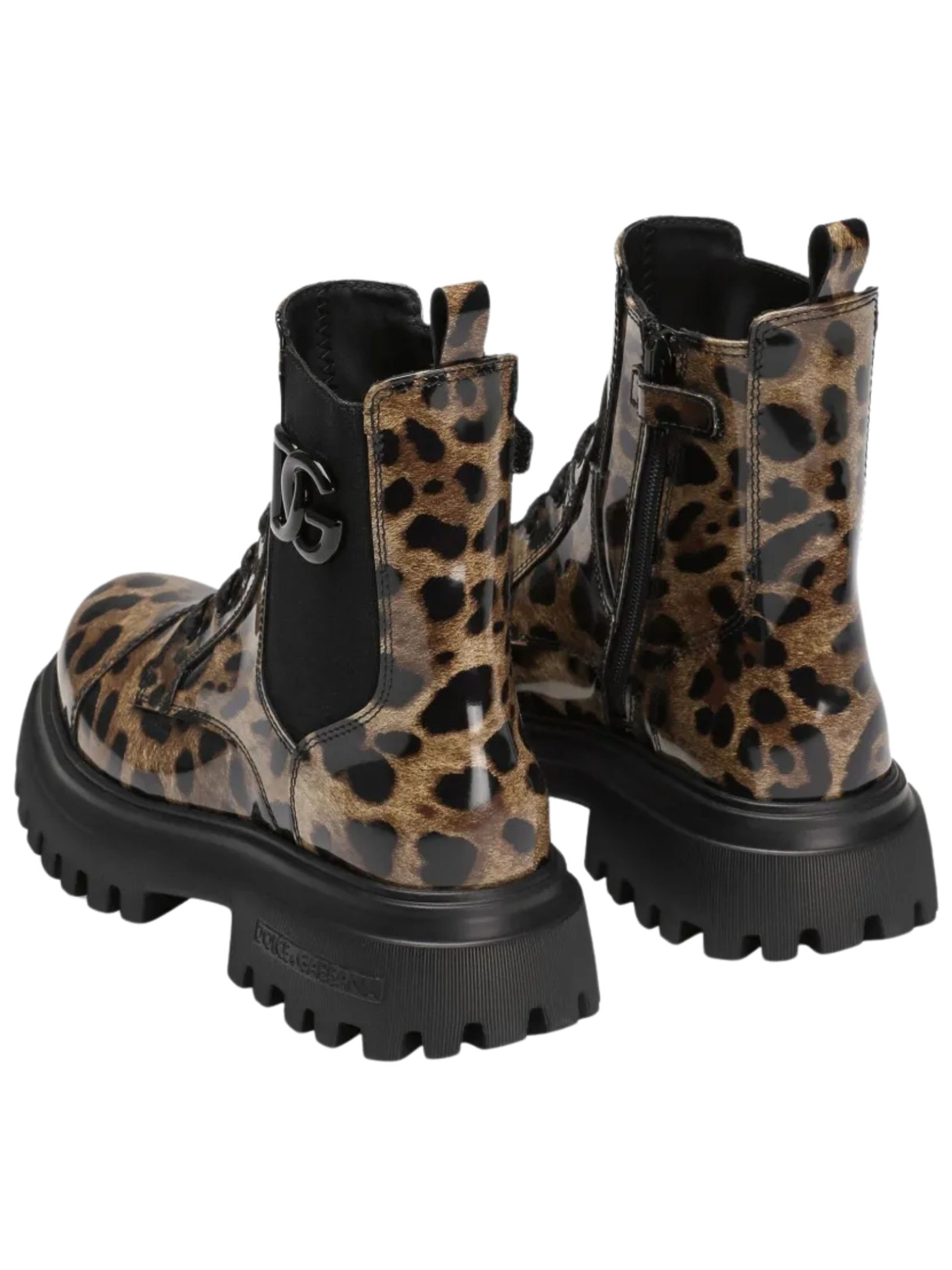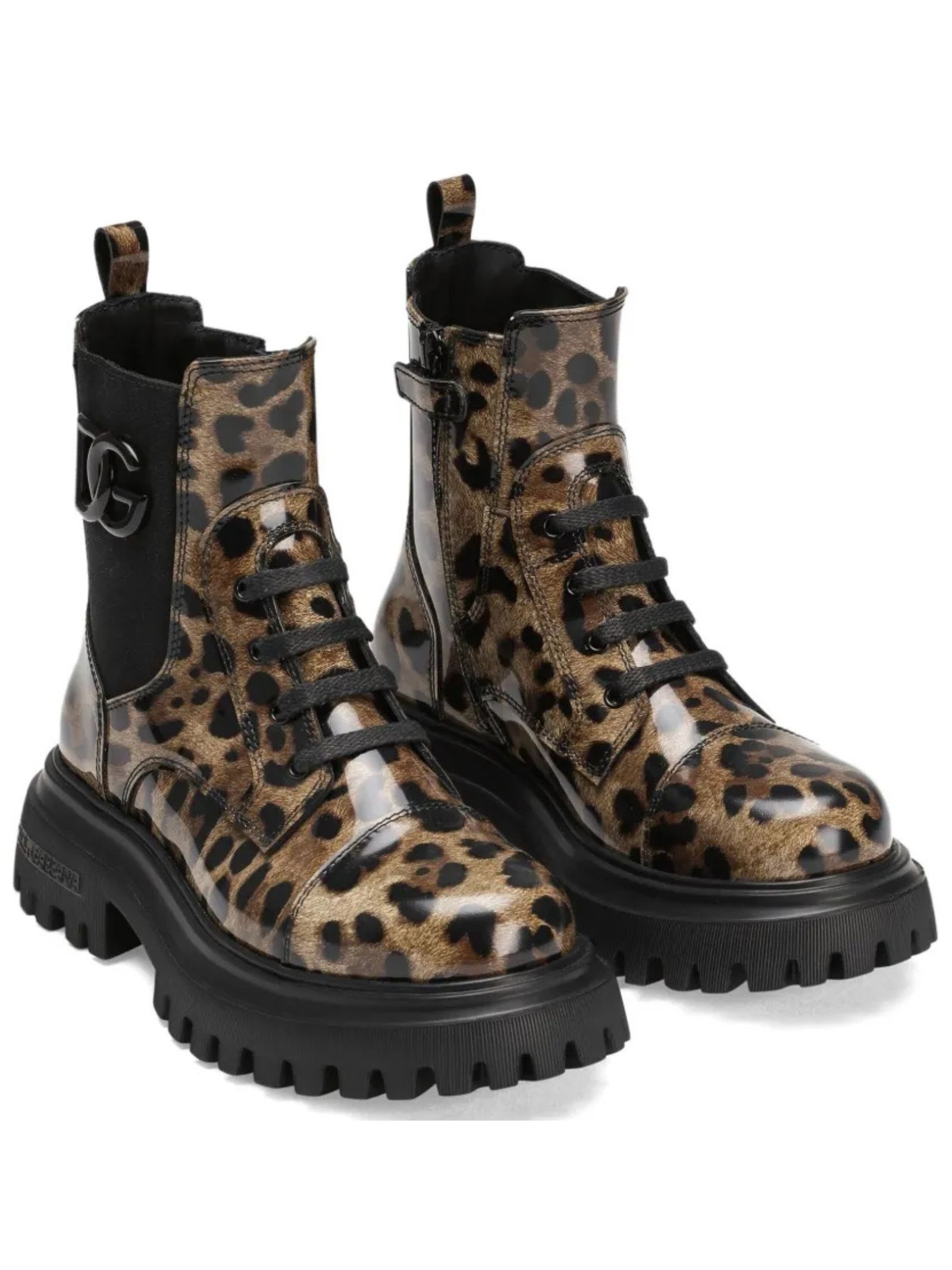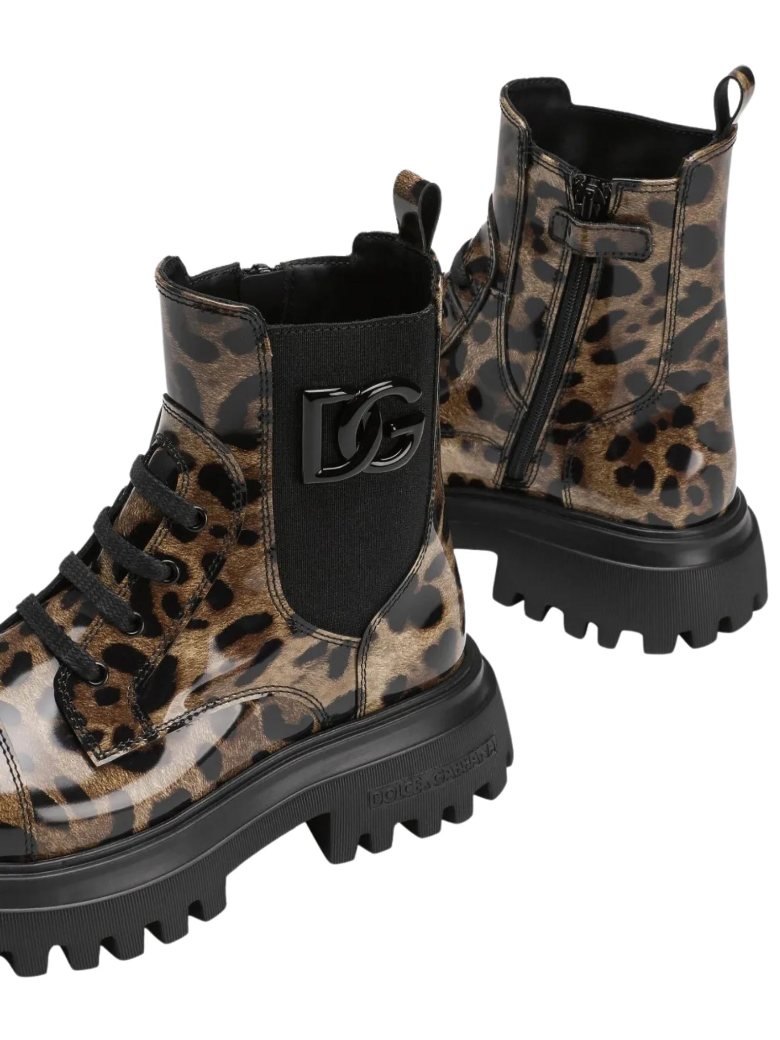 Dolce & Gabbana Kids brown leopard print combat boots with lace-up closure, logo detail, chunky sole, and zip closure. Sole: 100% rubber. Lining: 100% calfskin. Exterior: 100% calfskin. Made in Italy