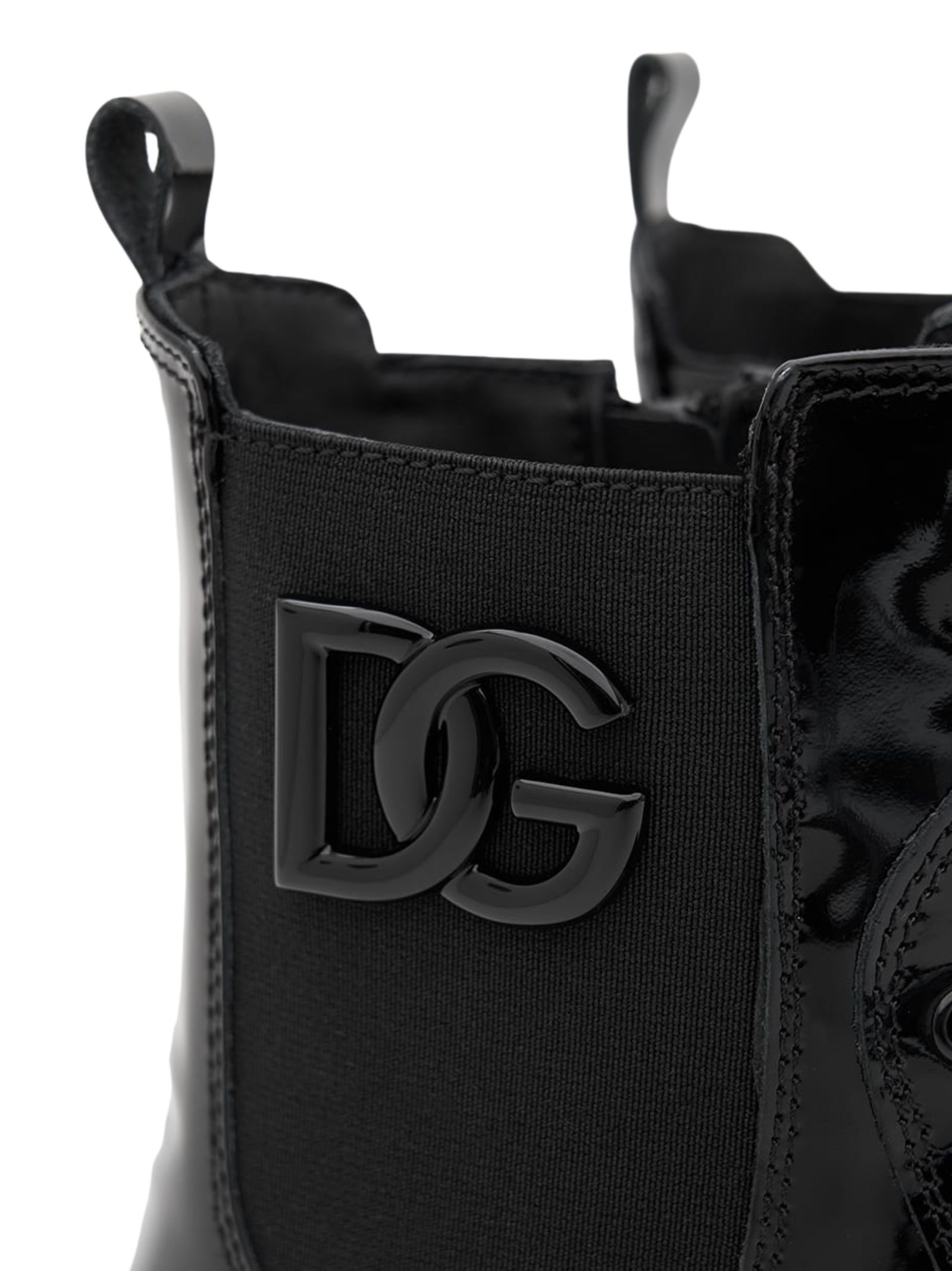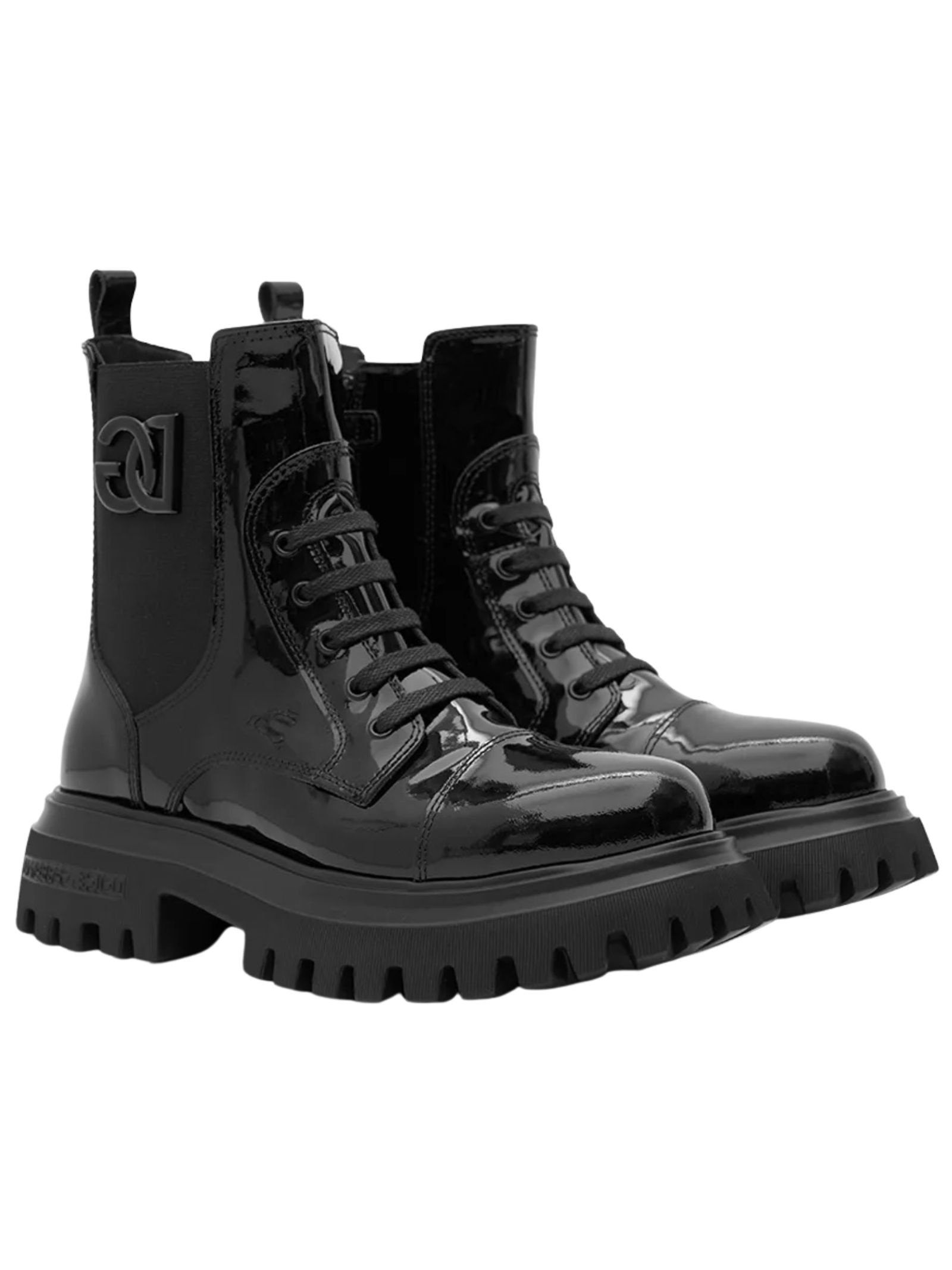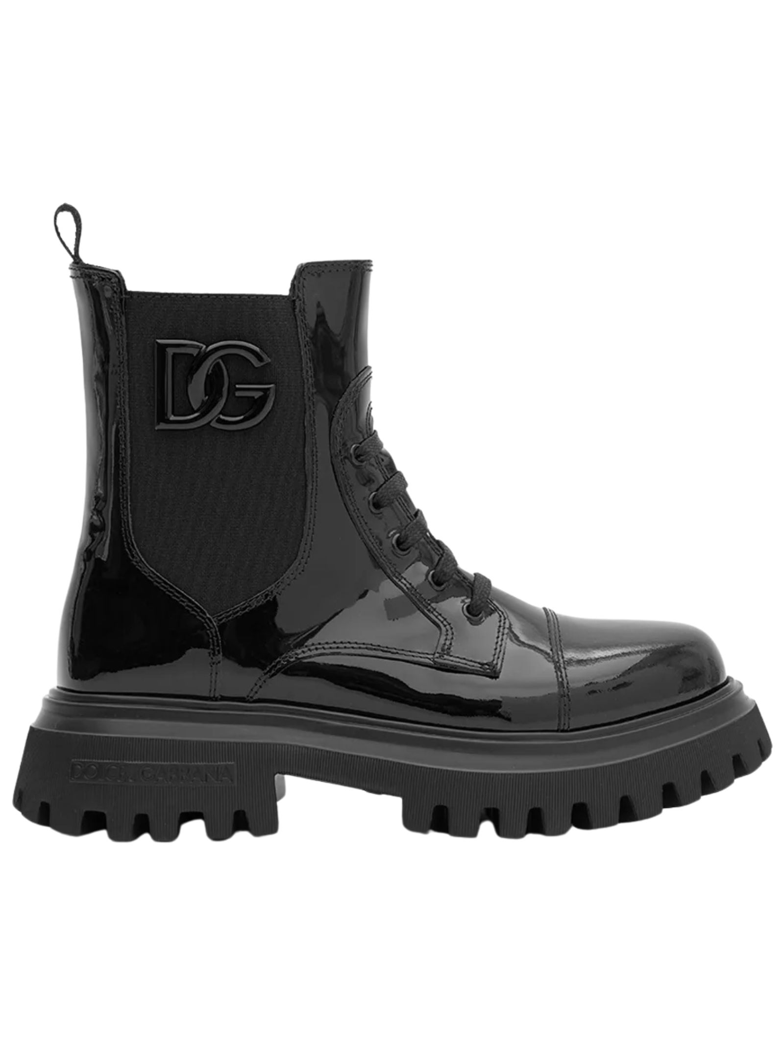 Dolce & Gabbana Kids black combat boots made of soft patent calfskin, featuring a lace-up closure, elasticated side insert, metal logo appliqué, chunky sole, and zip closure. Sole: 100% rubber. Lining: 100% calfskin. Exterior: 100% calfskin. Made in Italy.