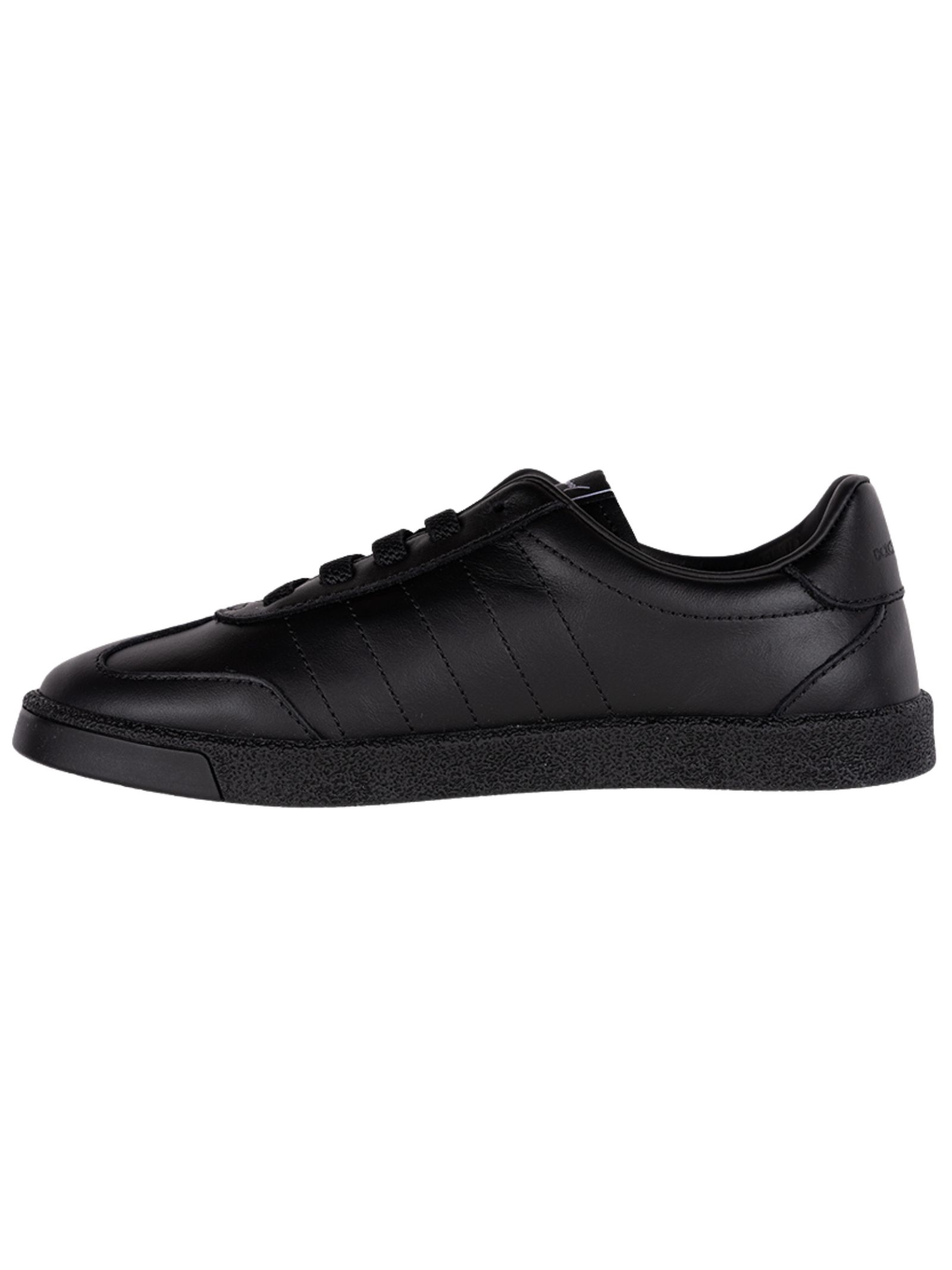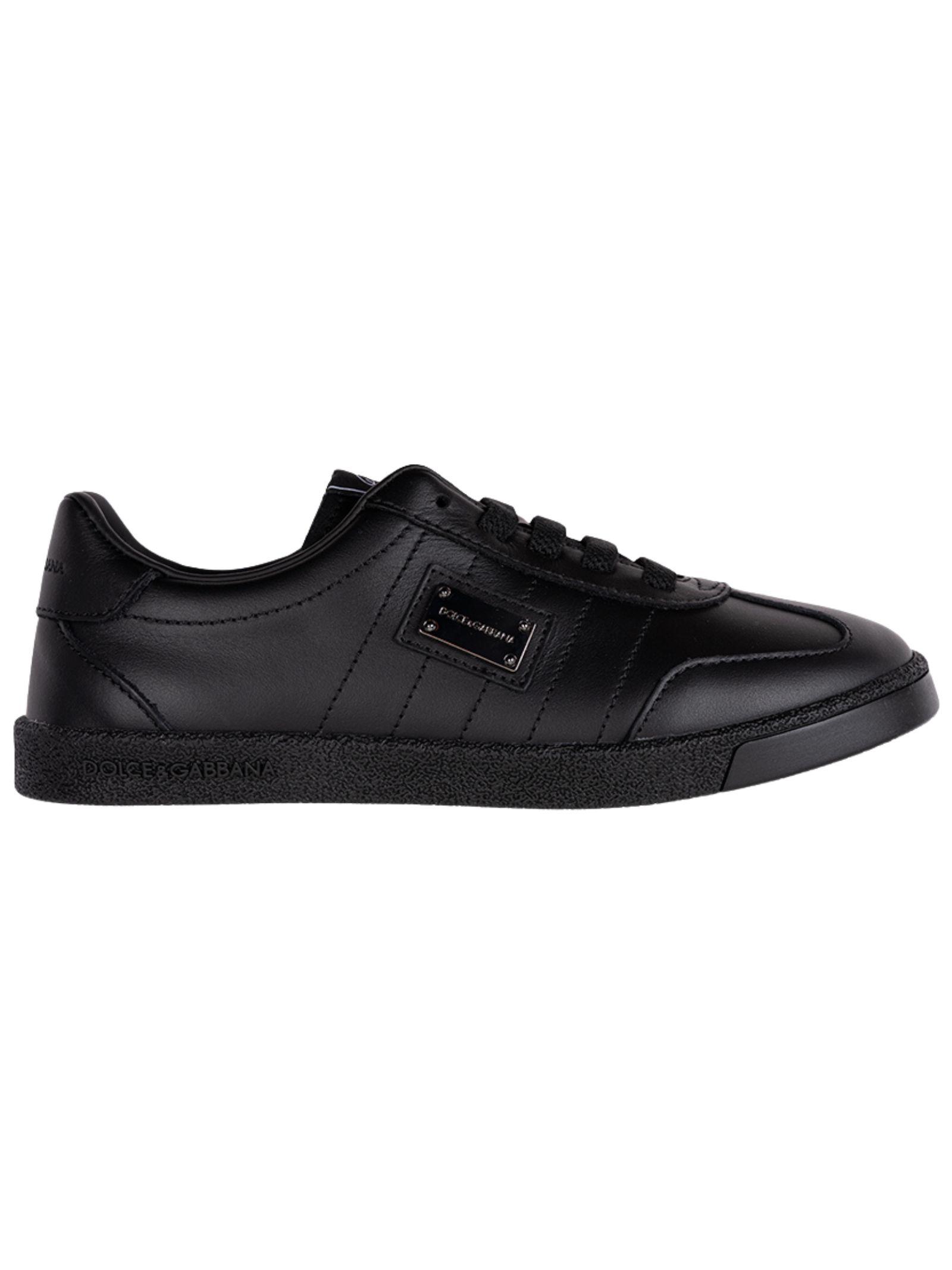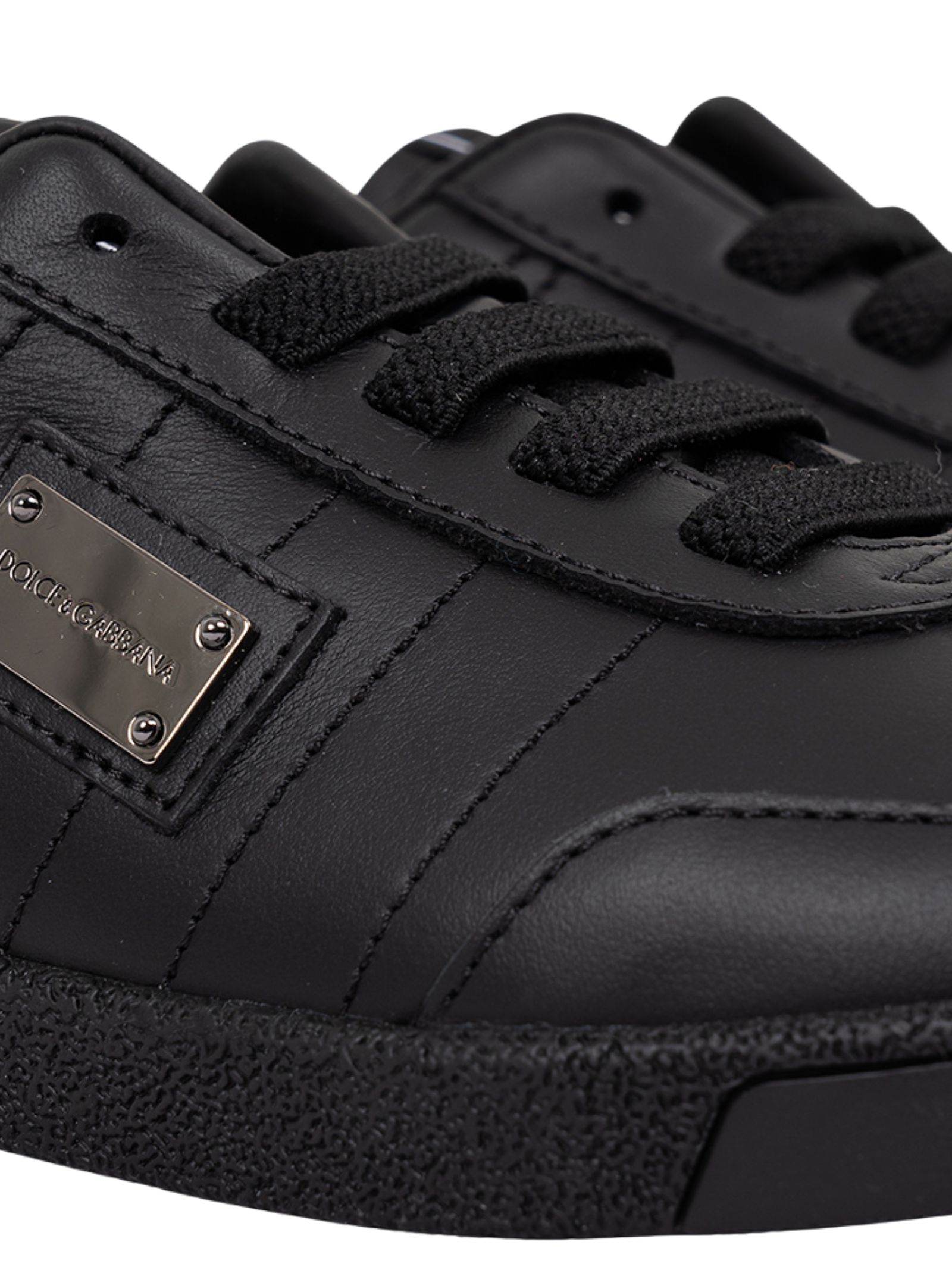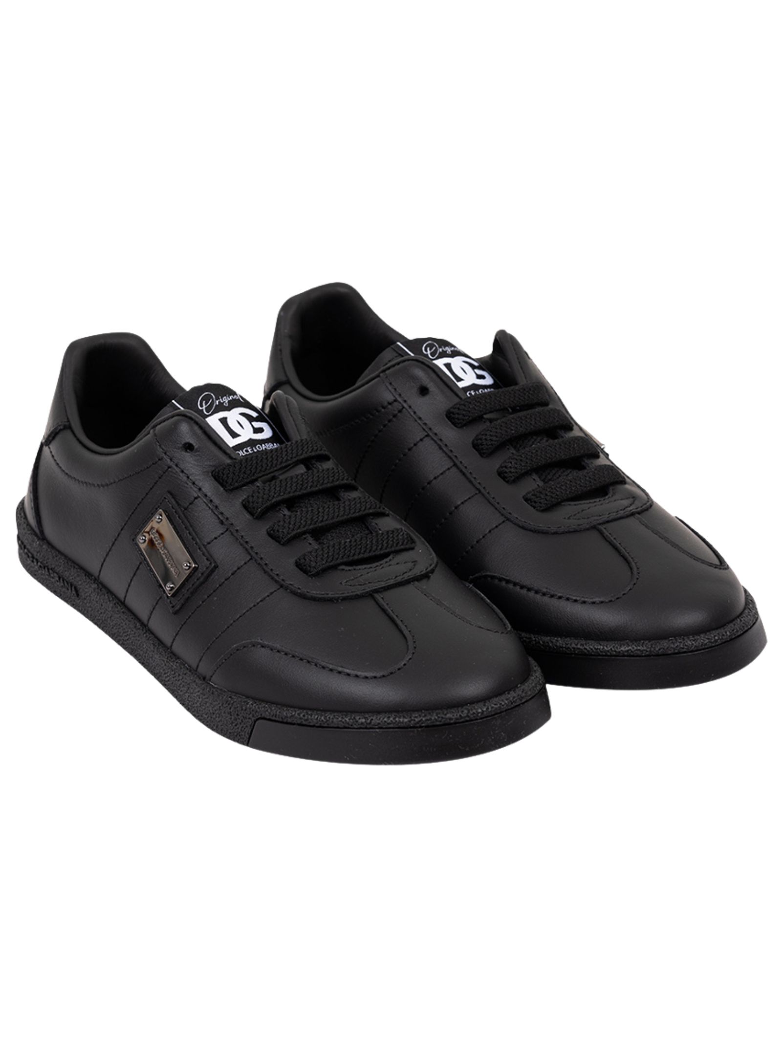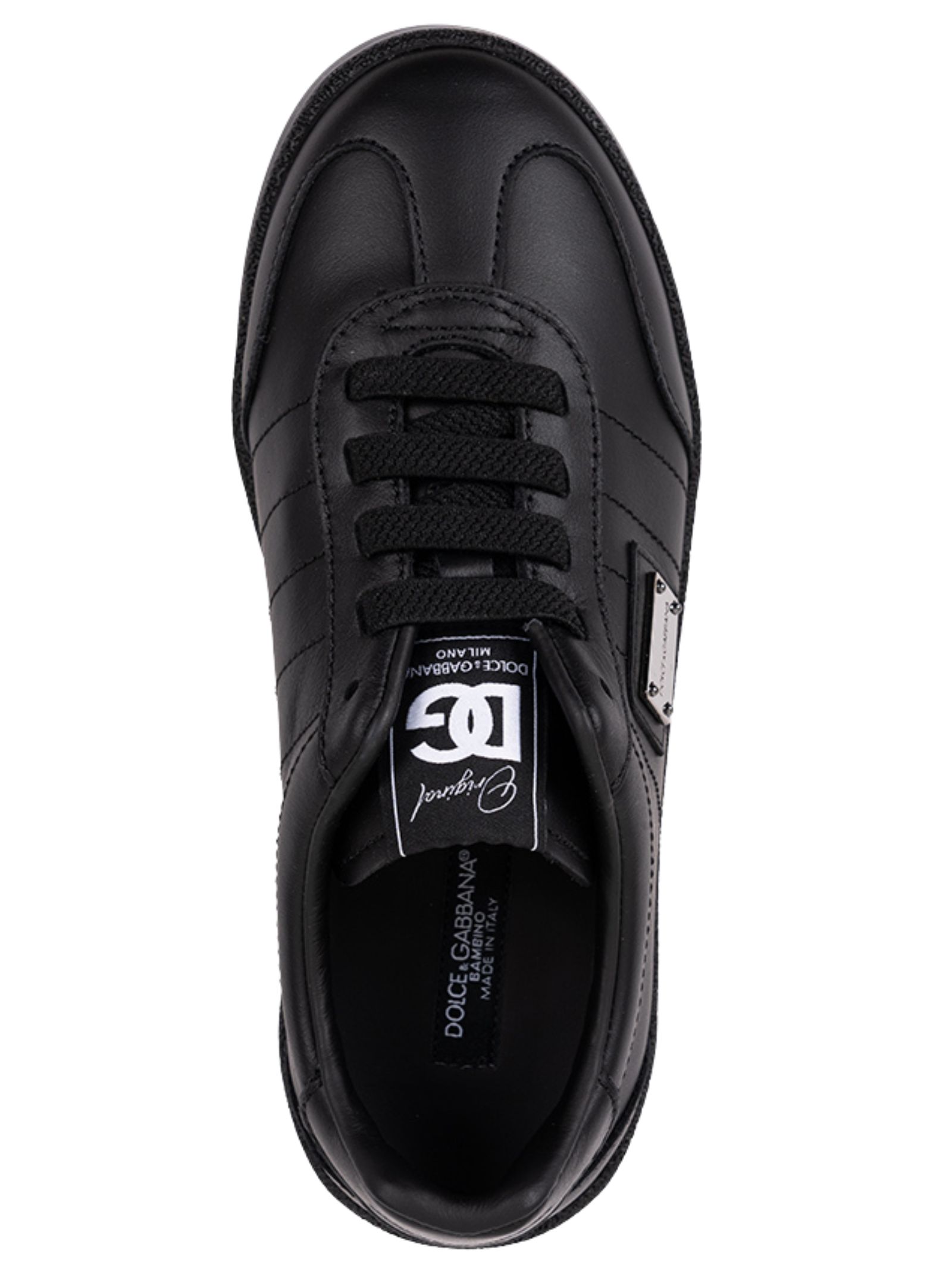 Dolce & Gabbana Kids' black smooth leather shoes with a round toe, lace-up front, silver-tone metal logo plaque on the side, logo patch on the tongue, and rubber sole. Lining: 100% calfskin. Sole: 100% rubber. Made in Italy.