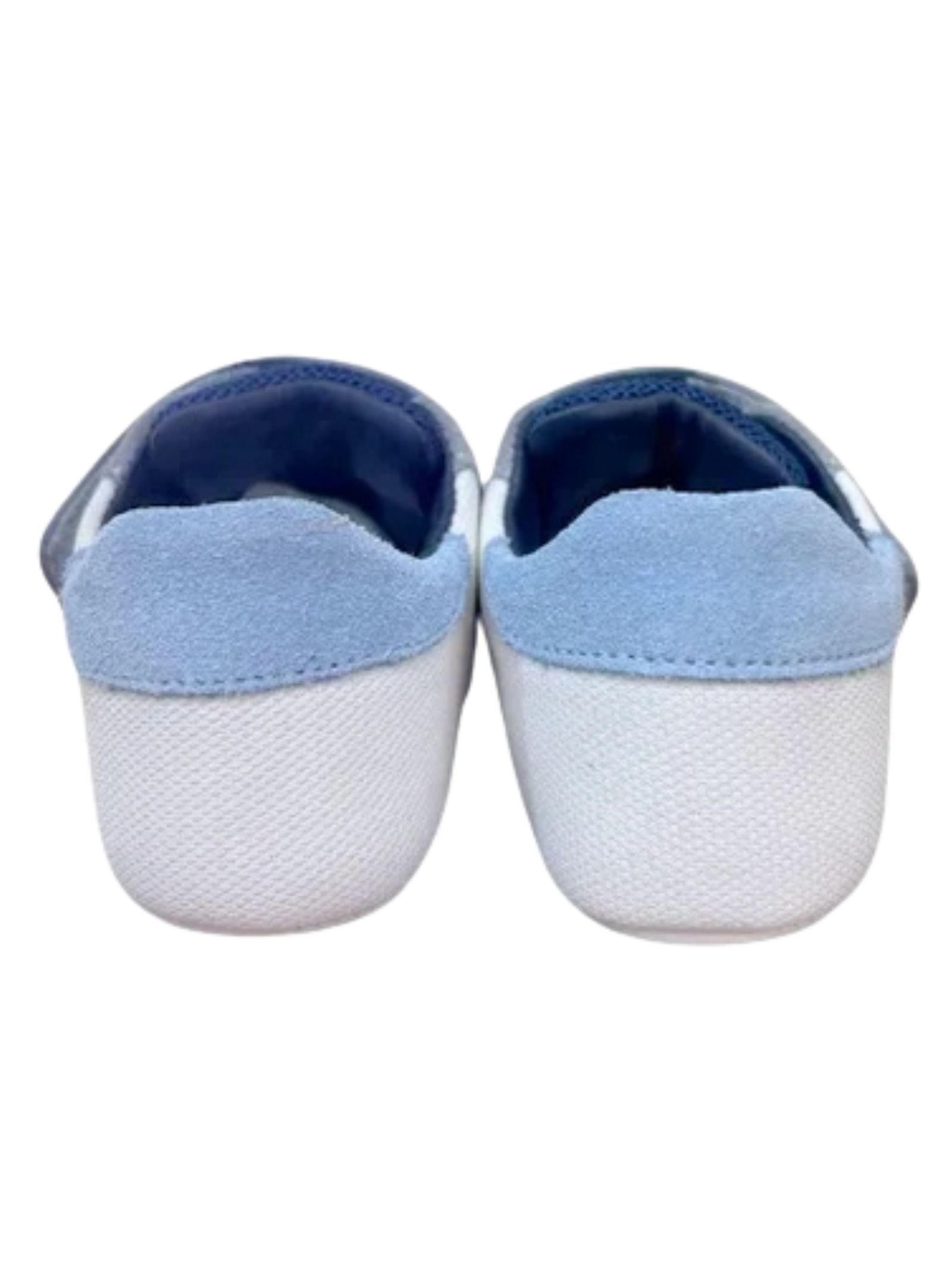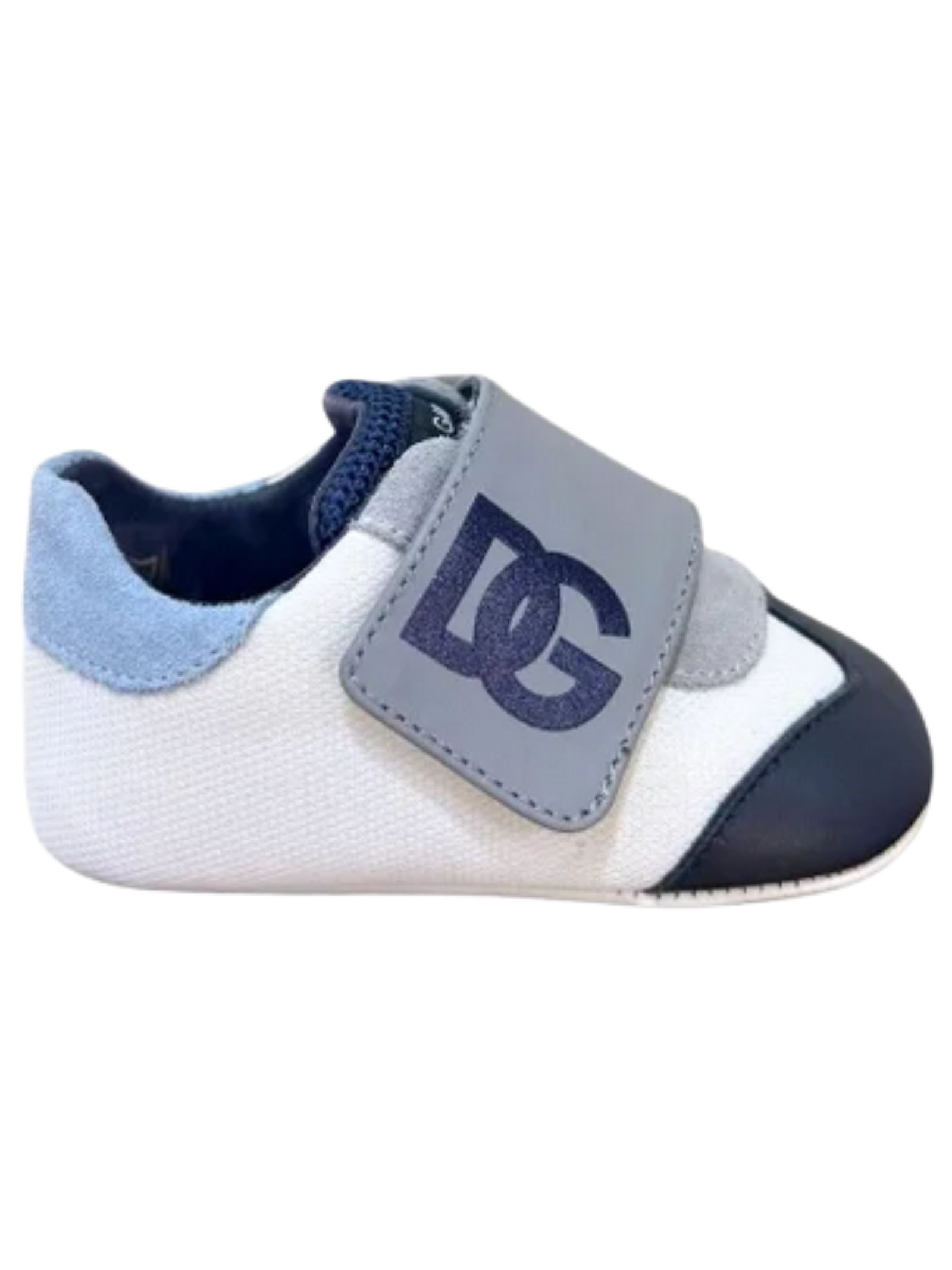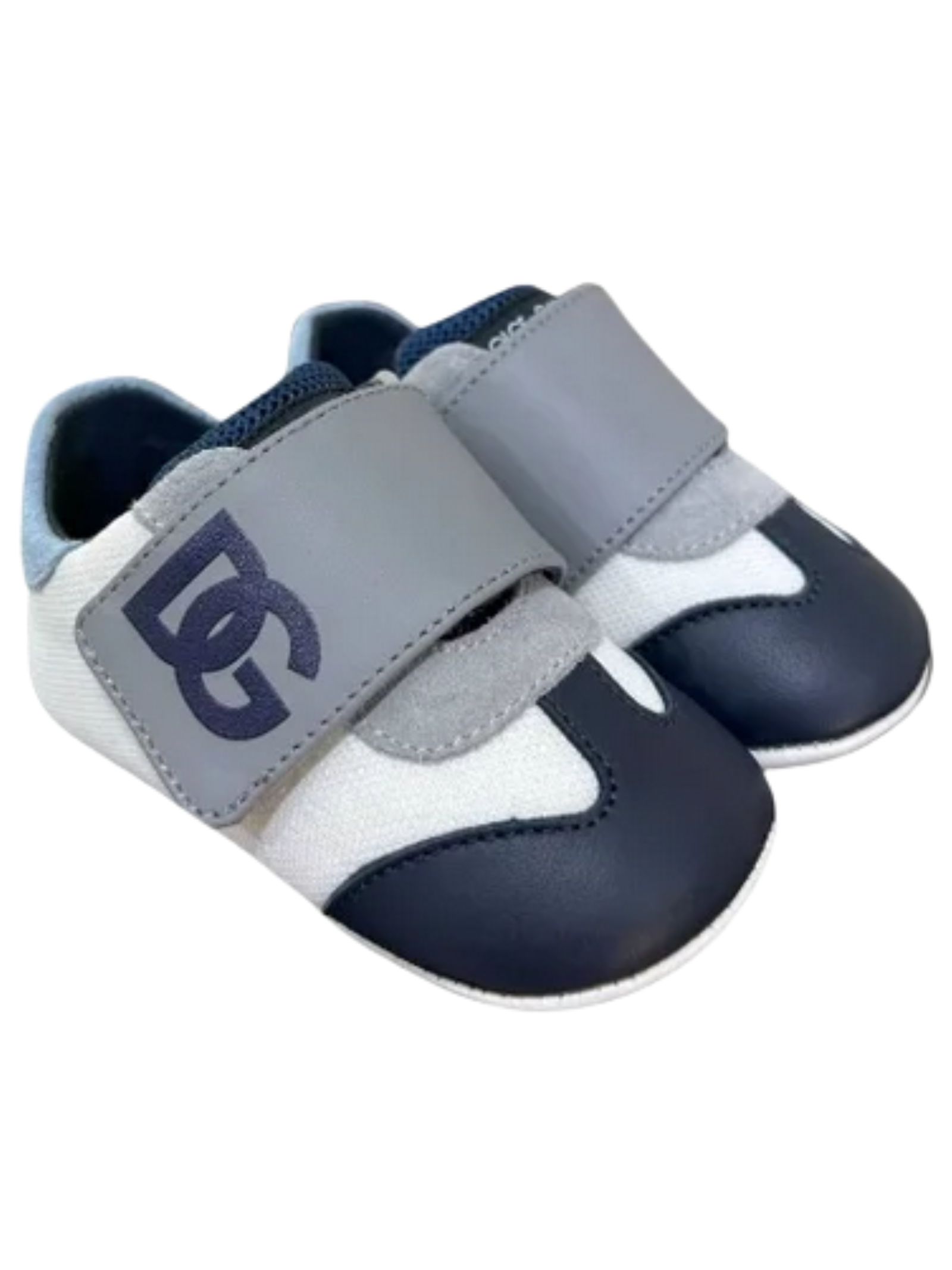 Dolce & Gabbana Kids blue pre-walker shoes with suede inserts, smooth leather, round toe, Velcro closure, and embossed logo. Made in Italy.